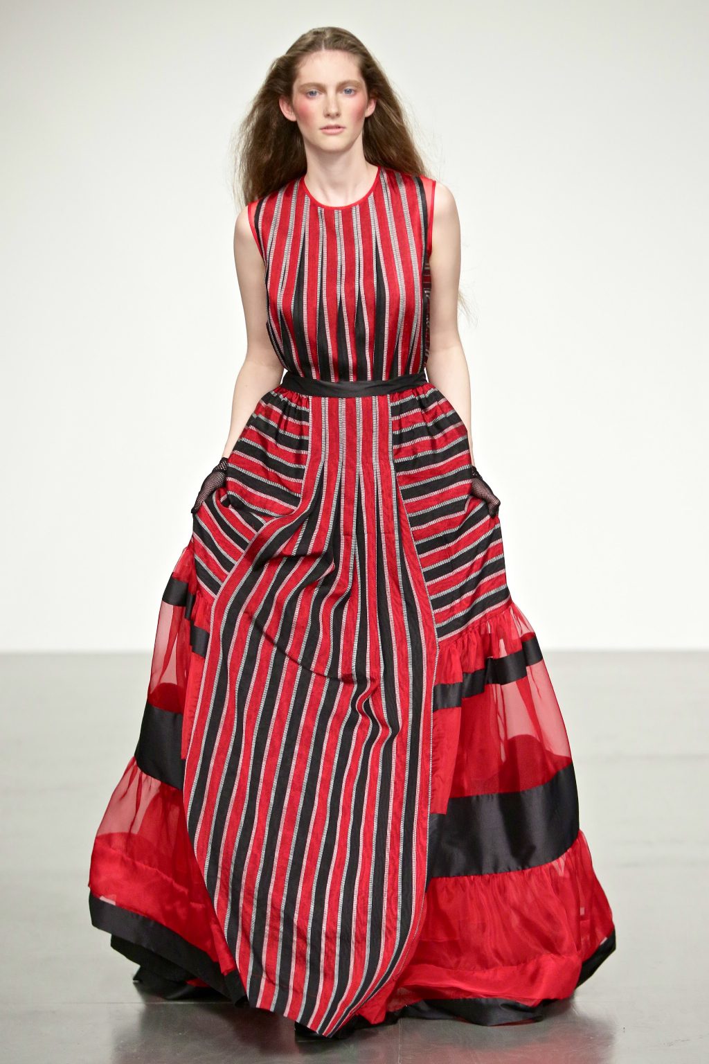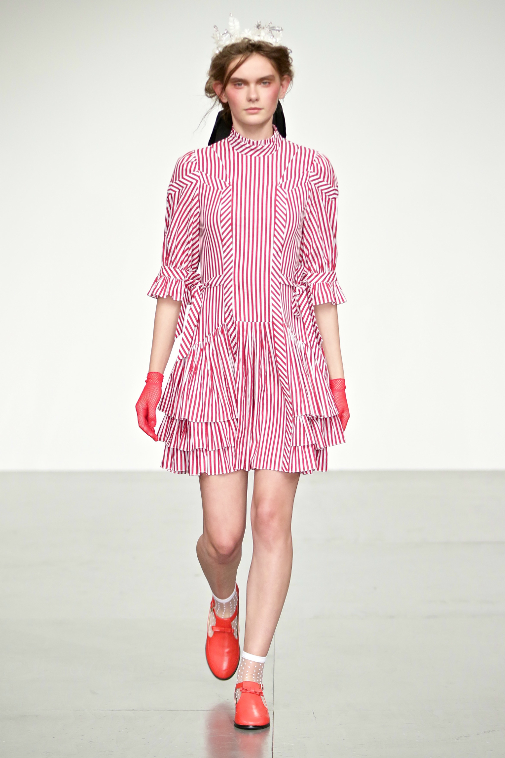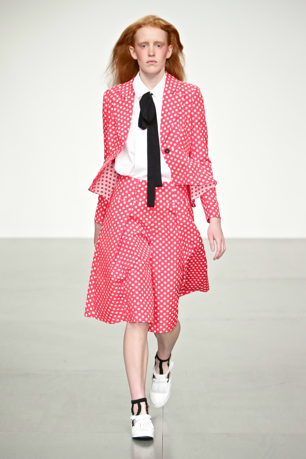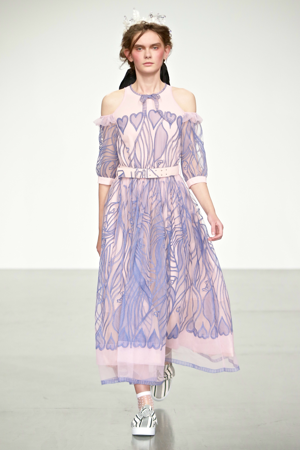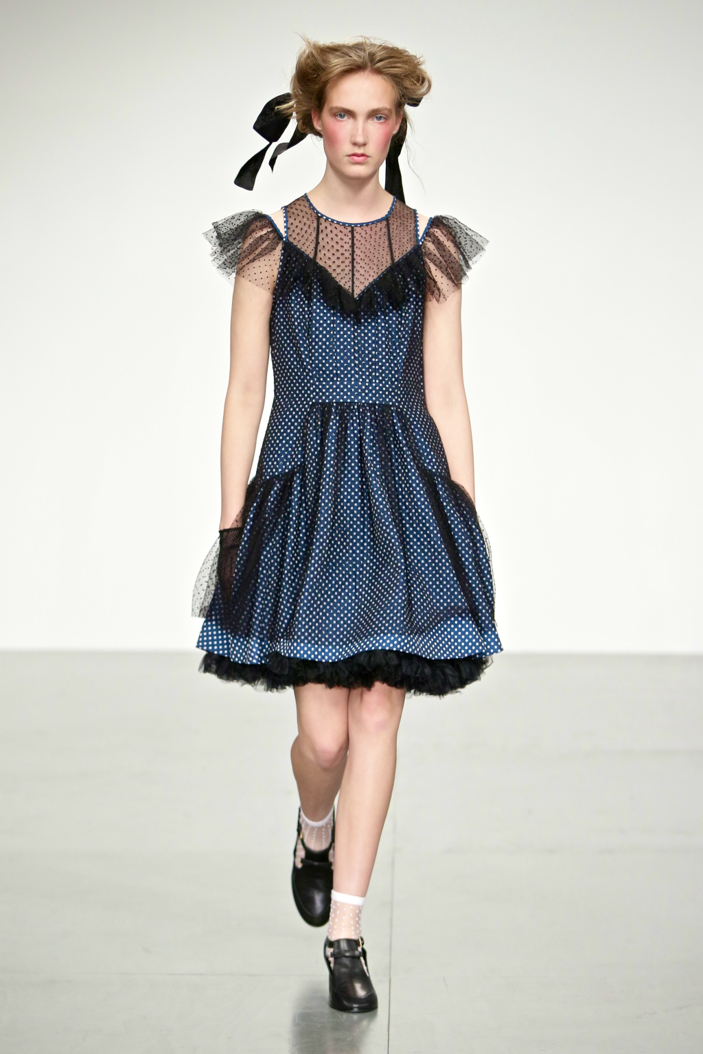 Stark bold patterns of polka dots and stripes sit alongside flowing ruffled skirts and delicate heart-shaped overlays on mesh and tulle. Feminine pussy-bow collars and ribbons are brought into the modern day with sporty slip-on sneakers and bomber style silhouettes. The Victoriana influence is strong throughout the collection, which again references the time period of Lady Musfik’s life.