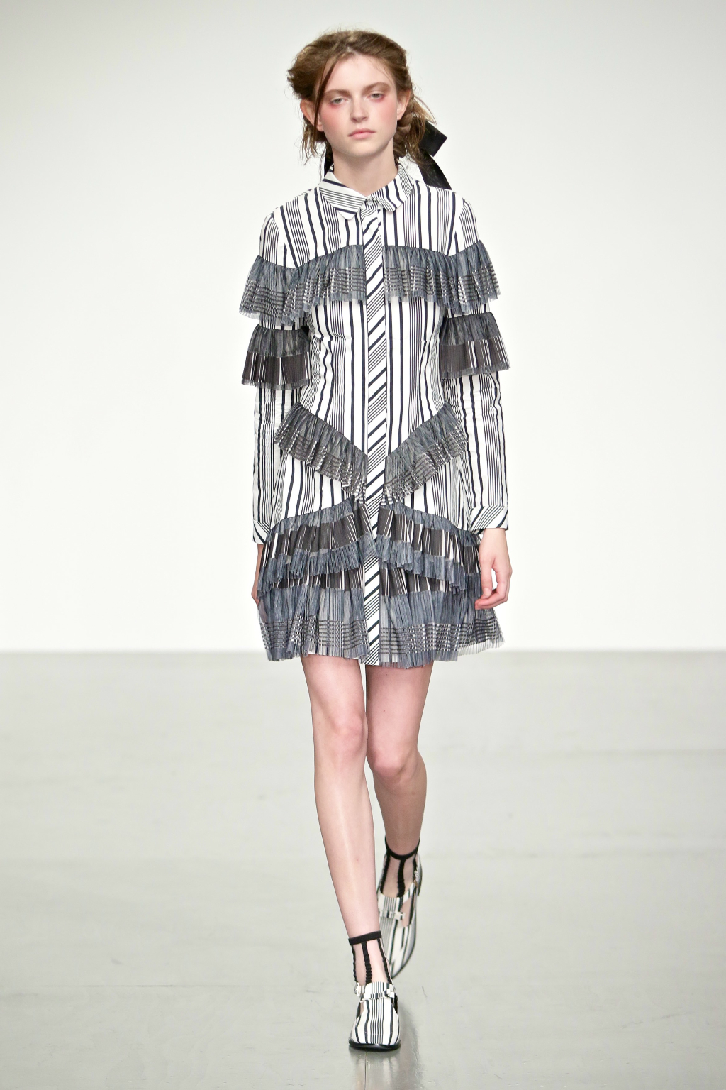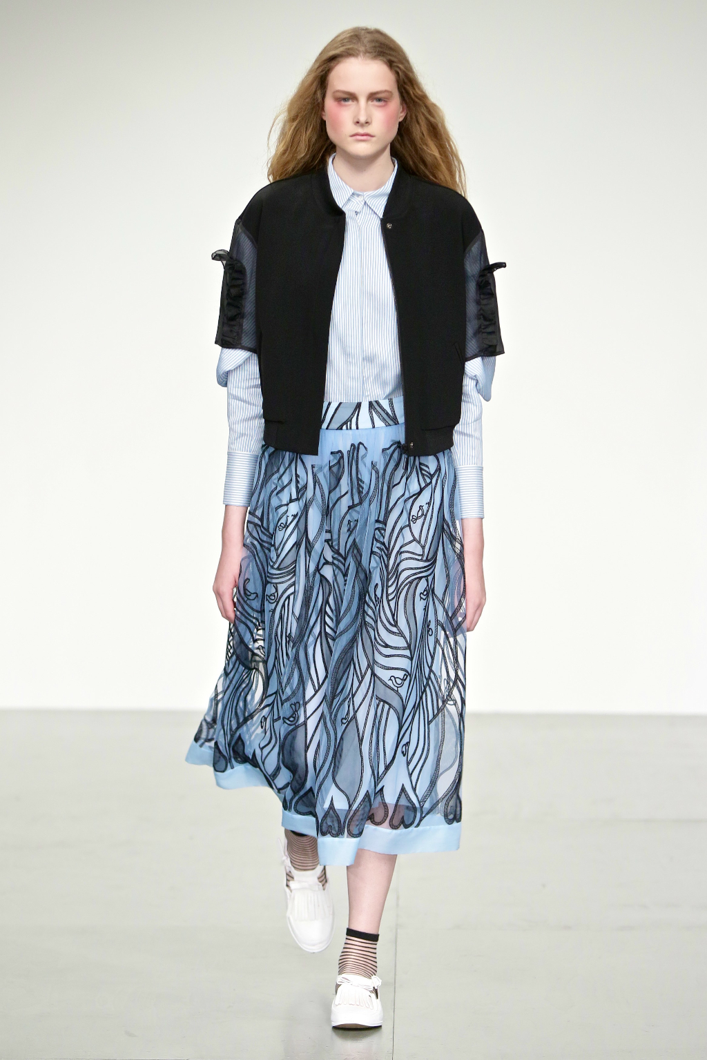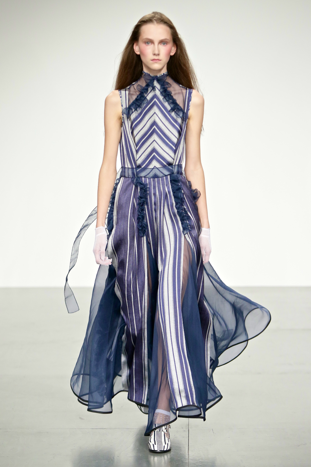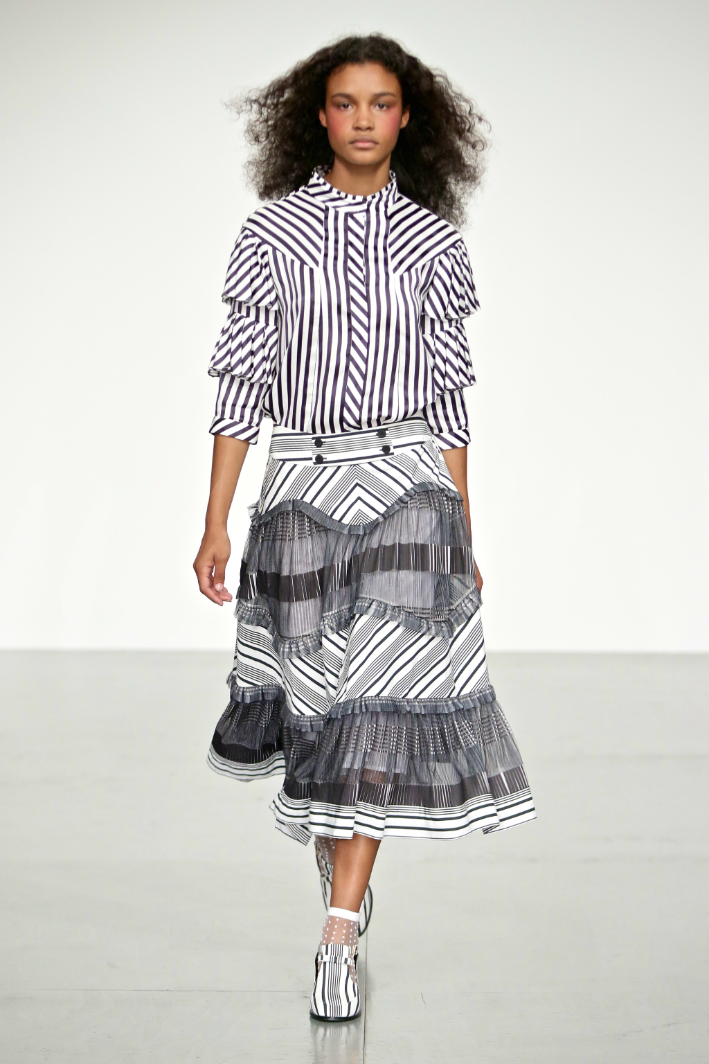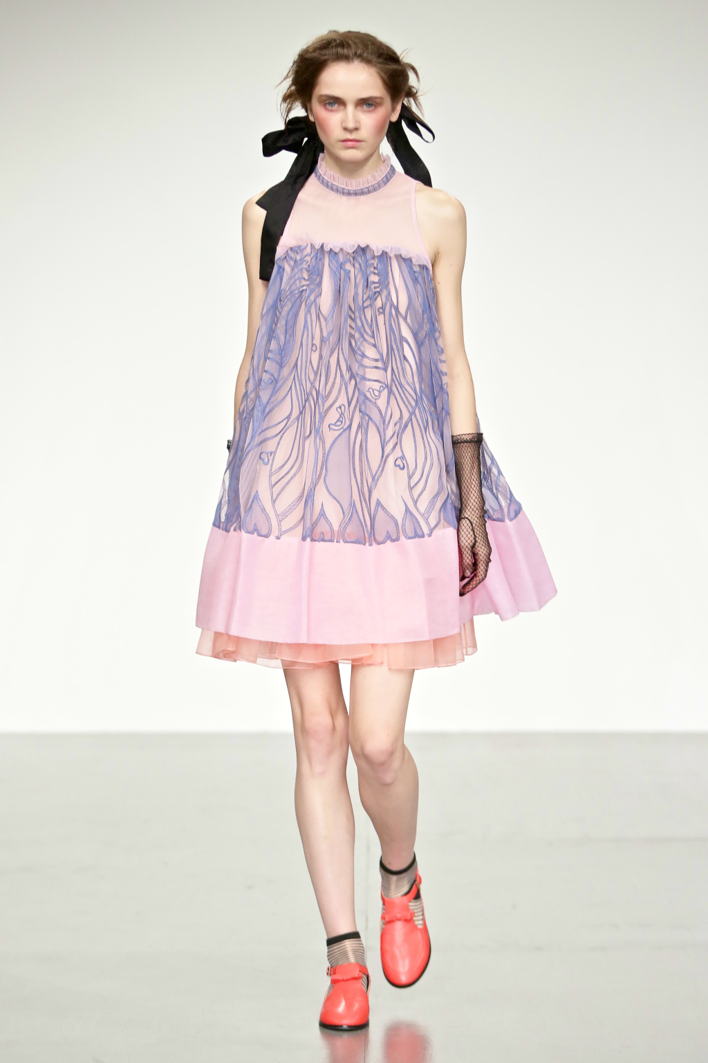Stark bold patterns of polka dots and stripes sit alongside flowing ruffled skirts and delicate heart-shaped overlays on mesh and tulle. Feminine pussy-bow collars and ribbons are brought into the modern day with sporty slip-on sneakers and bomber style silhouettes. The Victoriana influence is strong throughout the collection, which again references the time period of Lady Musfik’s life.