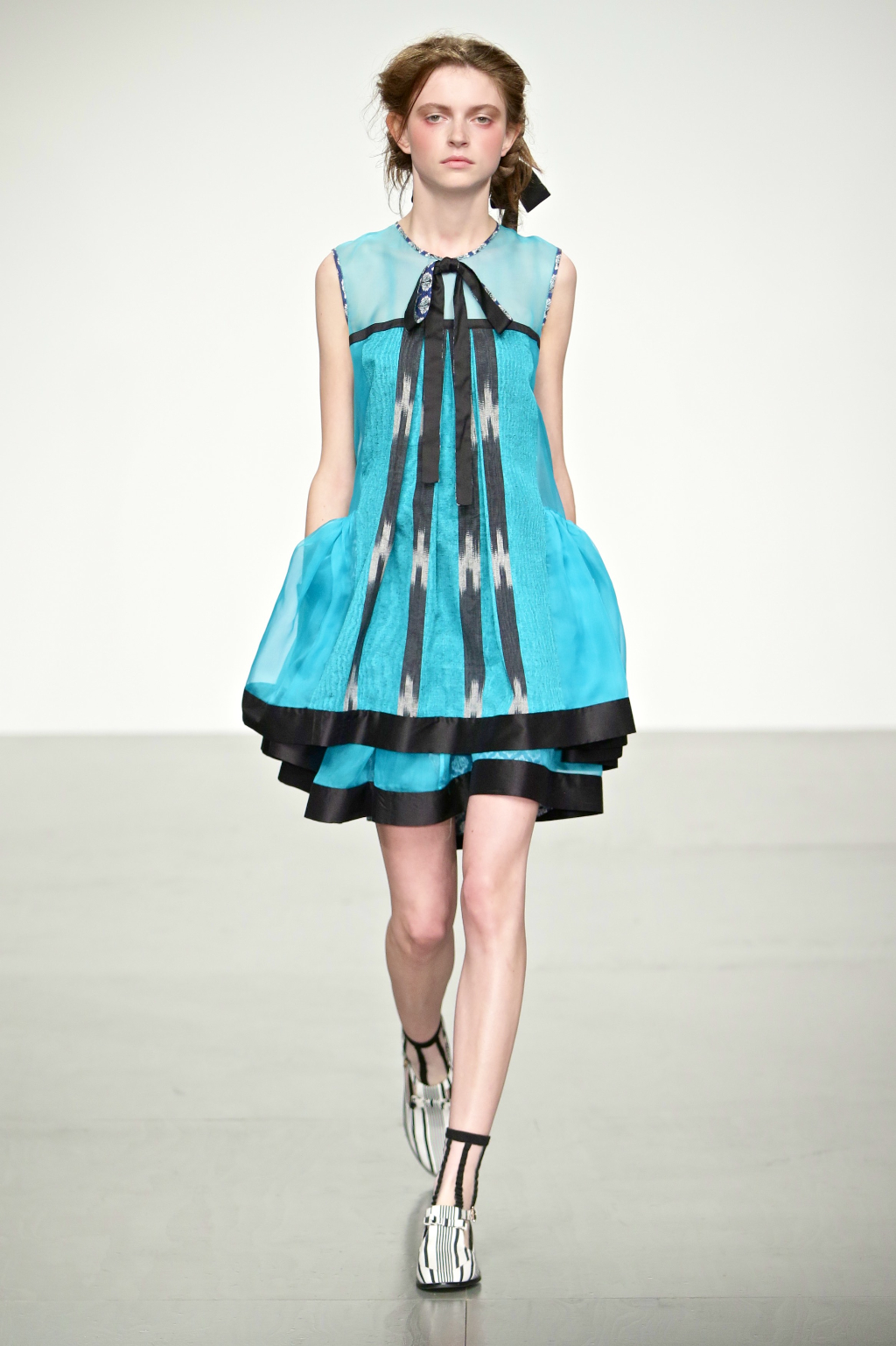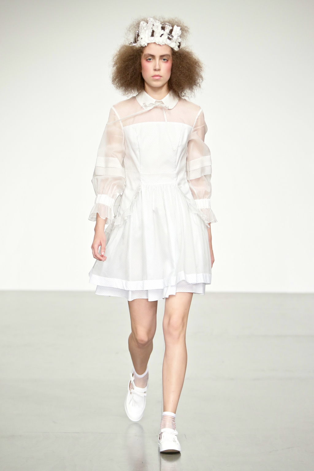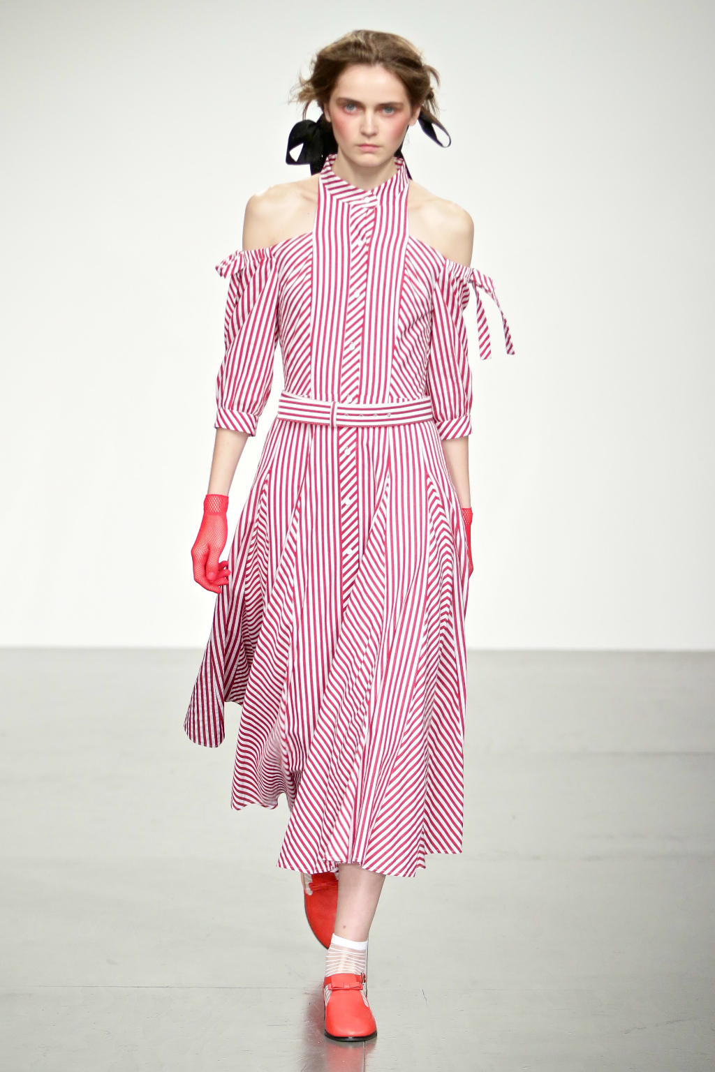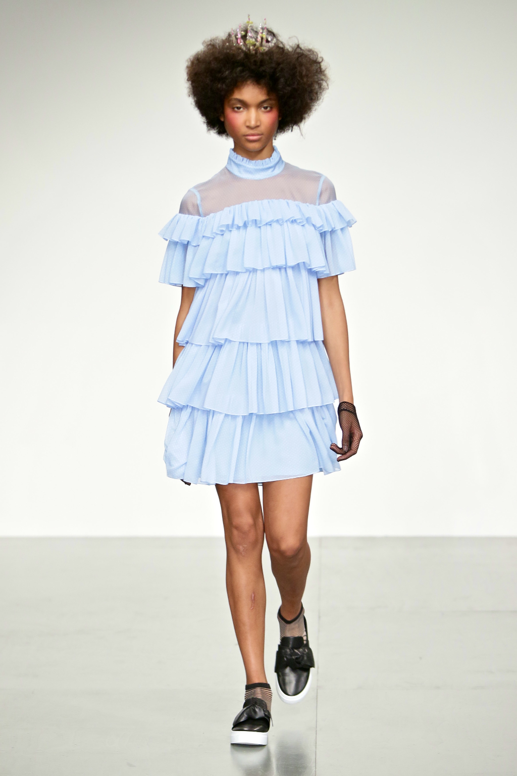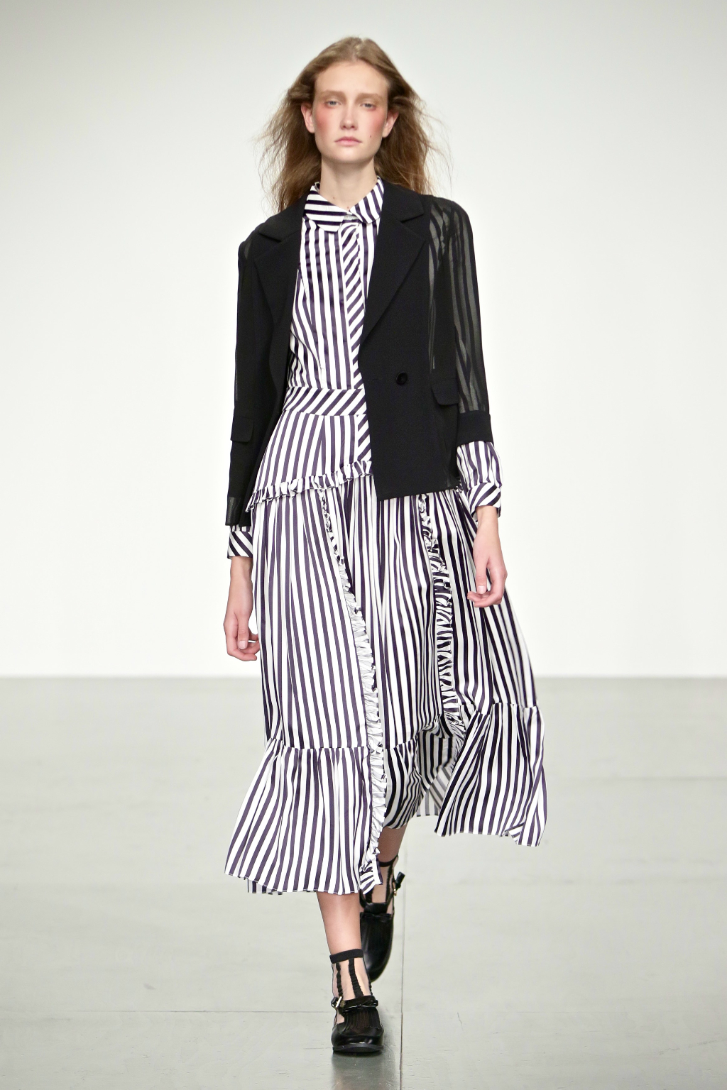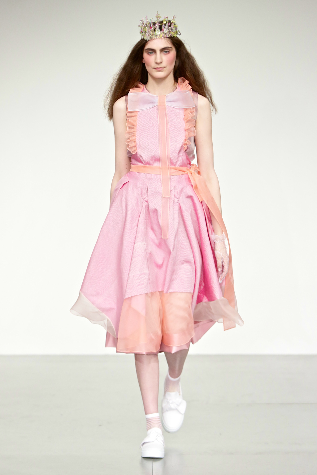 Stark bold patterns of polka dots and stripes sit alongside flowing ruffled skirts and delicate heart-shaped overlays on mesh and tulle. Feminine pussy-bow collars and ribbons are brought into the modern day with sporty slip-on sneakers and bomber style silhouettes. The Victoriana influence is strong throughout the collection, which again references the time period of Lady Musfik’s life.