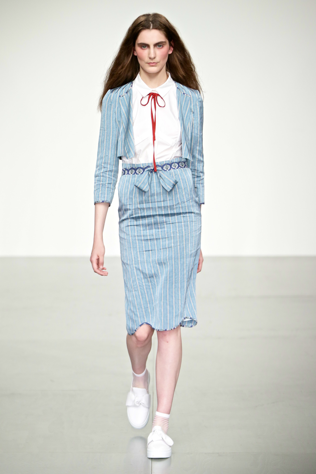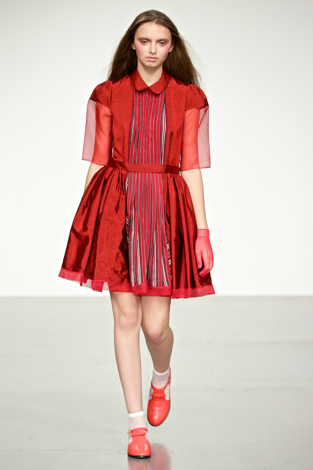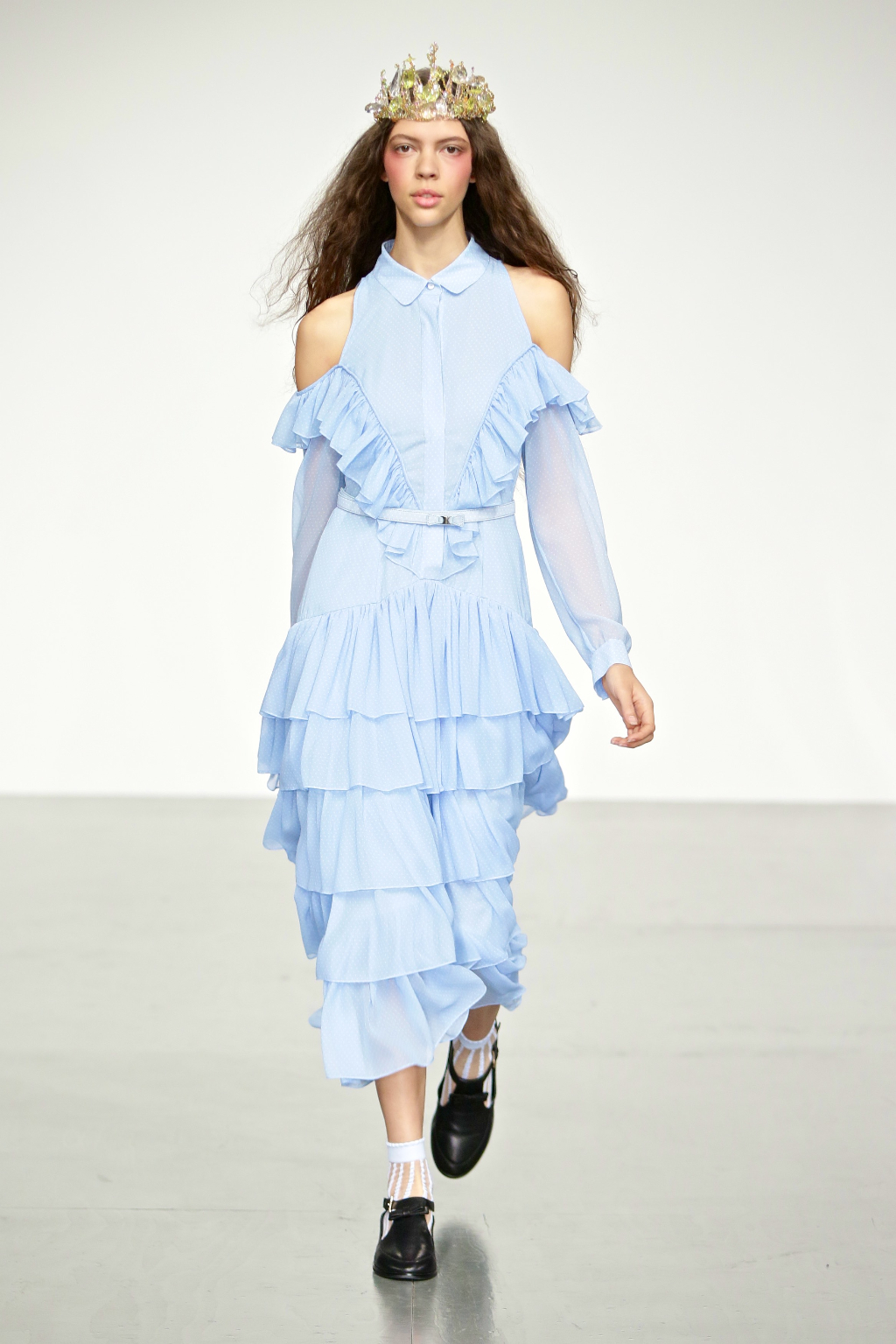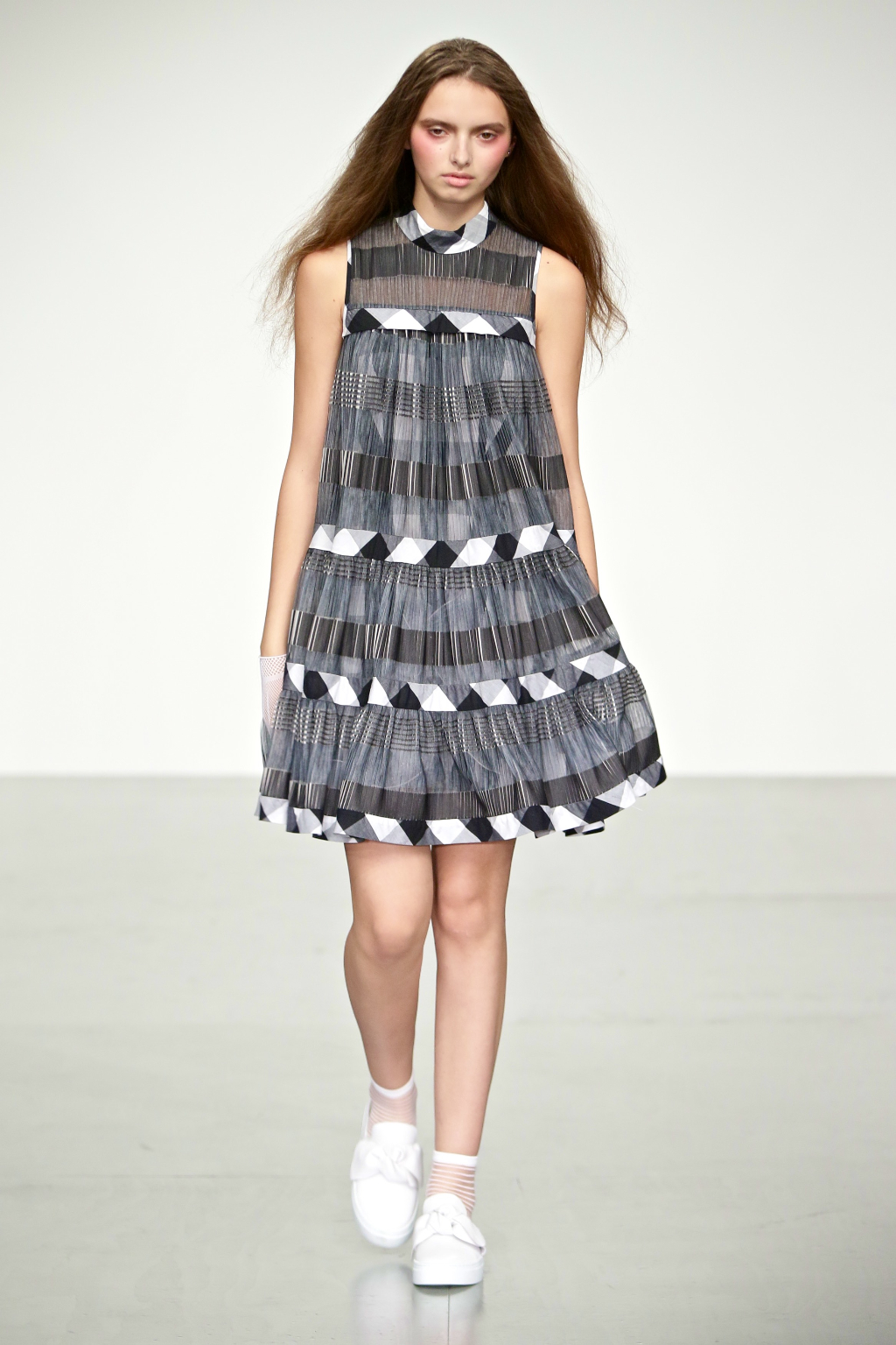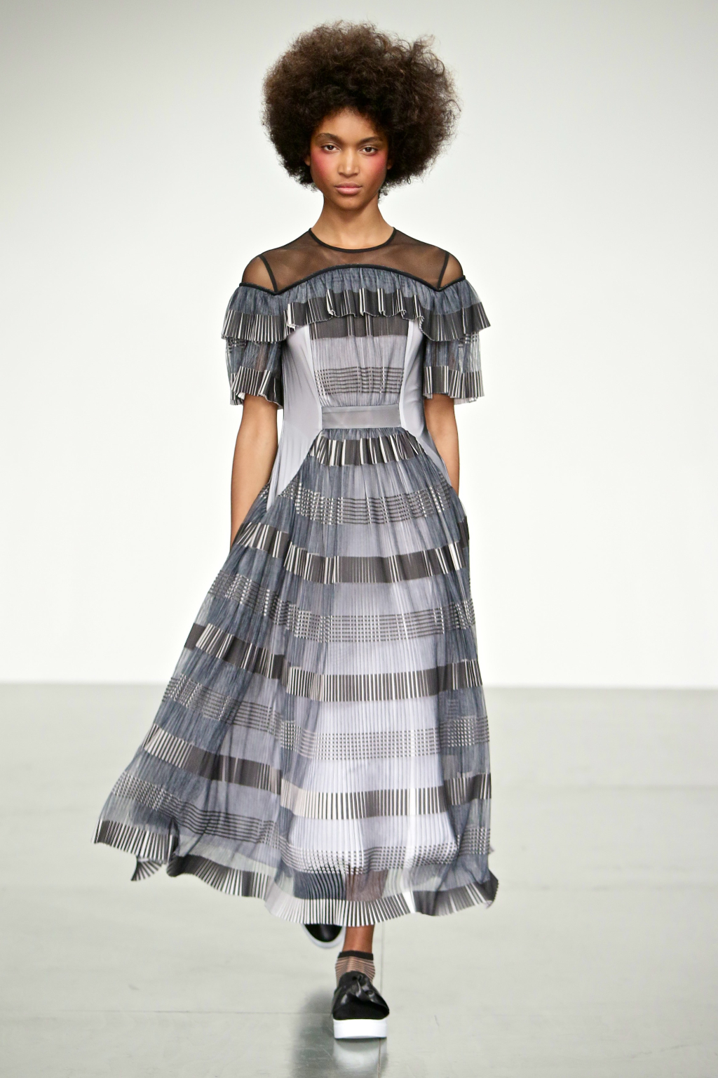 Stark bold patterns of polka dots and stripes sit alongside flowing ruffled skirts and delicate heart-shaped overlays on mesh and tulle. Feminine pussy-bow collars and ribbons are brought into the modern day with sporty slip-on sneakers and bomber style silhouettes. The Victoriana influence is strong throughout the collection, which again references the time period of Lady Musfik’s life.