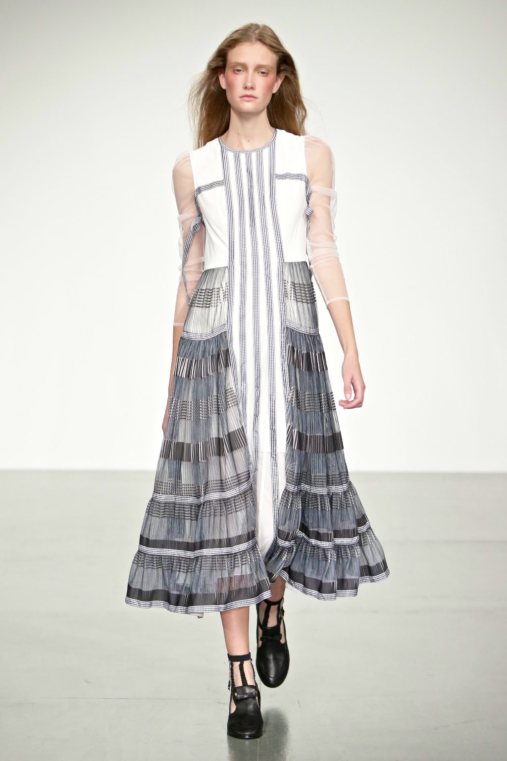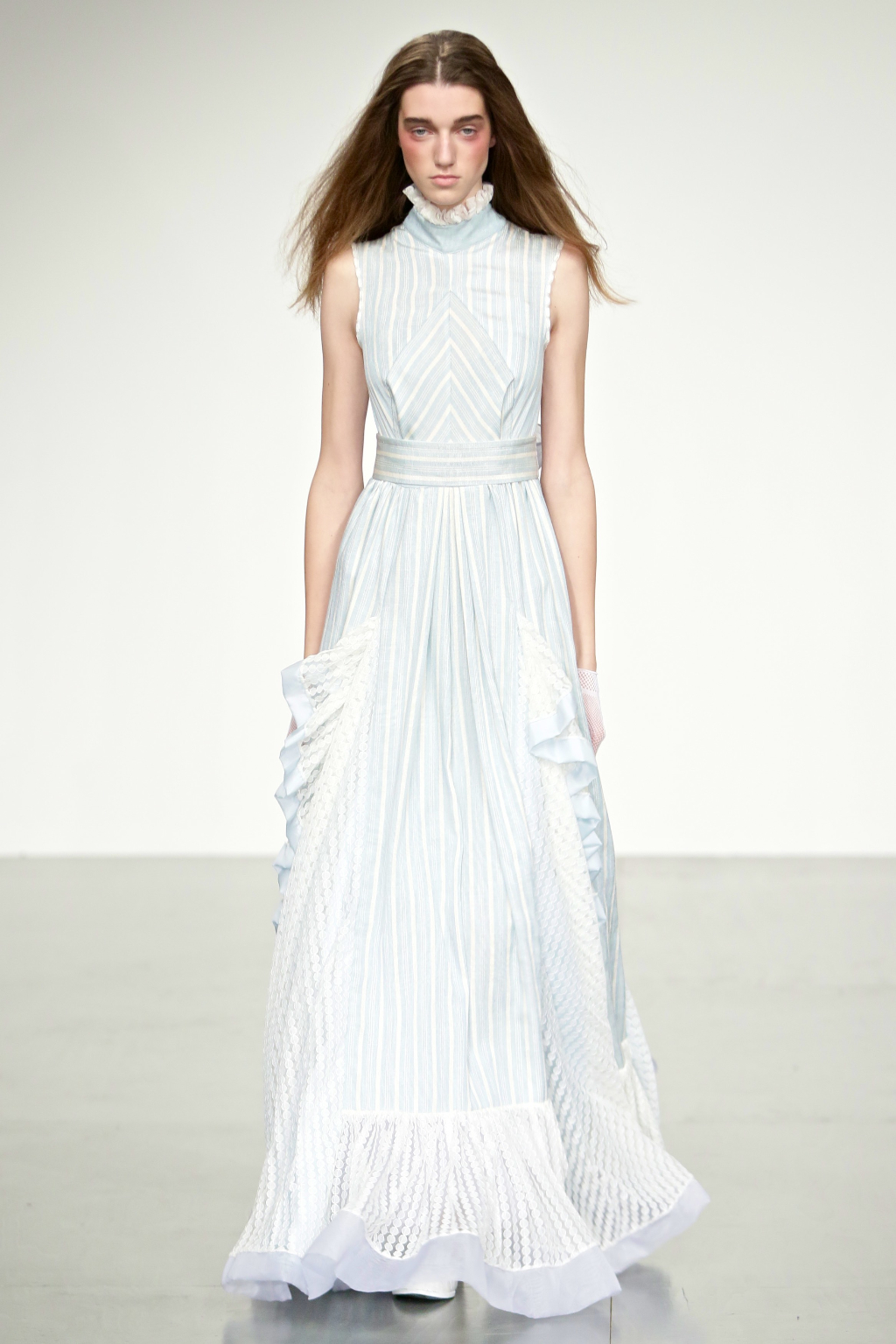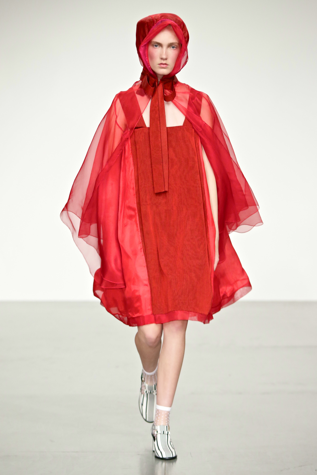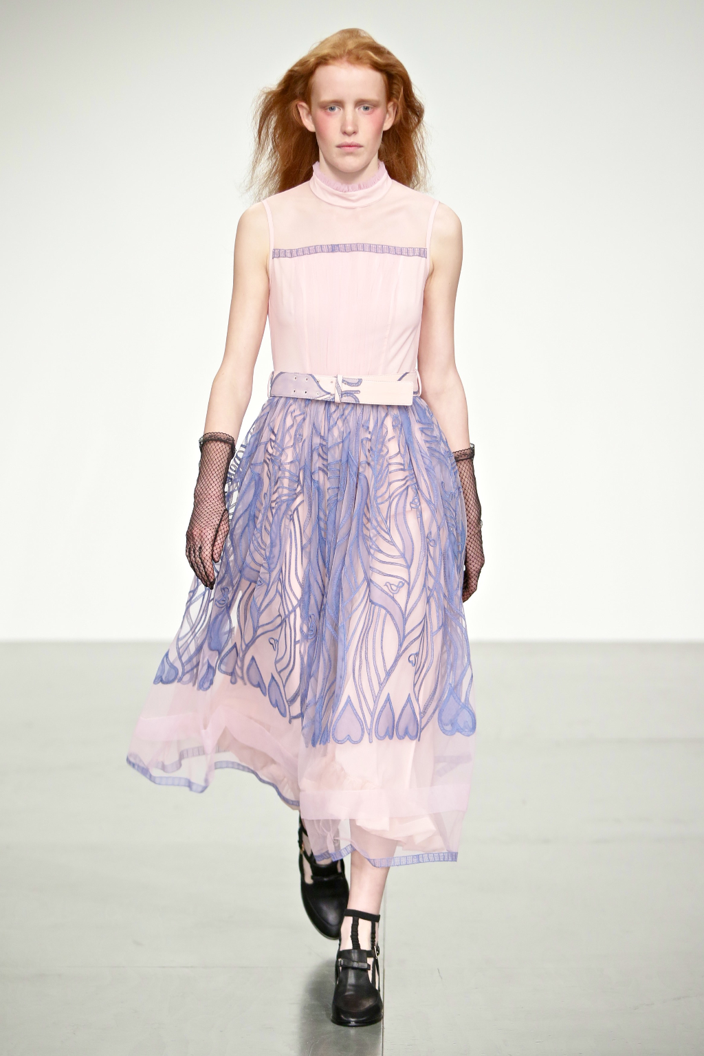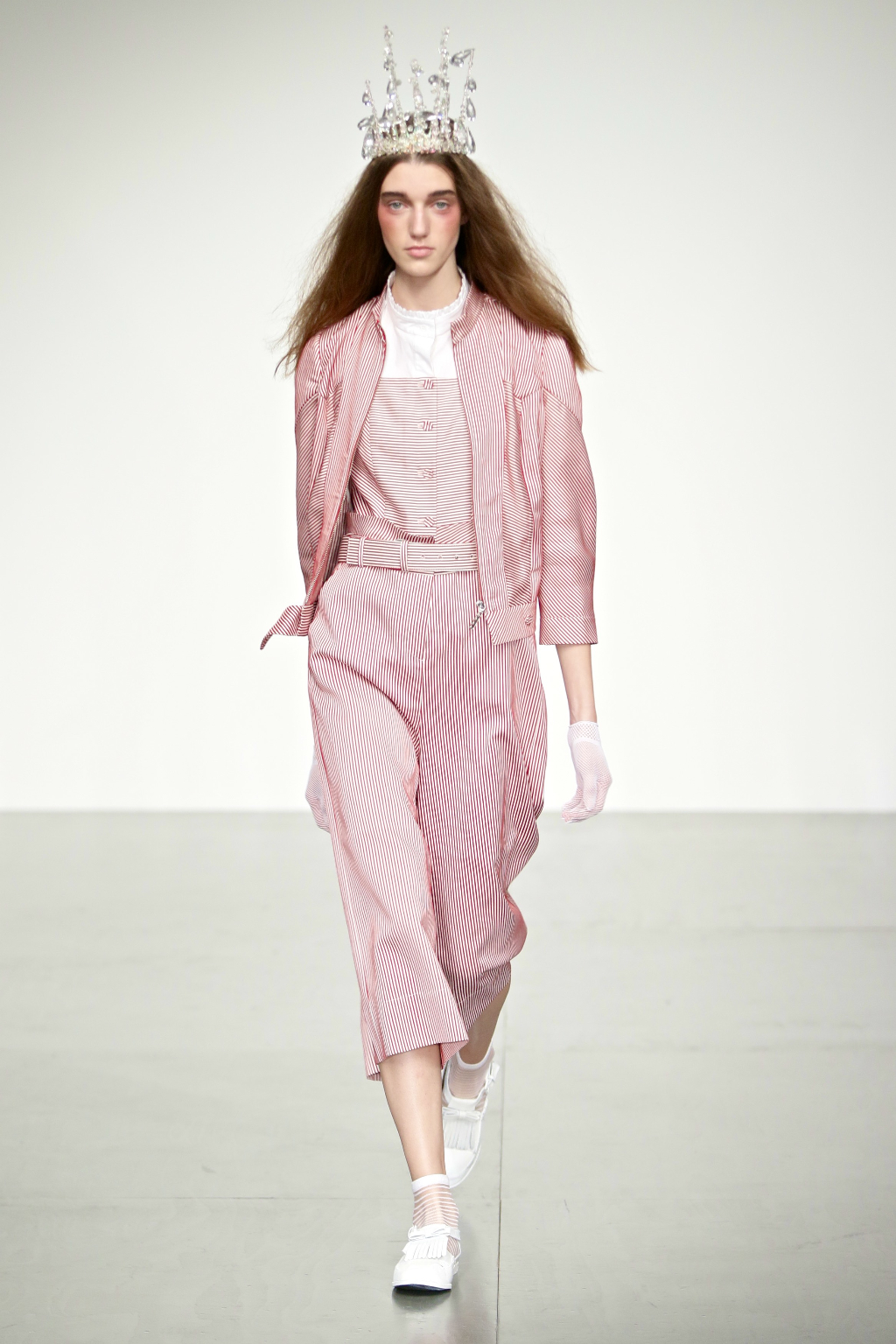 Stark bold patterns of polka dots and stripes sit alongside flowing ruffled skirts and delicate heart-shaped overlays on mesh and tulle. Feminine pussy-bow collars and ribbons are brought into the modern day with sporty slip-on sneakers and bomber style silhouettes. The Victoriana influence is strong throughout the collection, which again references the time period of Lady Musfik’s life.