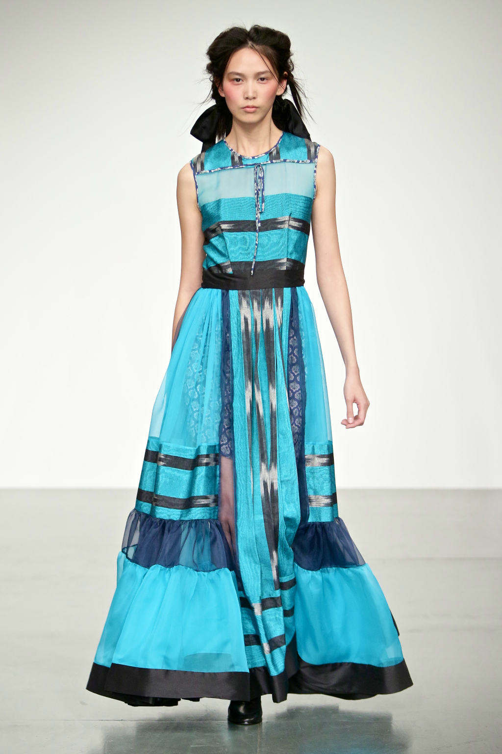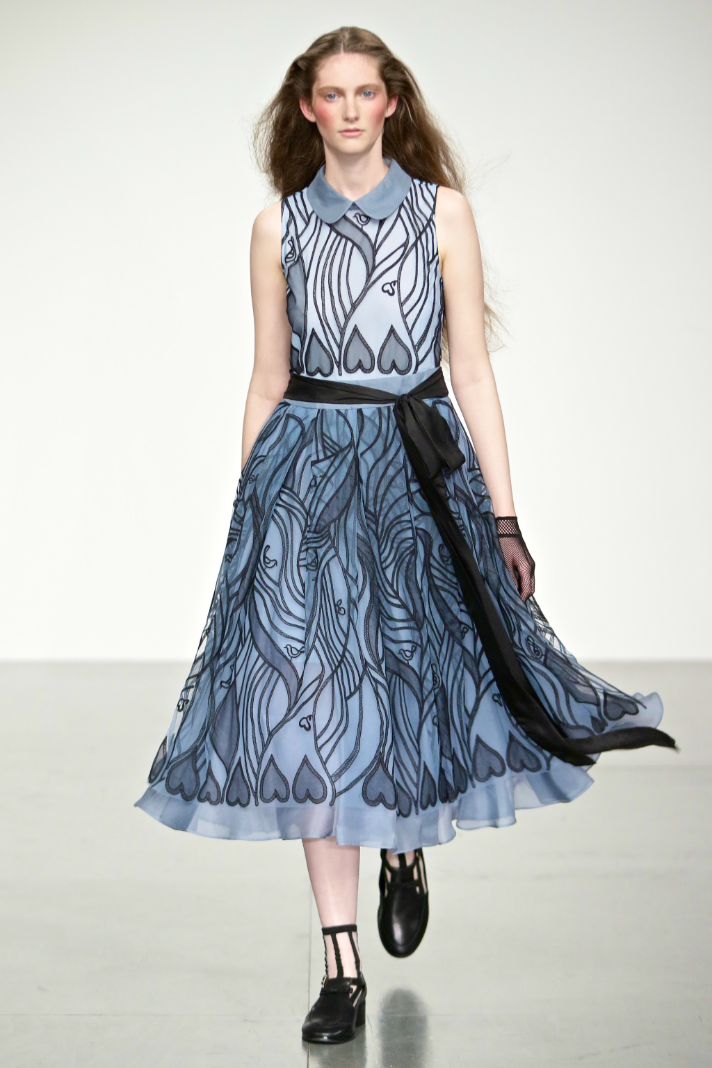The outstanding piece of the show was the dusty blue sleeveless collared dress, with a full skirt and black patterned organza fabric featuring delicate hearts and swirls, all finished off with a large black silk ribbon. The silhouette was simple, but the contrast in colours and materials was eye-catching and beautiful. A rich colour palette of red, teal, dusty blue, maroon and monochrome reflect affluent beginnings of an influential noblewoman with humble aspirations.