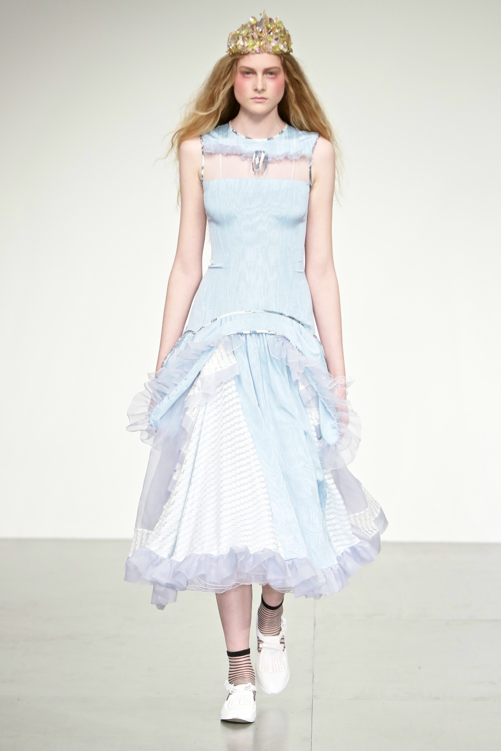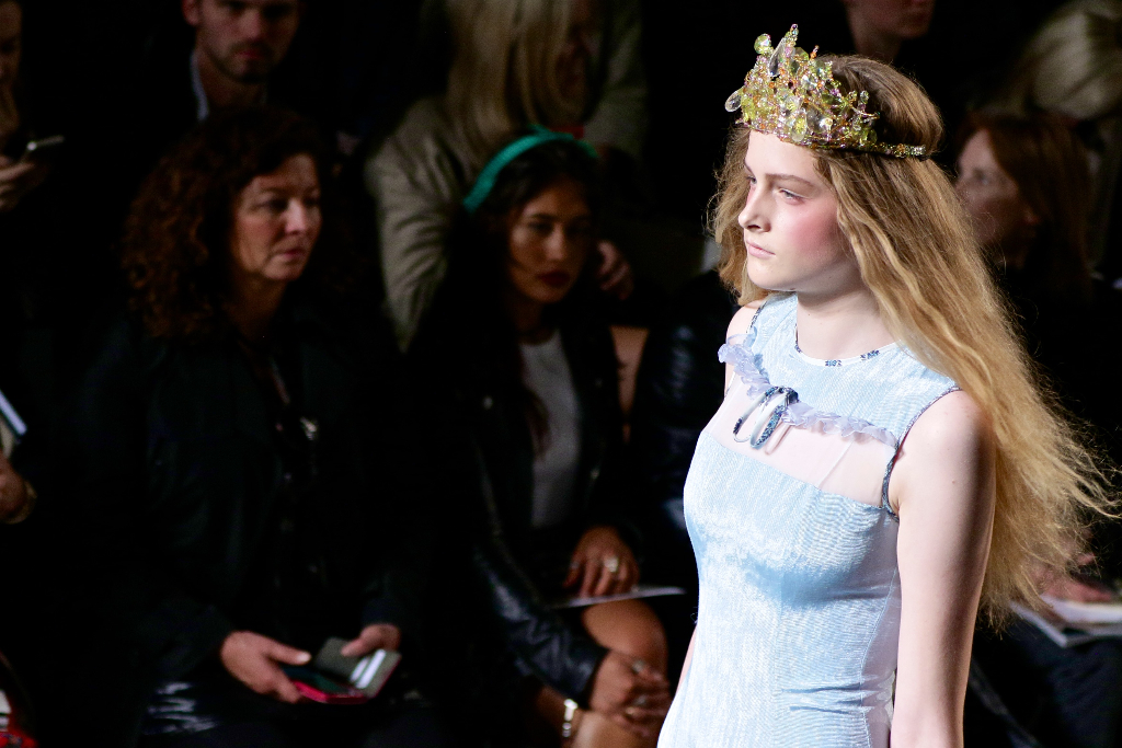 Intricate beaded crowns and luxurious tulle fabrics nod to Aksu’s regal inspiration for this collection; Lady Mihri Musfik, a Turkish noblewoman but also inspirational artist who gave up a life of affluence to pursue a creative dream. Her influence can also be seen via the appearance of ladylike gloves and “kutnu” (traditional Turkish) fabrics, which reflect her later life as an artist amongst the working class.