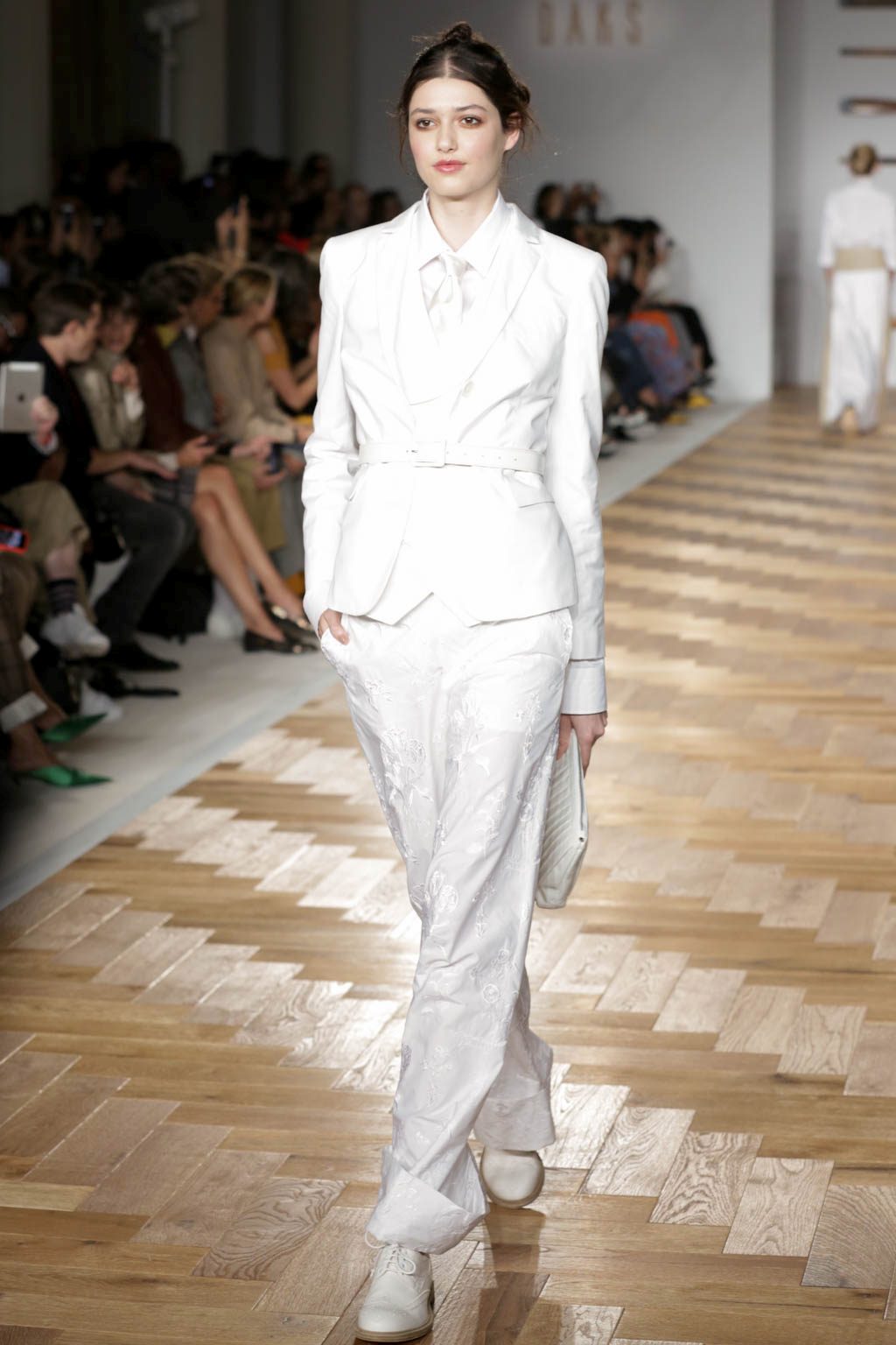 Minimalism was palpable in Daks SS18 show from the loose tailoring details on the back of wide-collar shirts and paper-bag trousers to the minimal colour palette of crisp whites, soft beiges, grey’s and hues of lilac fronted on silk-printed blouses. The effortless essence of the collection is paired with the relaxed messy hairstyles and the glowing skin, which maximises the summery spirit of the collection. Stripes were the vocal point of the show, with shadow stripes printed on ties tucked into high-waist trousers and vertical striped two-piece suits.