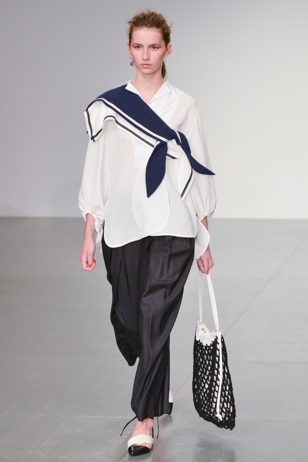 The colours were mostly in keeping with a maritime theme, made almost too explicit in one sailor-inspired piece, with many muted blue or grey fabrics, meant to be evocative of open space and ocean breezes. While departures from this theme usually meant black or forest green fabrics, there were some notably fluorescent orange and pink pieces, which perhaps clashed too much with the rest of the collection. A running theme throughout the collection were the long, trailing fabric ties, a feature recognisable from previous Choi designs.