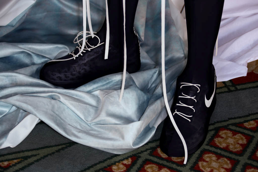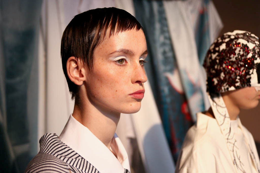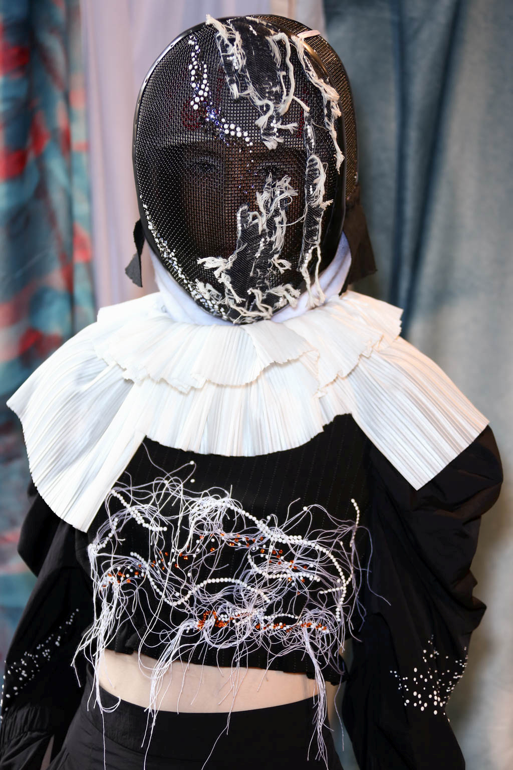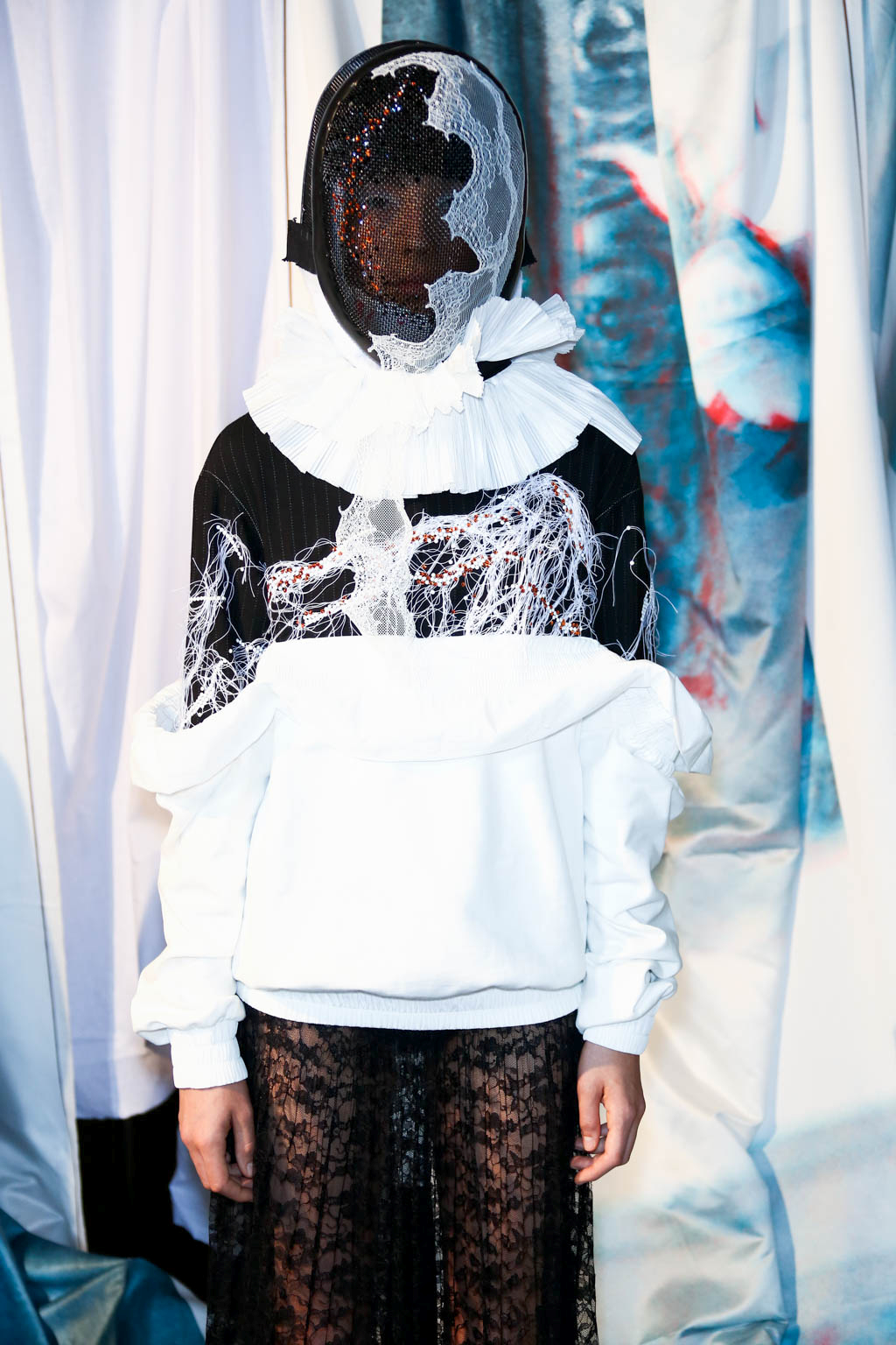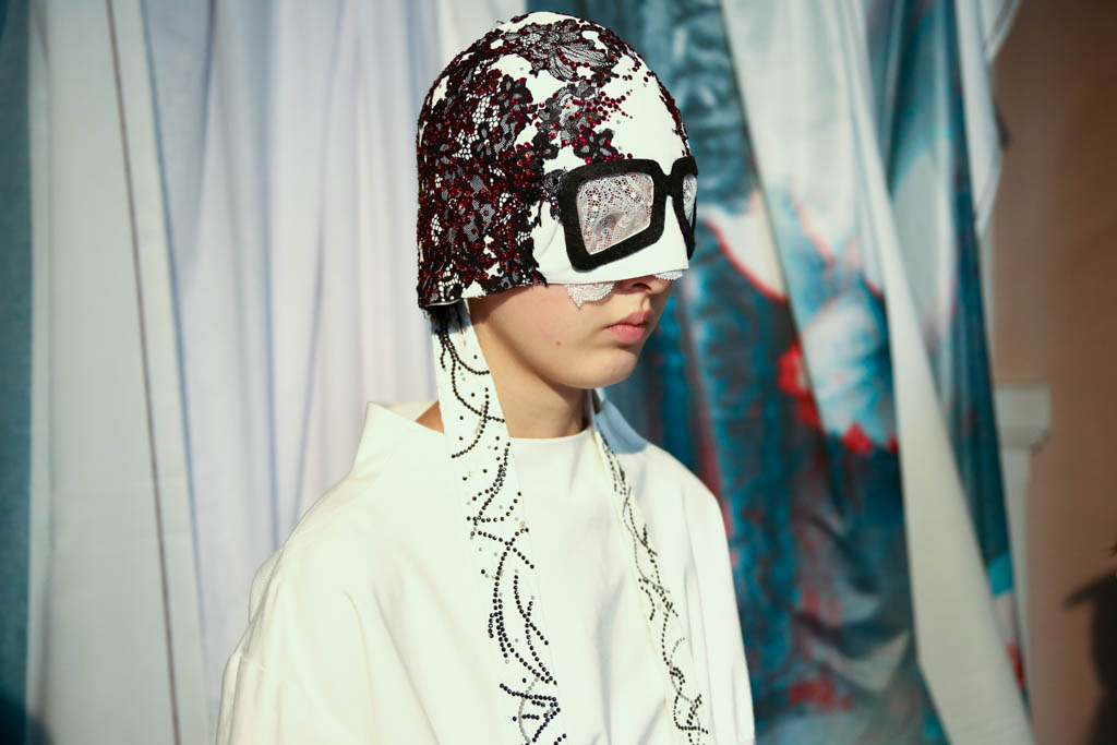 Swarovski crystals adorn Nike trainers – both official sponsors of the collection – stating “Fragile” and “Handle with Care”; perhaps an overt display of the human condition today and how we are all on the verge of fracturing. This is also seen through the use of fencing masks and superhero style headgear which hide the face within. The ultra-modern sports footwear opposes historical accents shown throughout all the looks. Models sport clean, white eyes and slicked back hair, providing a simple backdrop for the intricate ensembles.