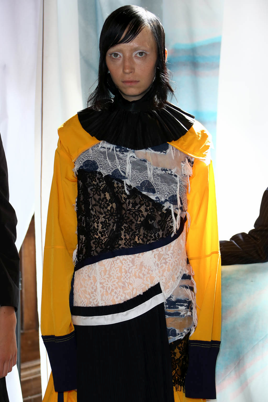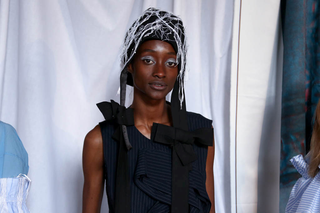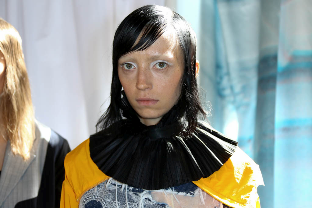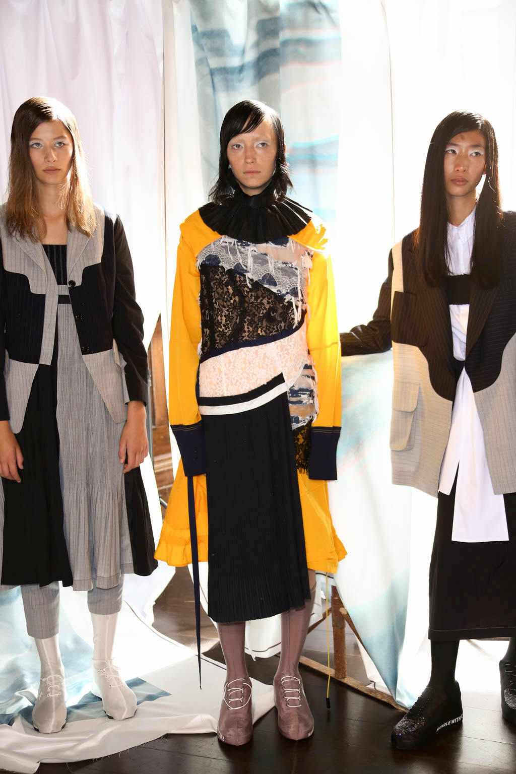 Mixed materials in various textures and colours are joined together creating a patchwork effect across the whole collection, presenting denim paired with lace and smart suit fabrics joined with bright yellow ruffles. Victoriana collars, bonnets and apron-like accents nod to a darker time for women, but are contrasted with blazer and pinstripe materials of a modern female aesthetic. Ruffles feature on almost all of the looks, showing it to be a key accent for this season. Delicate beading and thread work bring another textural dimension to monochromatic looks, bringing focus into an otherwise neutral element of the pieces.