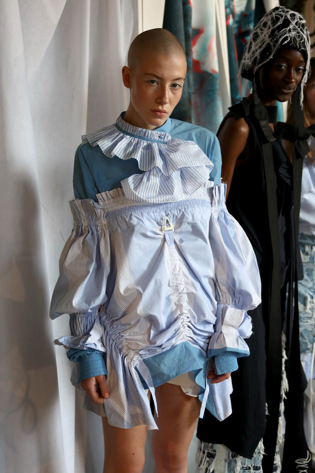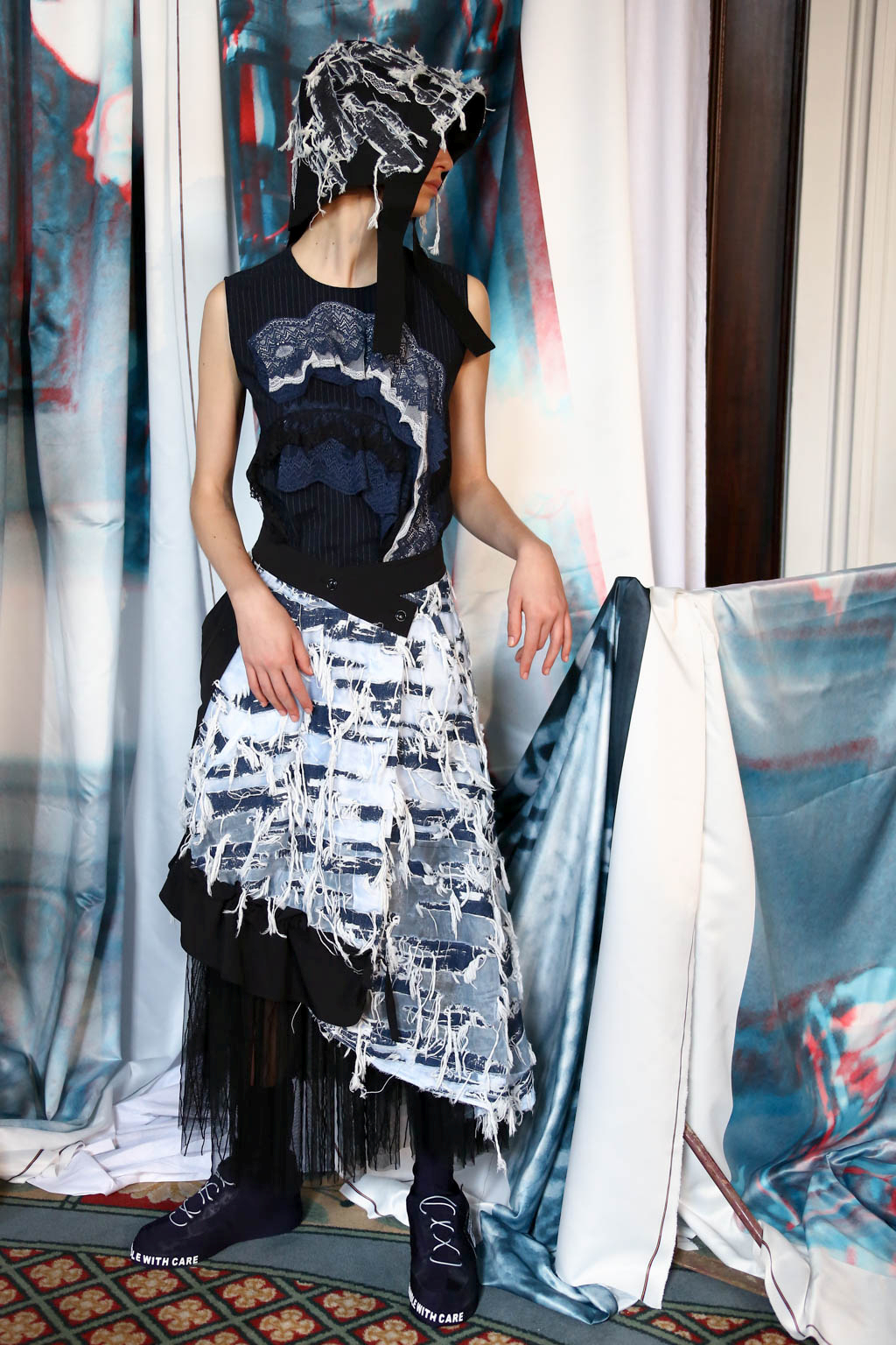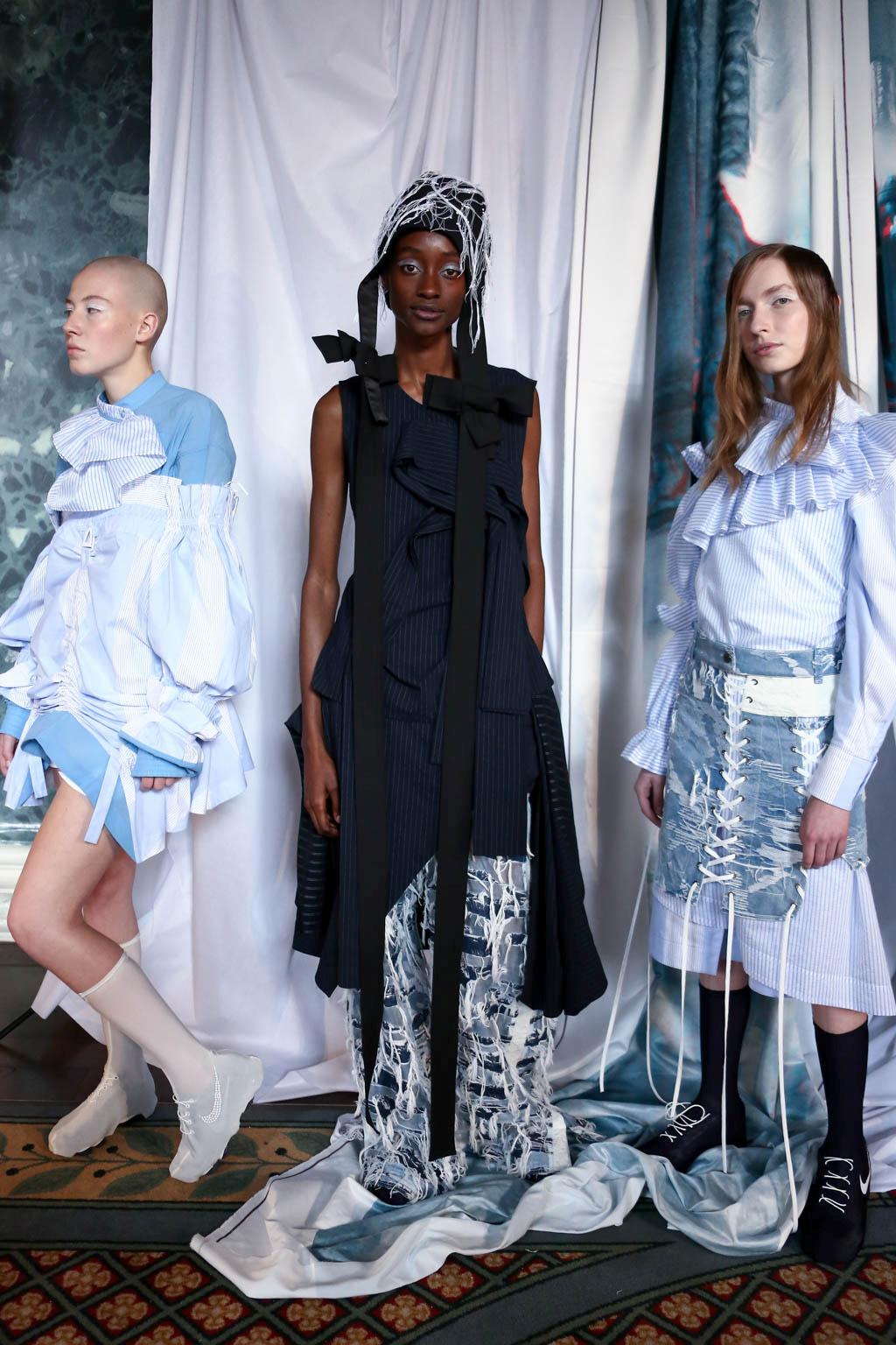 Mixed materials in various textures and colours are joined together creating a patchwork effect across the whole collection, presenting denim paired with lace and smart suit fabrics joined with bright yellow ruffles. Victoriana collars, bonnets and apron-like accents nod to a darker time for women, but are contrasted with blazer and pinstripe materials of a modern female aesthetic. Ruffles feature on almost all of the looks, showing it to be a key accent for this season. Delicate beading and thread work bring another textural dimension to monochromatic looks, bringing focus into an otherwise neutral element of the pieces.