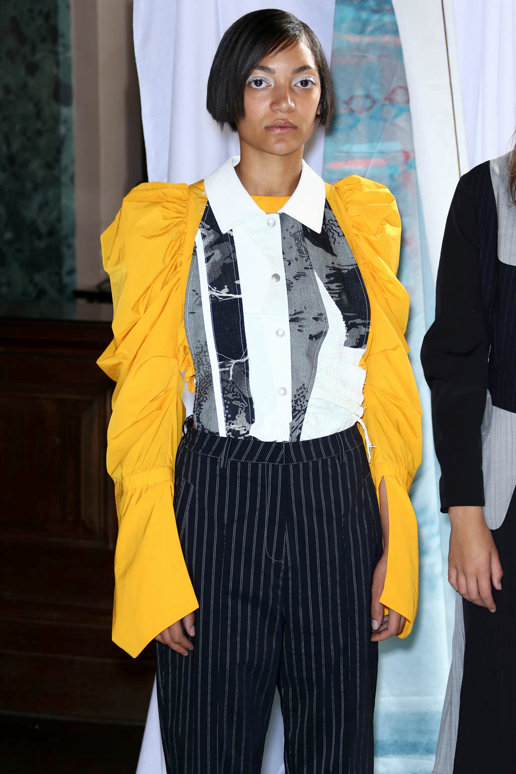 The standout piece was the sunshine yellow puff sleeve shirt, with a central white shirt panel, black lace inserts and silver buttons as a final touch. This was the perfect blend of statement and understated joined together with vertical seams to create a orderly and yet eye-catching shirt.