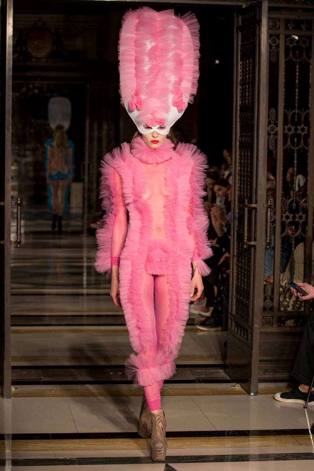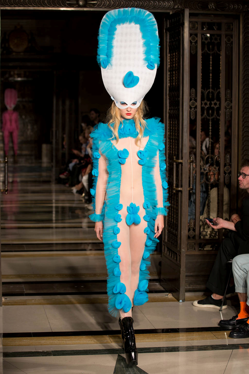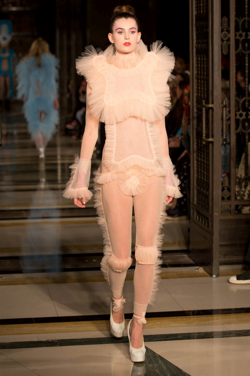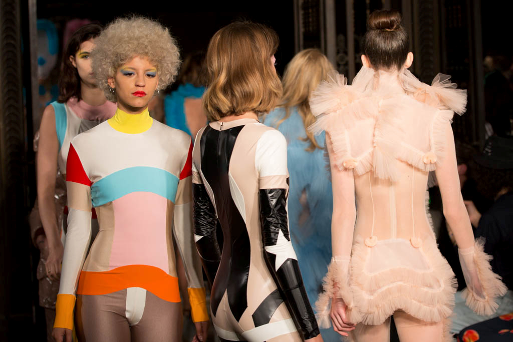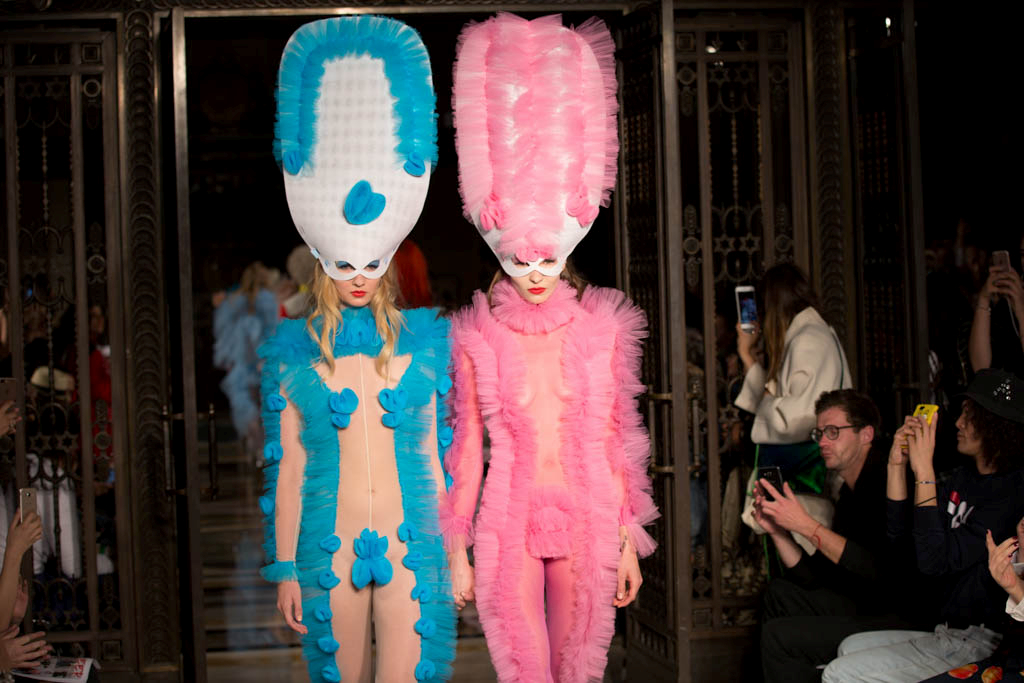 The show began with a series of harlequin-inspired figure-hugging jumpsuits in sheer translucent mesh, adorned with a series of ruffles, extravagant collars and baubles to create unusual silhouettes. Notably Hogg’s love of an extremely deep-cut neckline was apparent here. Many of the models wore masquerade masks in a nod to the theme and the looks ranged from the extremely on-trend millennial pink, which cropped up throughout the collection, to bold neons. Particularly intriguing was a powder blue look towards the end of the show that was decorated with an enveloping mass of ruffles from the back.