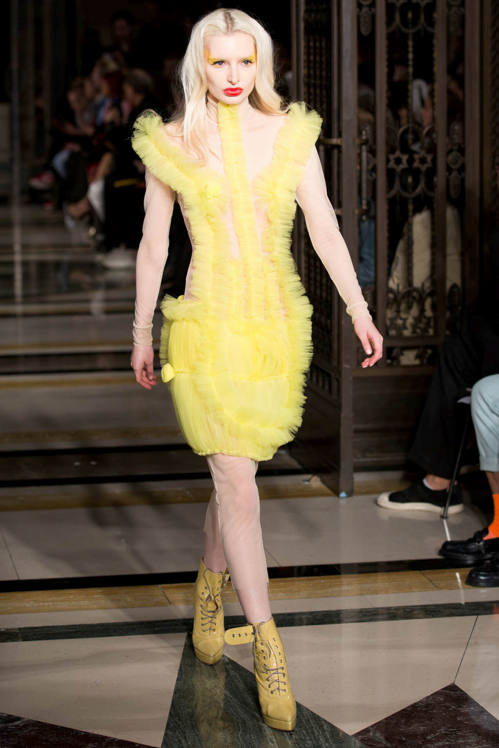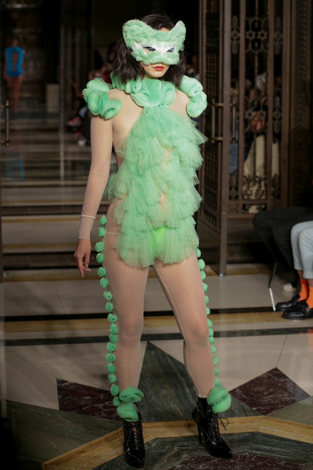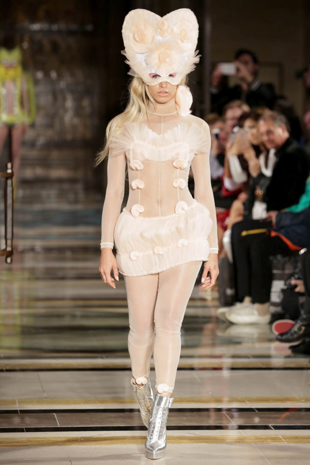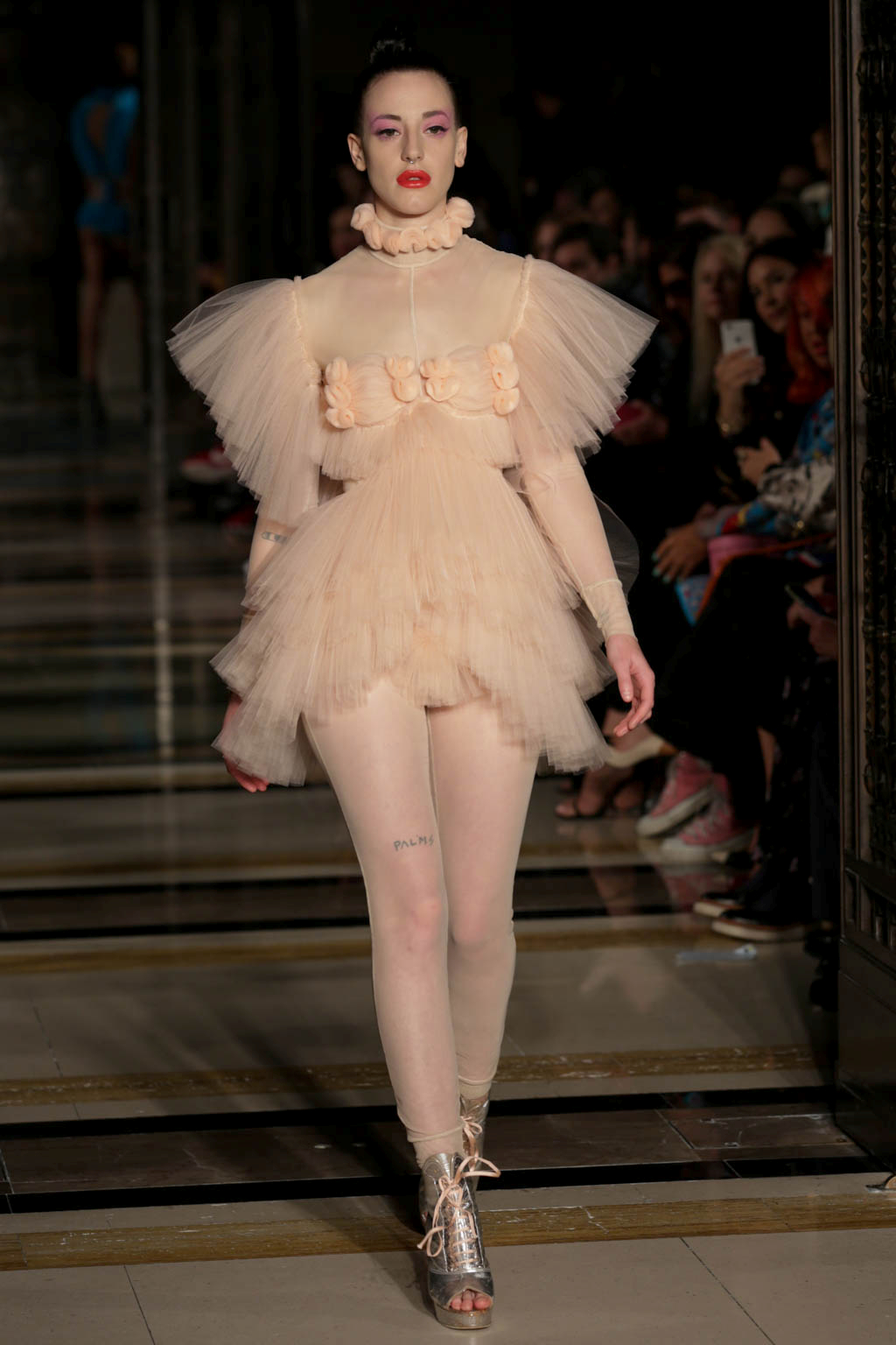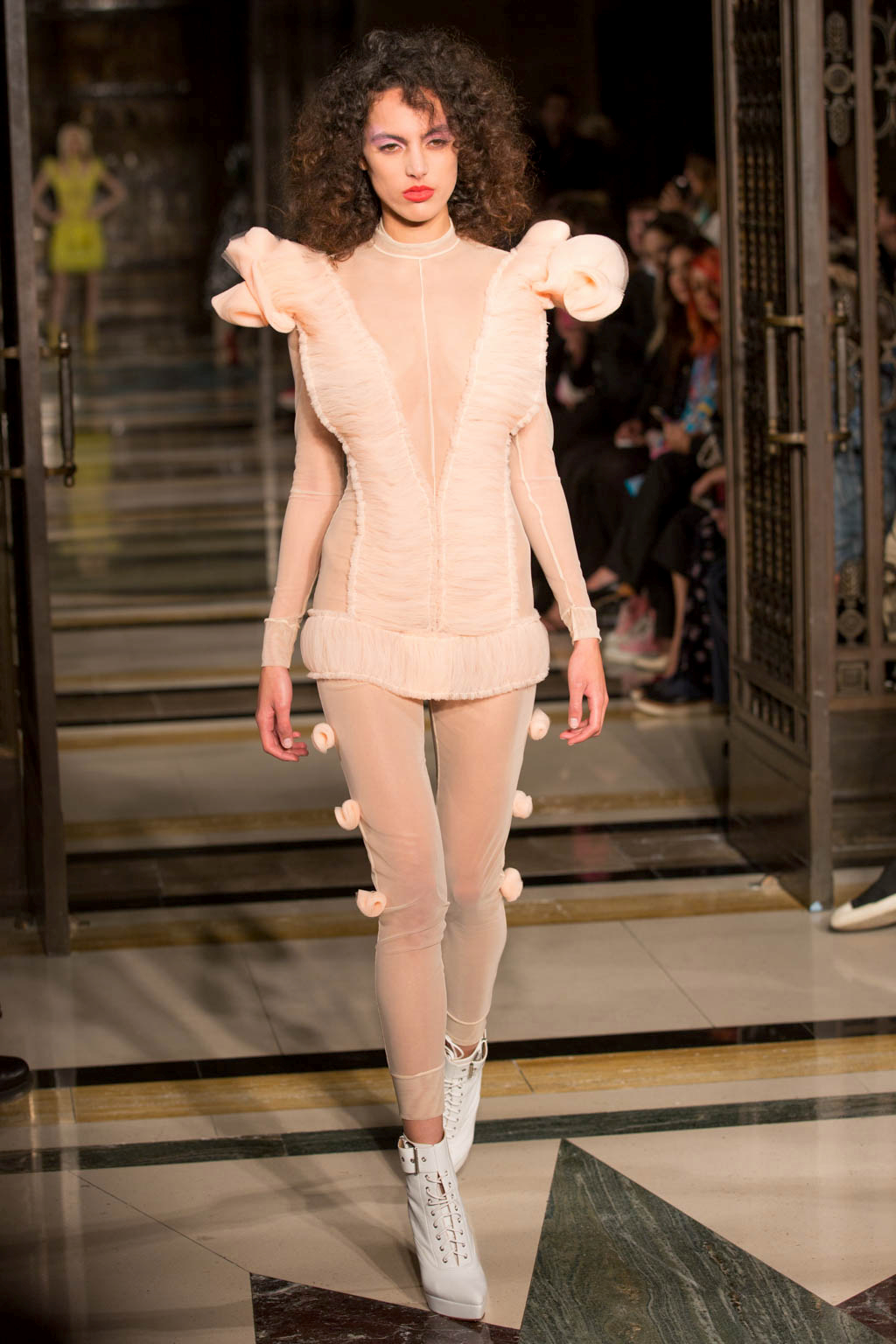 The show began with a series of harlequin-inspired figure-hugging jumpsuits in sheer translucent mesh, adorned with a series of ruffles, extravagant collars and baubles to create unusual silhouettes. Notably Hogg’s love of an extremely deep-cut neckline was apparent here. Many of the models wore masquerade masks in a nod to the theme and the looks ranged from the extremely on-trend millennial pink, which cropped up throughout the collection, to bold neons. Particularly intriguing was a powder blue look towards the end of the show that was decorated with an enveloping mass of ruffles from the back.