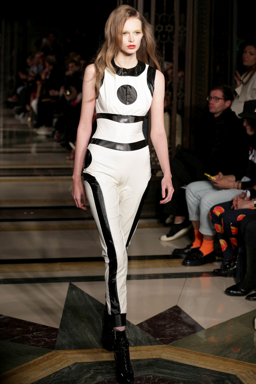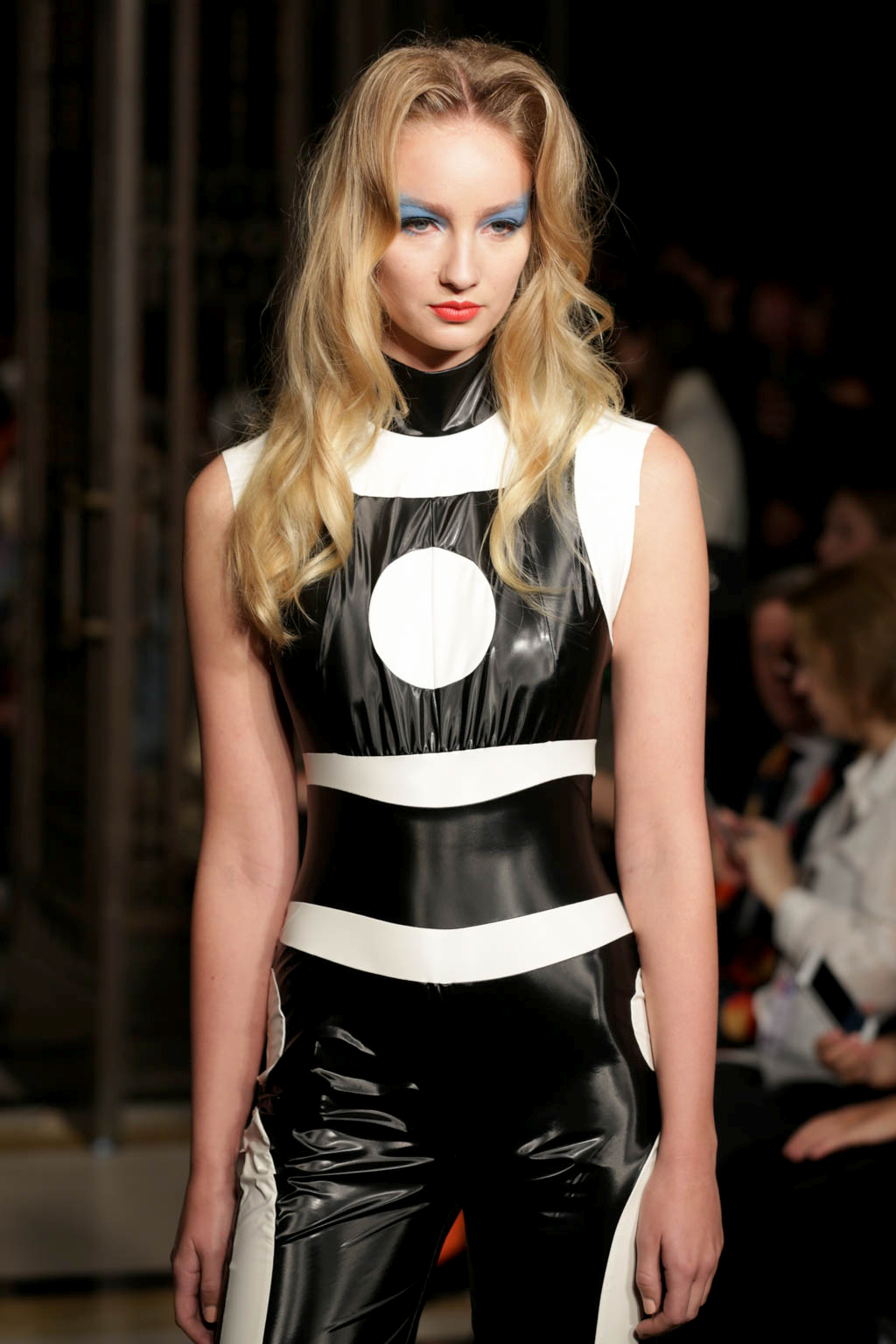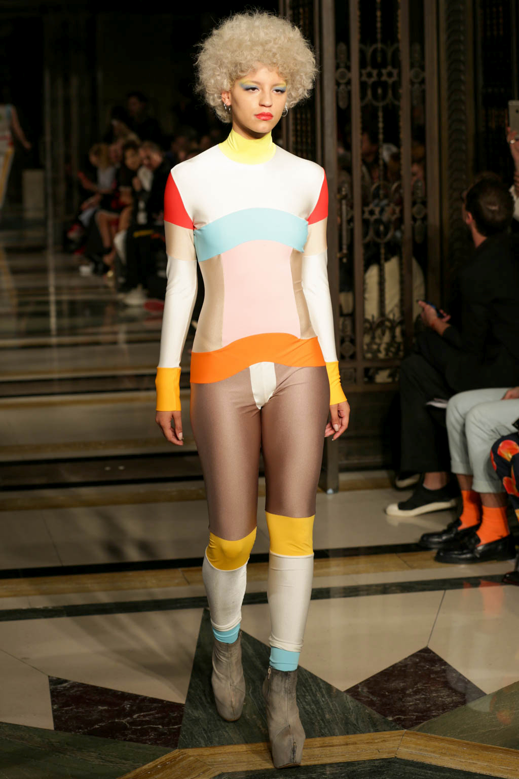 The tone changed with the introduction of a handful of bold, almost luchador-inspired jumpsuits in a figure-hugging Lycra. These were pattern with long straight and curved lines to compliment each model’s body and to keep with the pop art-inspired look. While the earlier more revealing looks involved unusual and jarring colour combinations, the later full-length jumpsuits in more monochrome colour palettes were by far more wearable. The standout look was a jumpsuit that in black, white and (again) millennial pink.