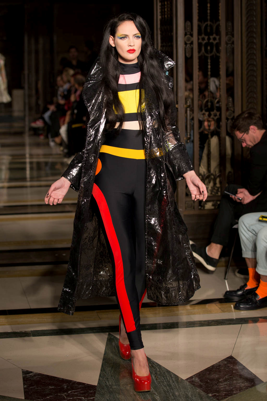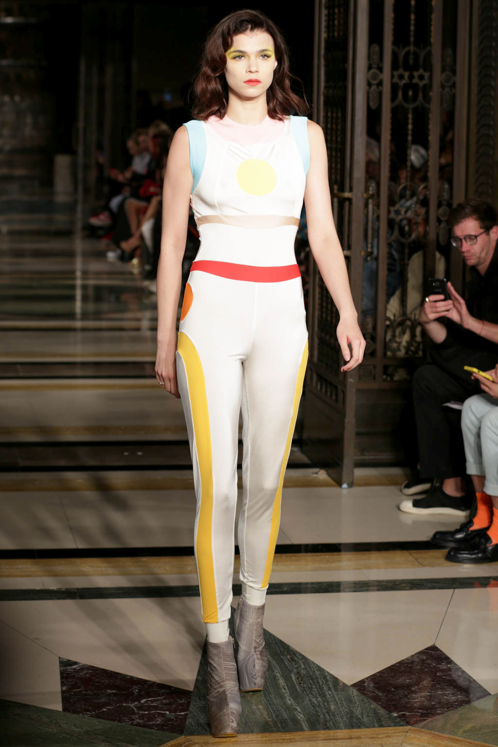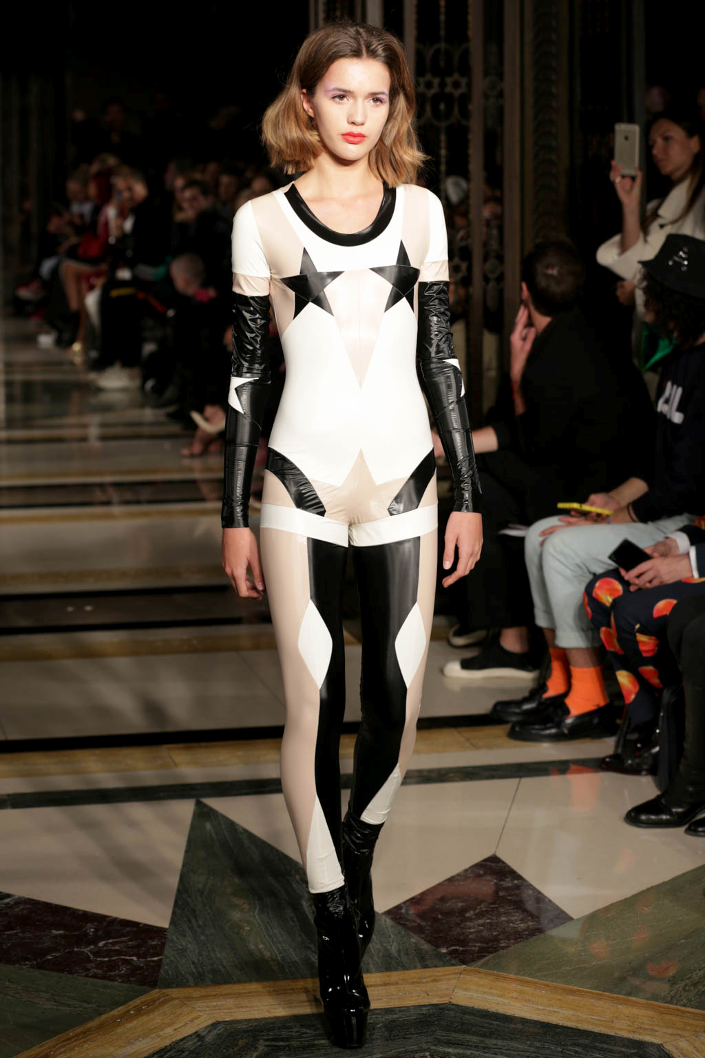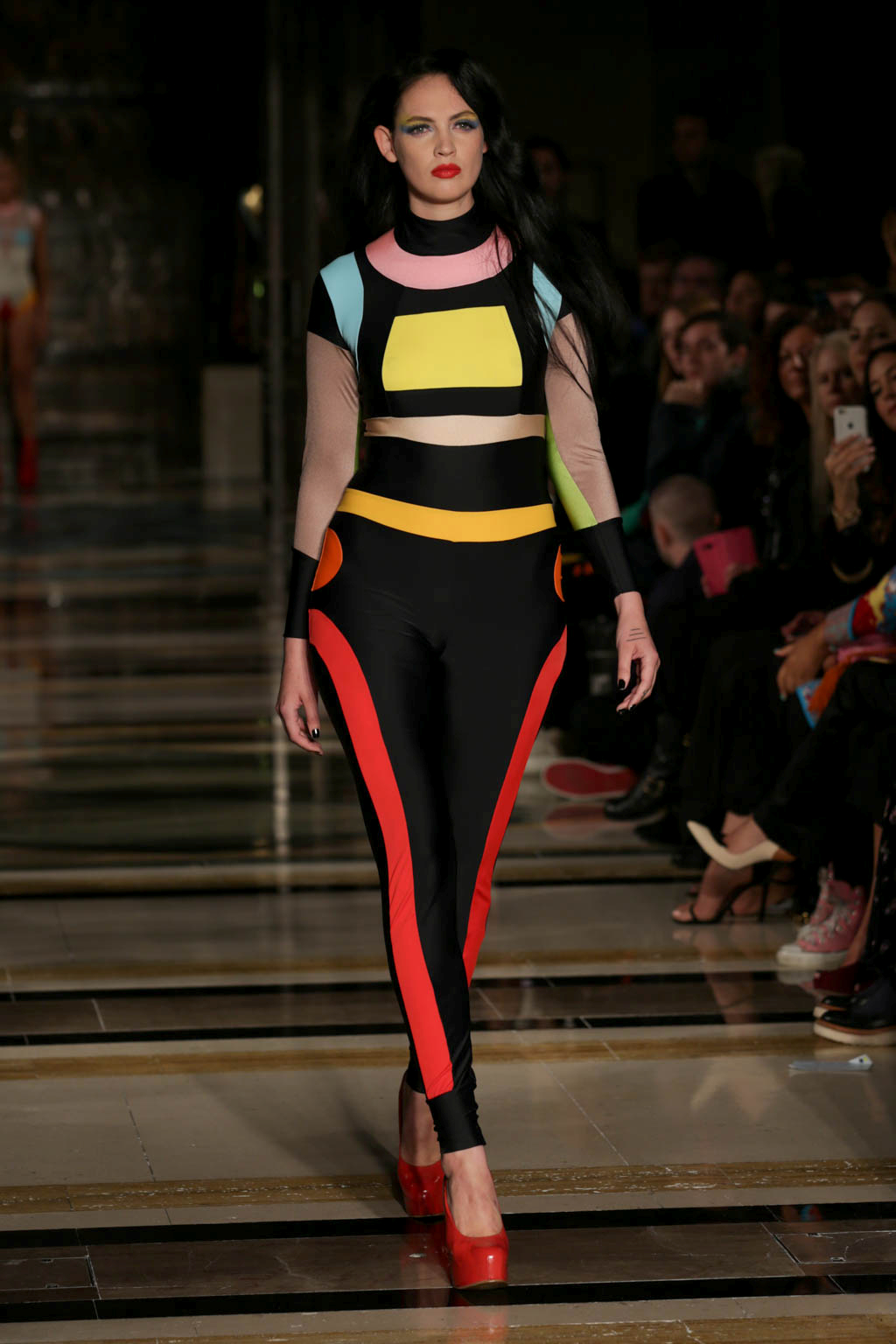 The tone changed with the introduction of a handful of bold, almost luchador-inspired jumpsuits in a figure-hugging Lycra. These were pattern with long straight and curved lines to compliment each model’s body and to keep with the pop art-inspired look. While the earlier more revealing looks involved unusual and jarring colour combinations, the later full-length jumpsuits in more monochrome colour palettes were by far more wearable. The standout look was a jumpsuit that in black, white and (again) millennial pink.