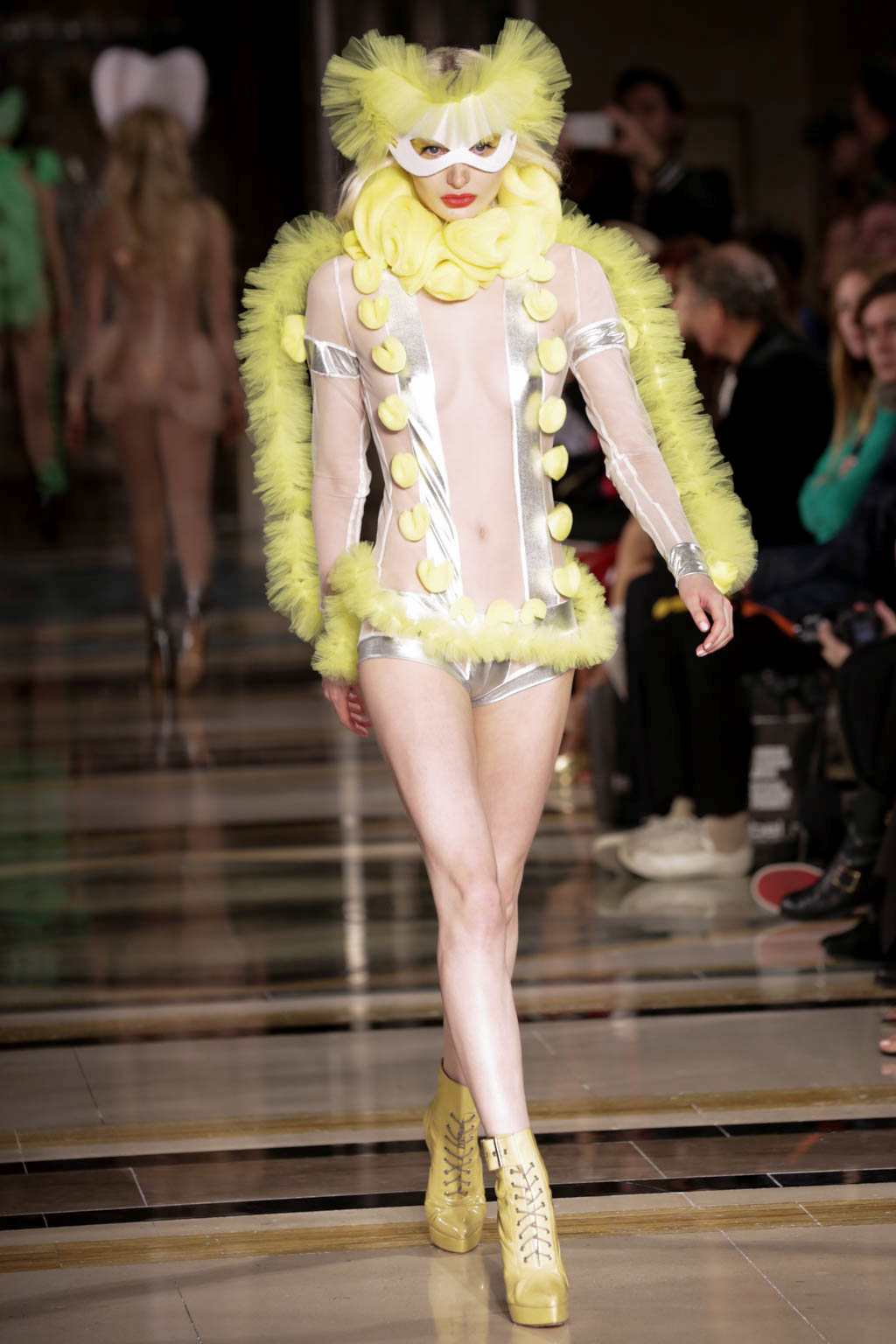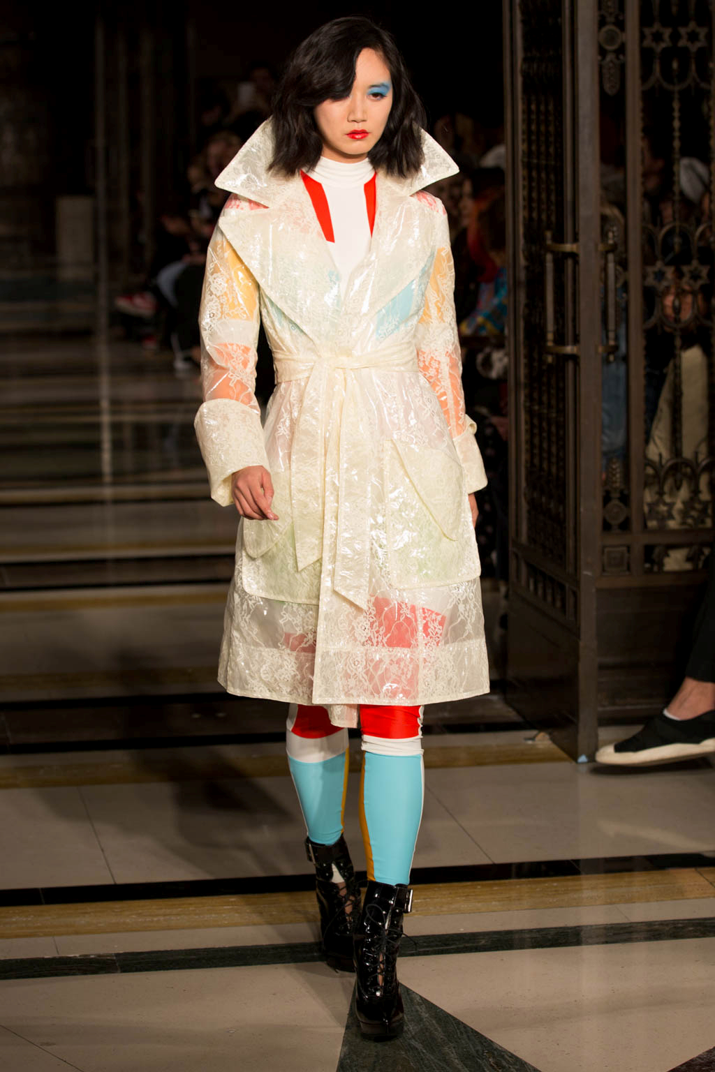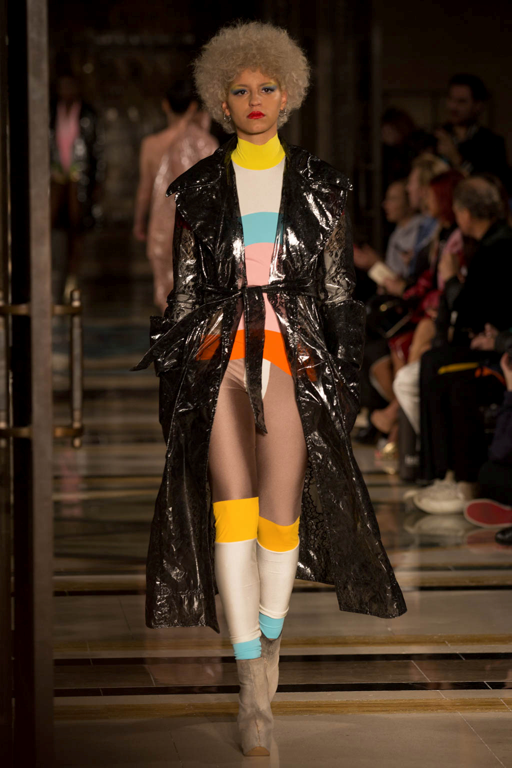 After this some of the models returned wearing a selection of semi-transparent, PVC coats over their original Lycra outfits, detailed in lace and in off-white, pink and black. These were by far the most ready-to-wear feature of the collection and innovated on the idea through excellent use of texture and oversized collars and cuffs. The show also circled back to its original harlequin theme, presenting a few more examples of the bodysuits in more pastel colours and culminating in two models in high, Marie Antoinette-inspired headdresses, which had a charmingly DIY feel.