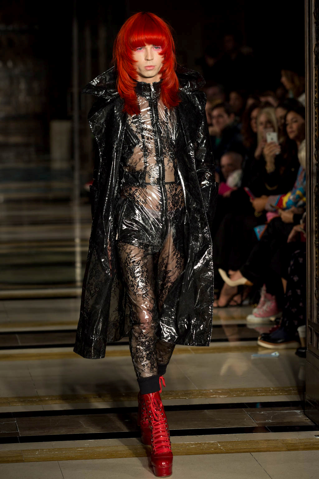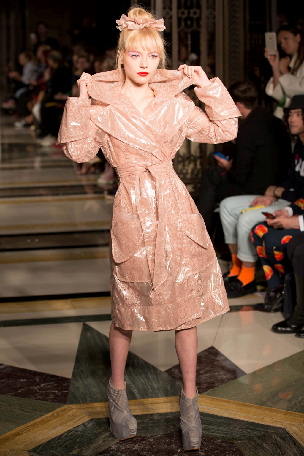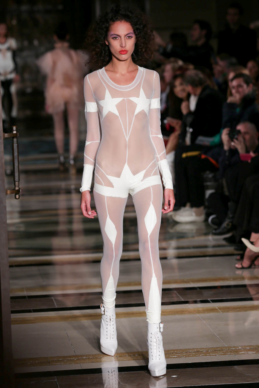 After this some of the models returned wearing a selection of semi-transparent, PVC coats over their original Lycra outfits, detailed in lace and in off-white, pink and black. These were by far the most ready-to-wear feature of the collection and innovated on the idea through excellent use of texture and oversized collars and cuffs. The show also circled back to its original harlequin theme, presenting a few more examples of the bodysuits in more pastel colours and culminating in two models in high, Marie Antoinette-inspired headdresses, which had a charmingly DIY feel.