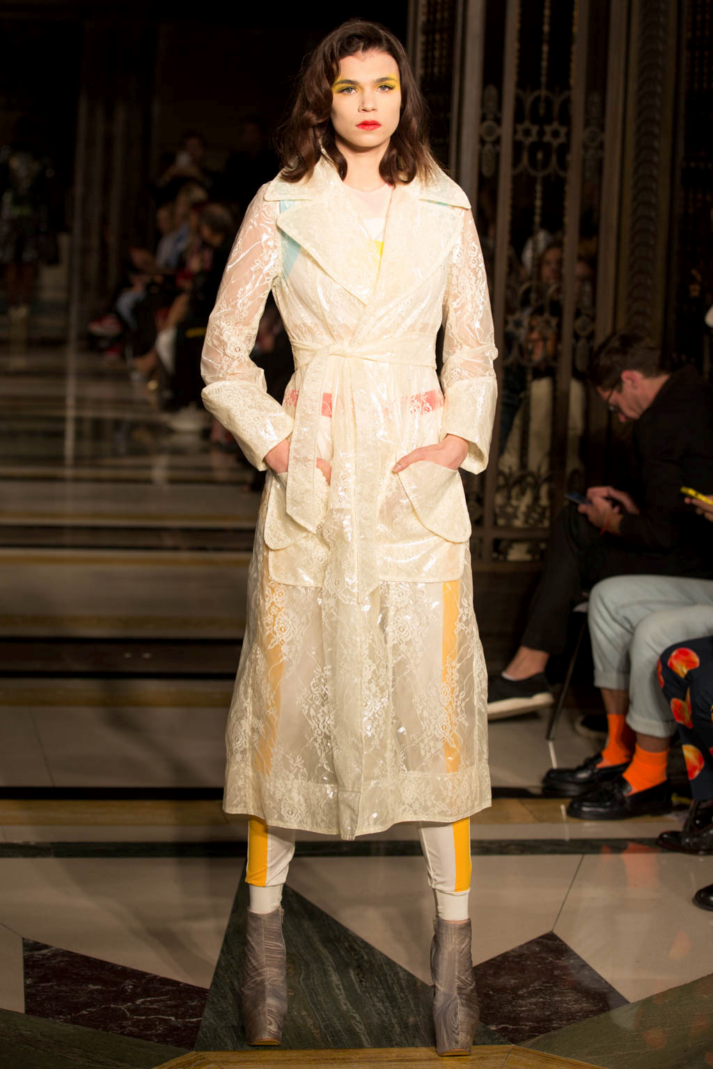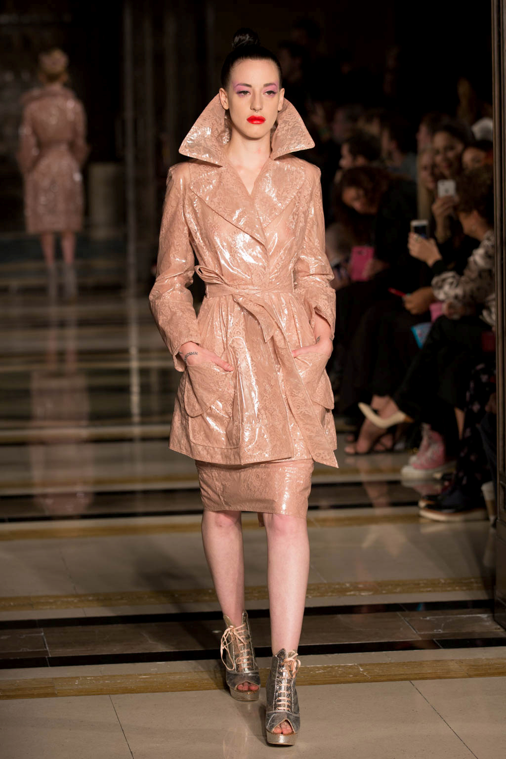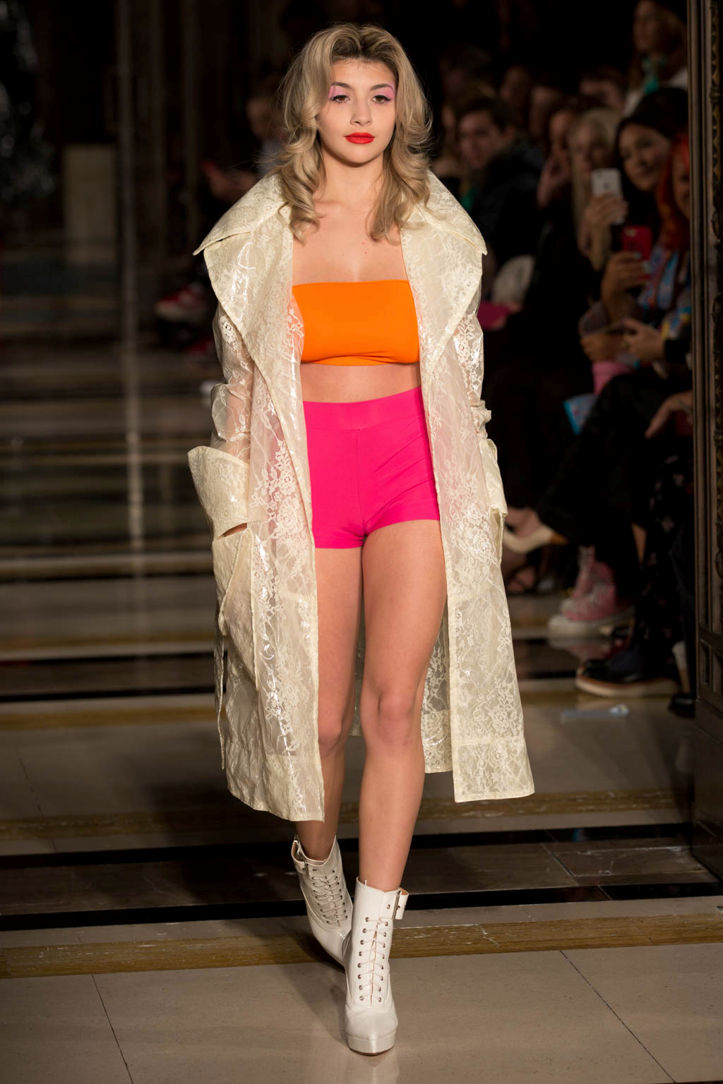 Superstar Scottish designer Pam Hogg stunned as usual at London Fashion Week for Fashion Scout, with a collection that showcased her skill for innovation by managing to wow the throng gathered in the Freemason’s Hall. The collection was perhaps more light-hearted and playful than her previous shows and drew from a range of unusual influences. In a nod to recent beauty trends, each model wore a bold lip and an exaggerated stripe of bright eyeshadow extending above the eyebrow.