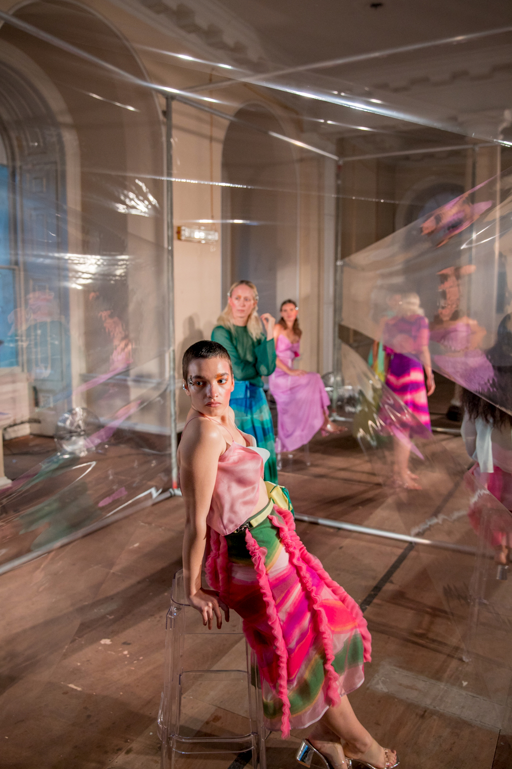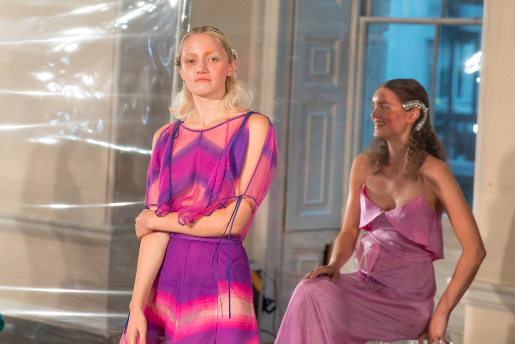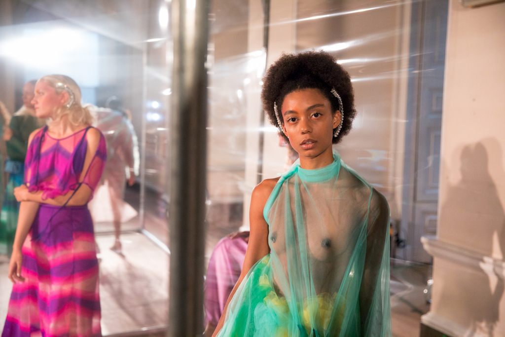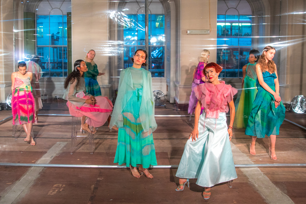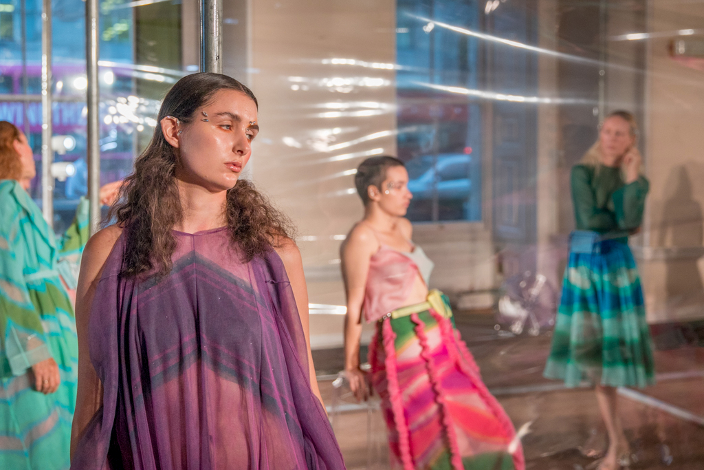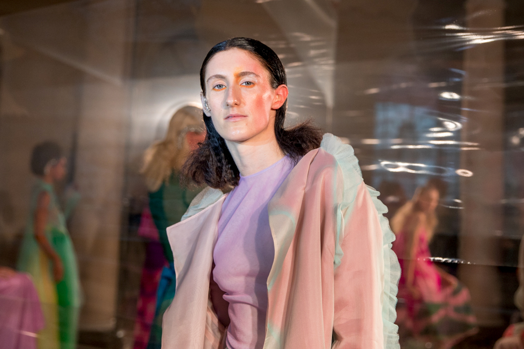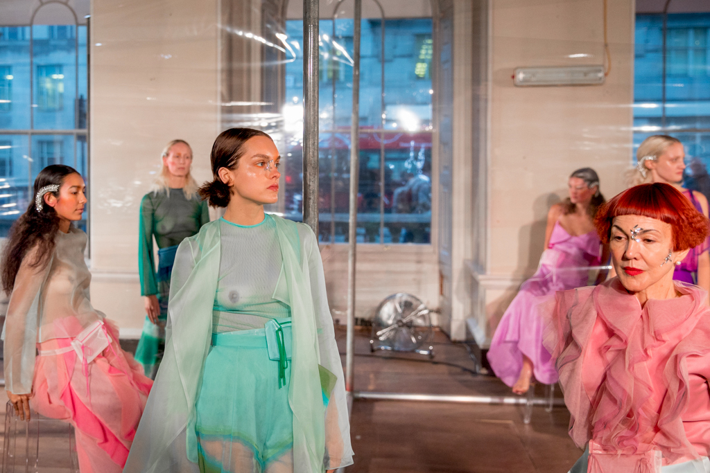 Ethereal models of all ages are dotted around and within an acetate screen reflecting the spotlights shining on them, giving a dreamy effect across the central stage. This season’s inspiration for Tugcan Dokmen is Georgia O’keeffe and her influence is evident across the presentation; fluid shapes in the colours of nature flow across the sheer fabrics floating delicately in the wind (provided by strategically placed electric fans). It is lovely to see older women in the mix, and this perfectly encapsulates the mythical forest nymphs they embody; magical creatures of no specific origin or age.