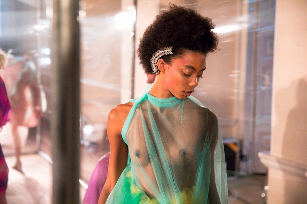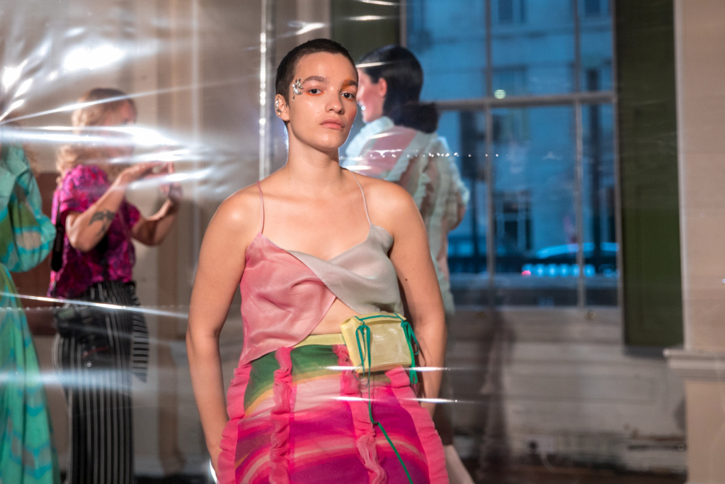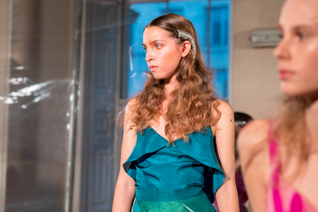 Models are accessorised with glittering crystal headpieces reminiscent of leaf vines or fishbones and stick on jewels around their cheekbones. Makeup is kept dewy and shimmering, with gentle orange and pink strokes around the contours of their faces. Footwear echoes the set design with PVC front panels and metallic heels, also glistening in the light. A sweet feature to the looks is tiny waist pouches with trailing ribbons in matching colours to the outfits, which add another dimension to the otherwise very simple and feminine figures.