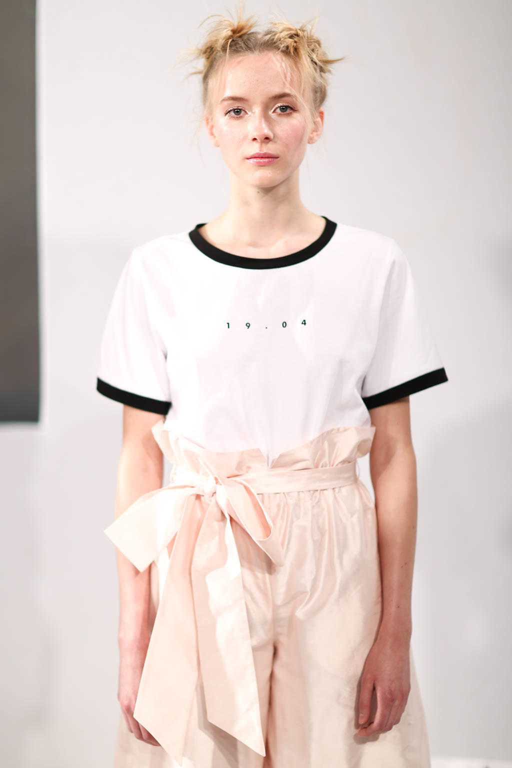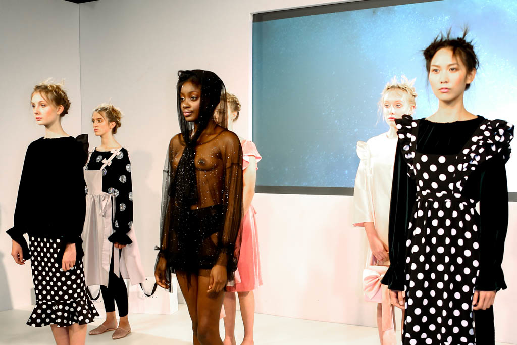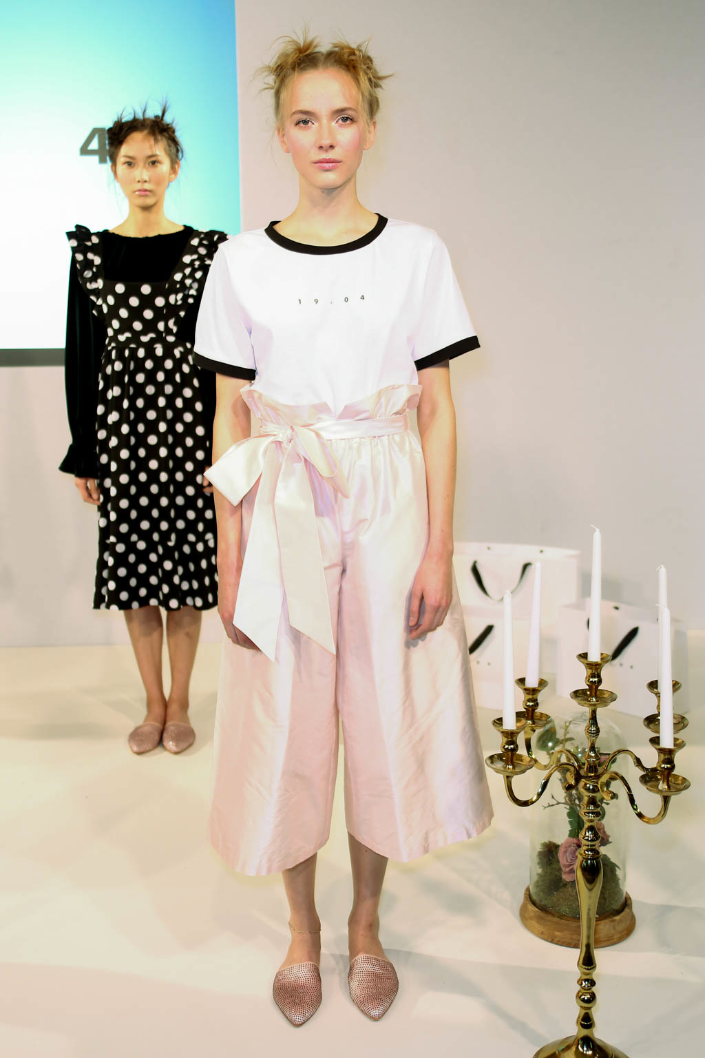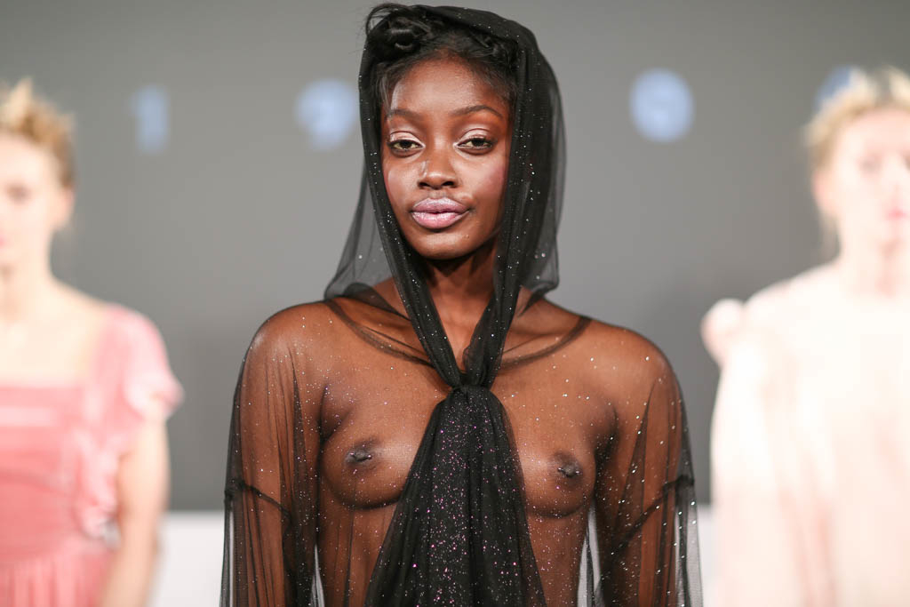 Floral adornments, upbeat music and candle sticks were used as decoration and helped summarise and reiterate the feminine, creative approach to wardrobe staples. The brand, which was established in 2017, has created a line that boasts style and substance. A mesh dress with large bow detailing at the neck, worn only over a pair of underwear, was the most striking piece as it featured sequinned ornamentation that shimmered in the light, and was offset with pink jewelled shoes.