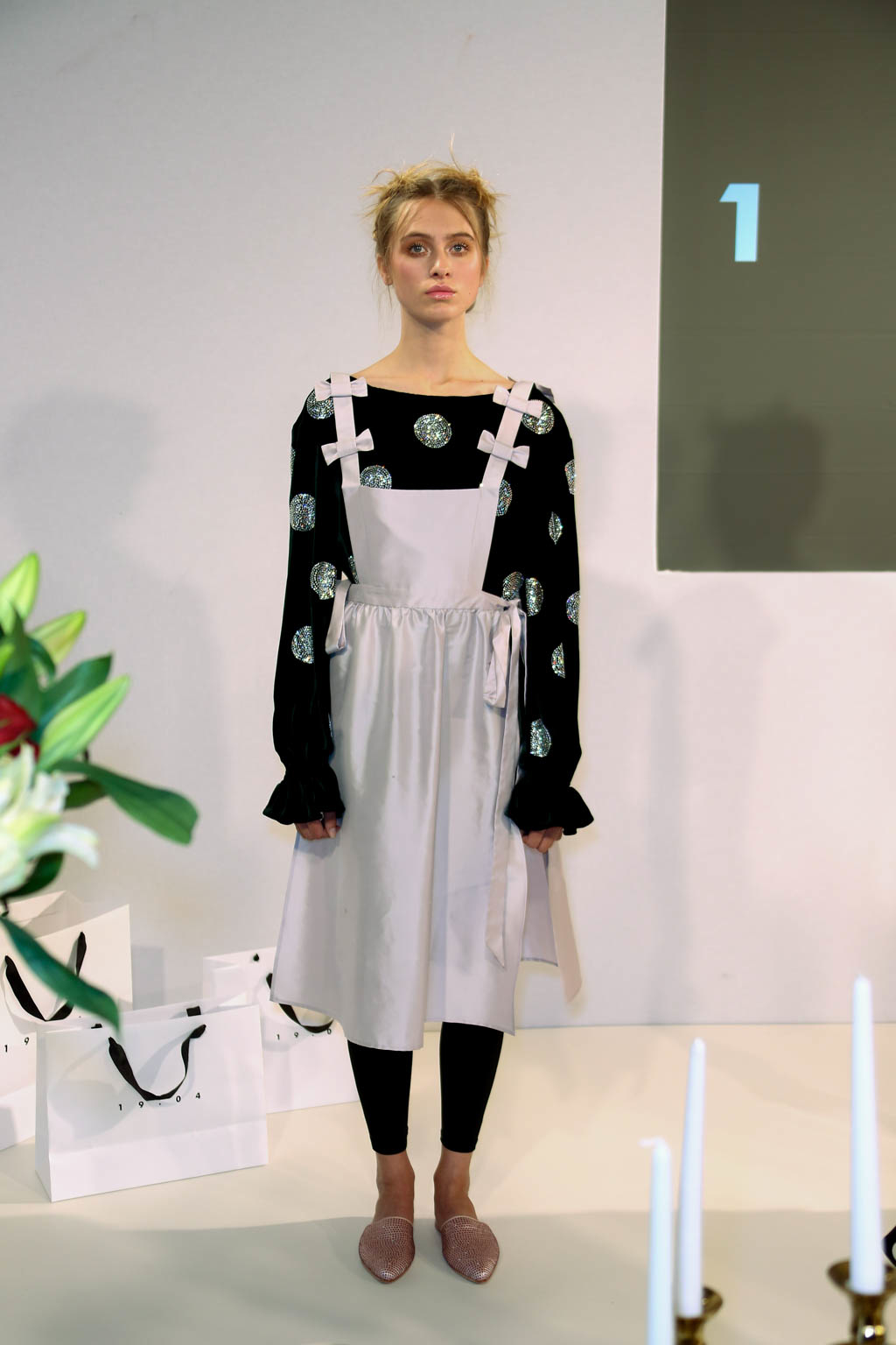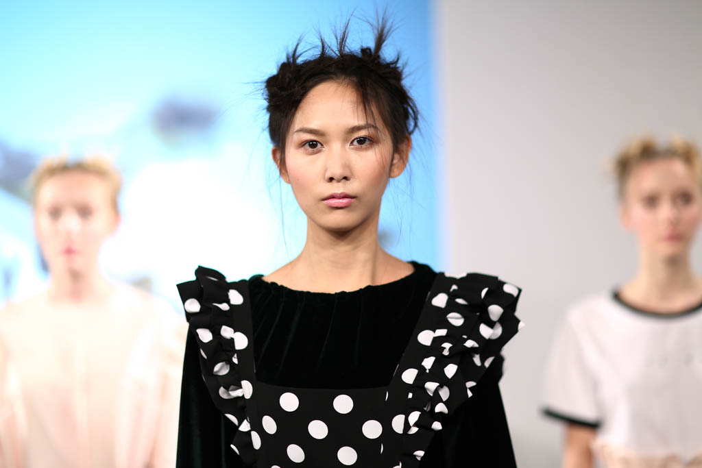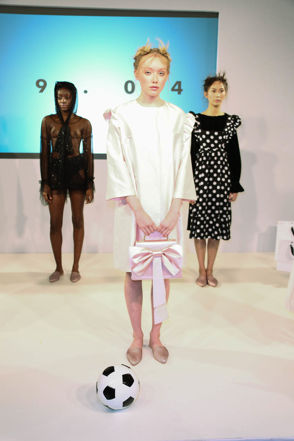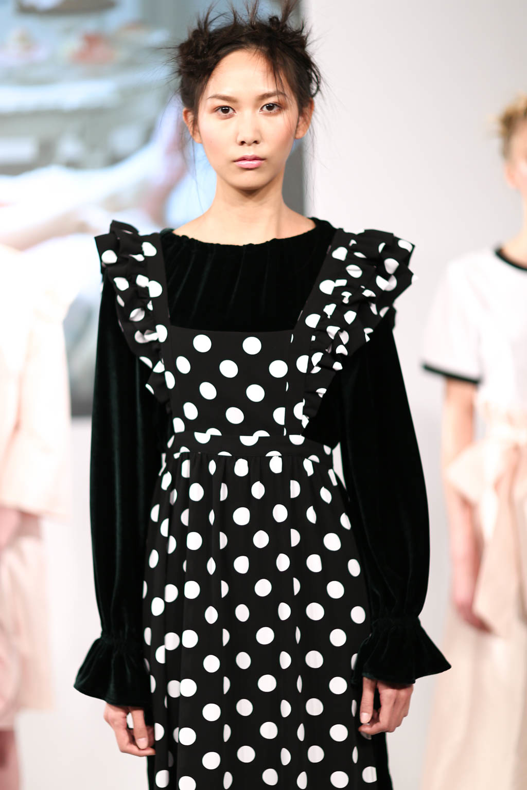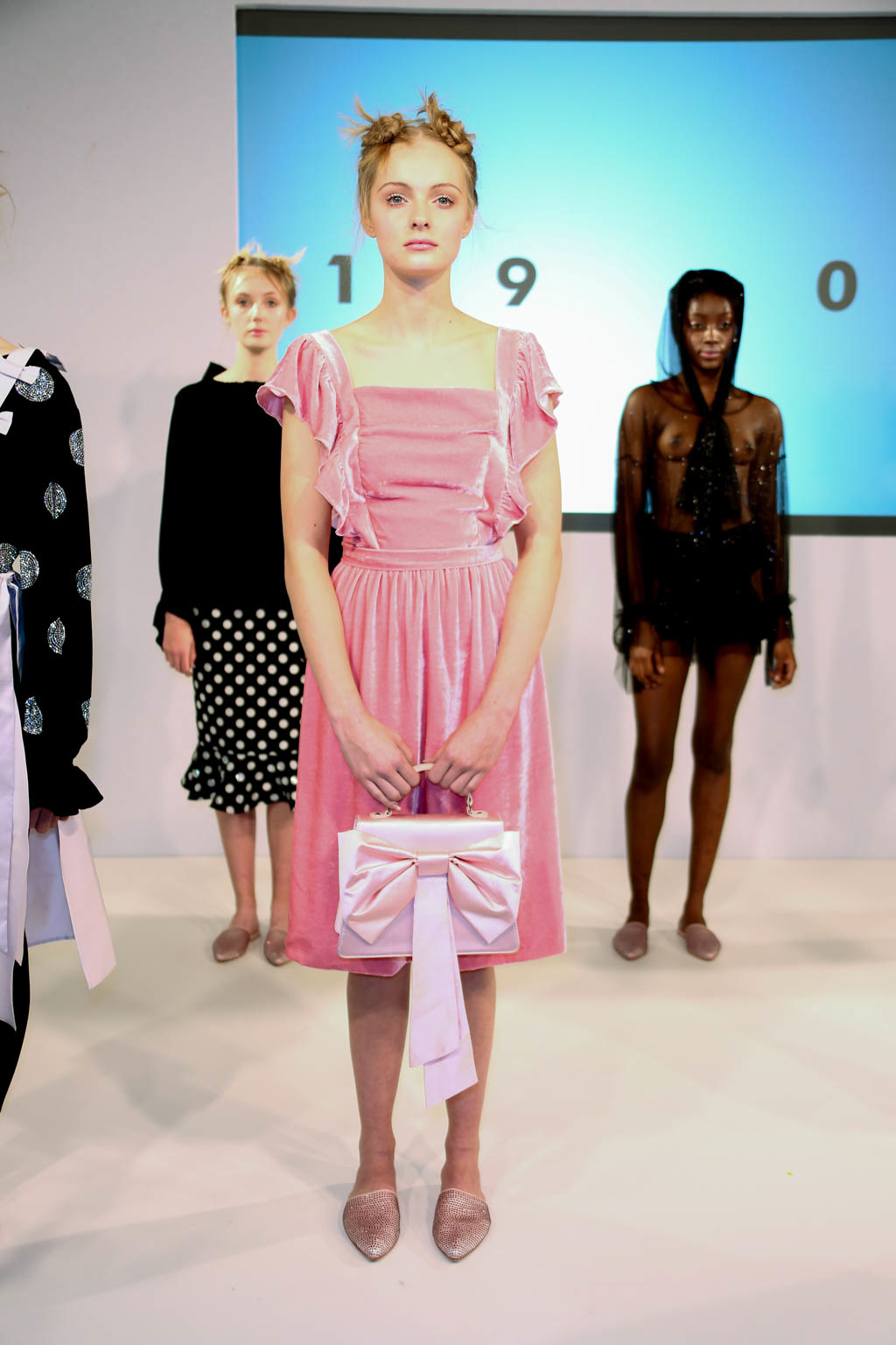 Classic feminine apparel has been reimagined and given an innovative twist. Polka dots featured in the form of a sequinned velvet jumper beneath a purple satin bow pinafore dress, a black and white skirt and also a dress with ruffled shoulders that was worn over a teal velvet bell sleeve jumper, tying in a classic fashion element but giving it a new individualist twist. Bow elements featured throughout on bags, the previously mentioned pinafore dress and the belts of both a velvet dress and trousers given the whole line an innocent feminine demeanour.