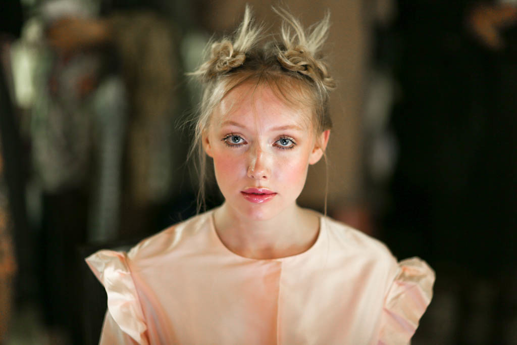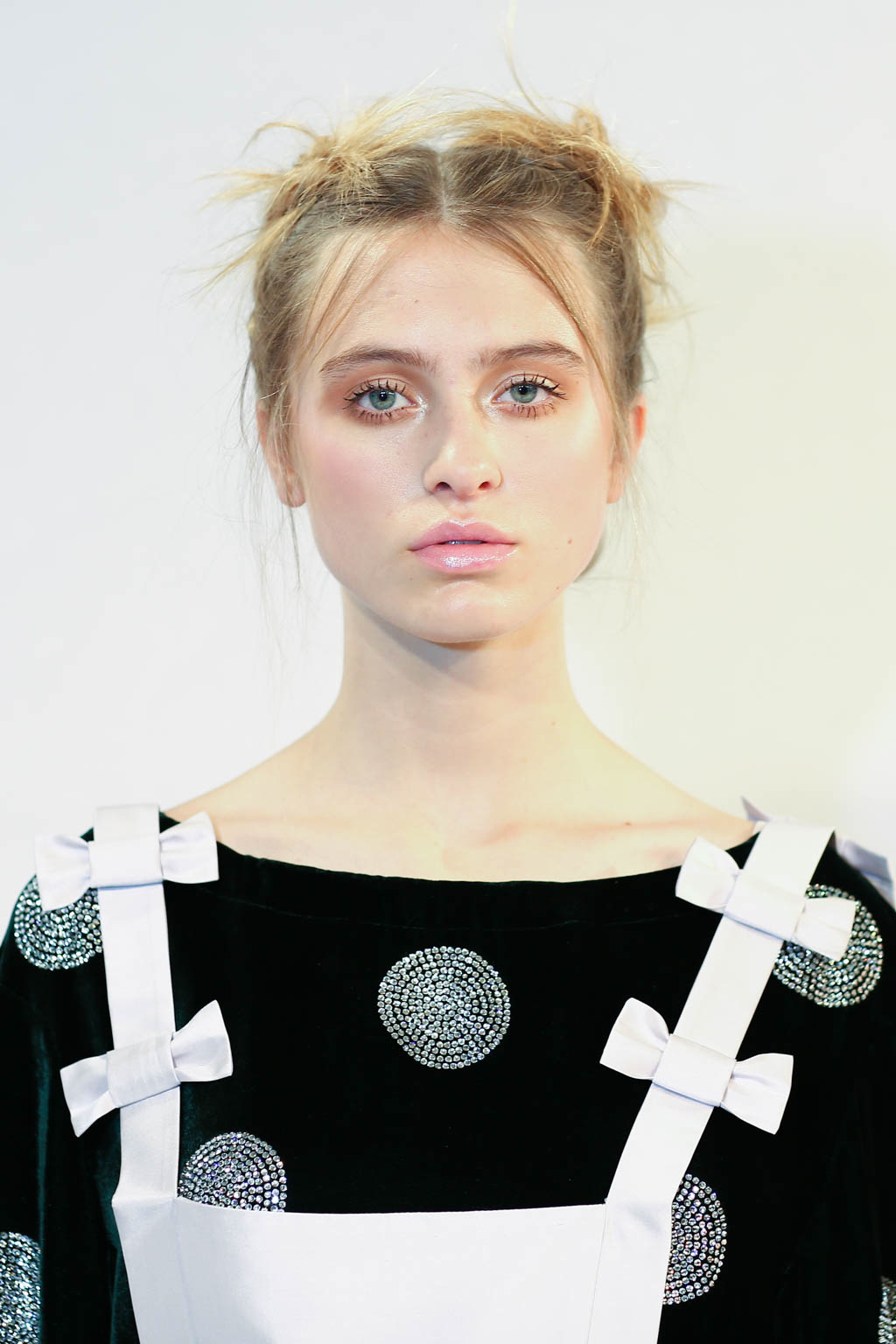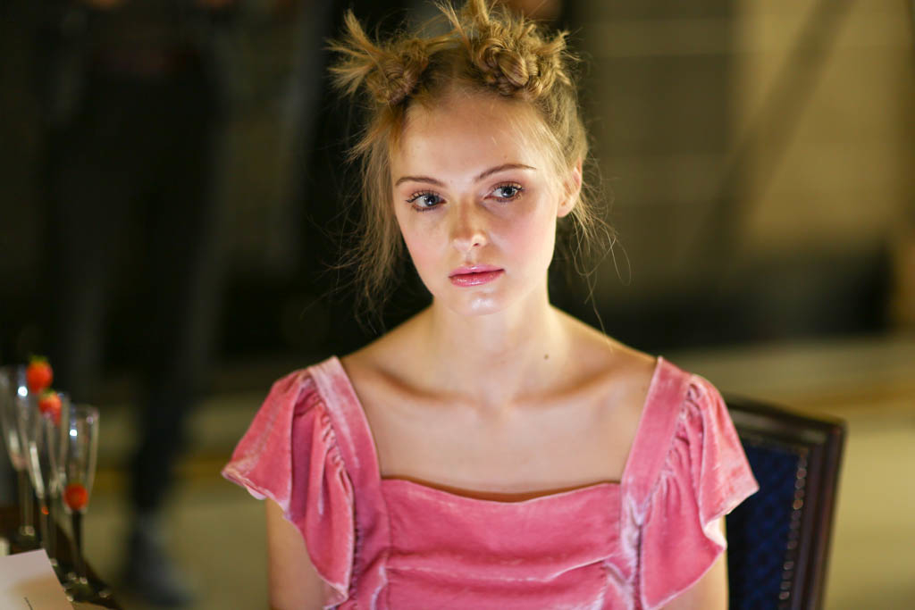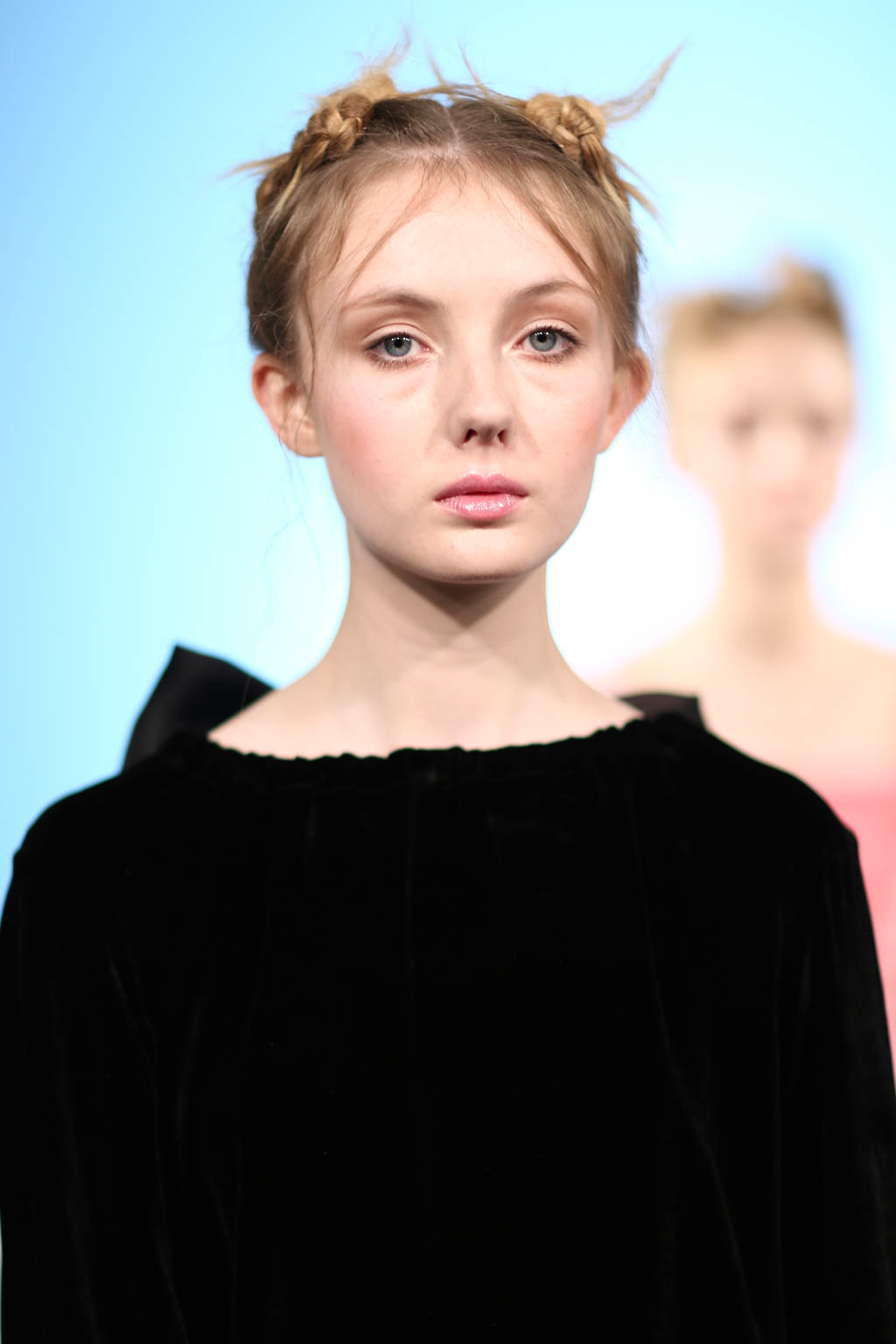 A playfulness element was seen in the form of a ruffle pink velvet dress, pink satin gown bags and a ringer t-shirt paired with pink ruffle waist tailored trousers, bringing a casual fashionable twist to a traditional tailored item. All were paired with flushed pink cheeks to reiterate the youth and playful quality of the brand’s identity.