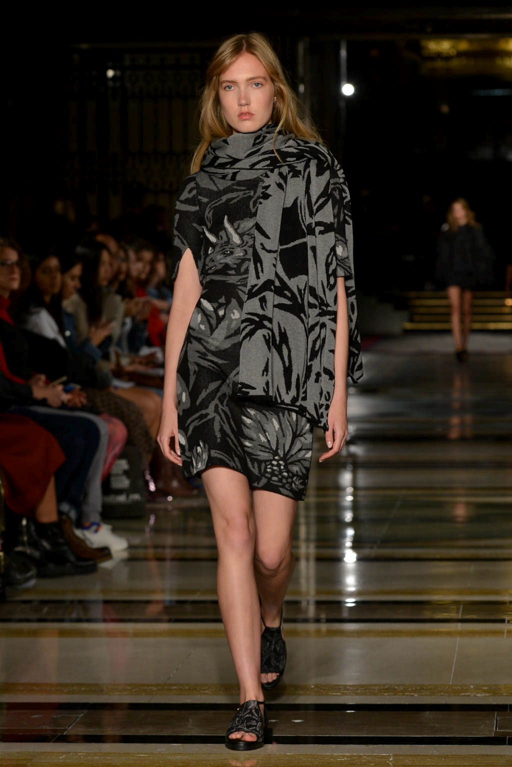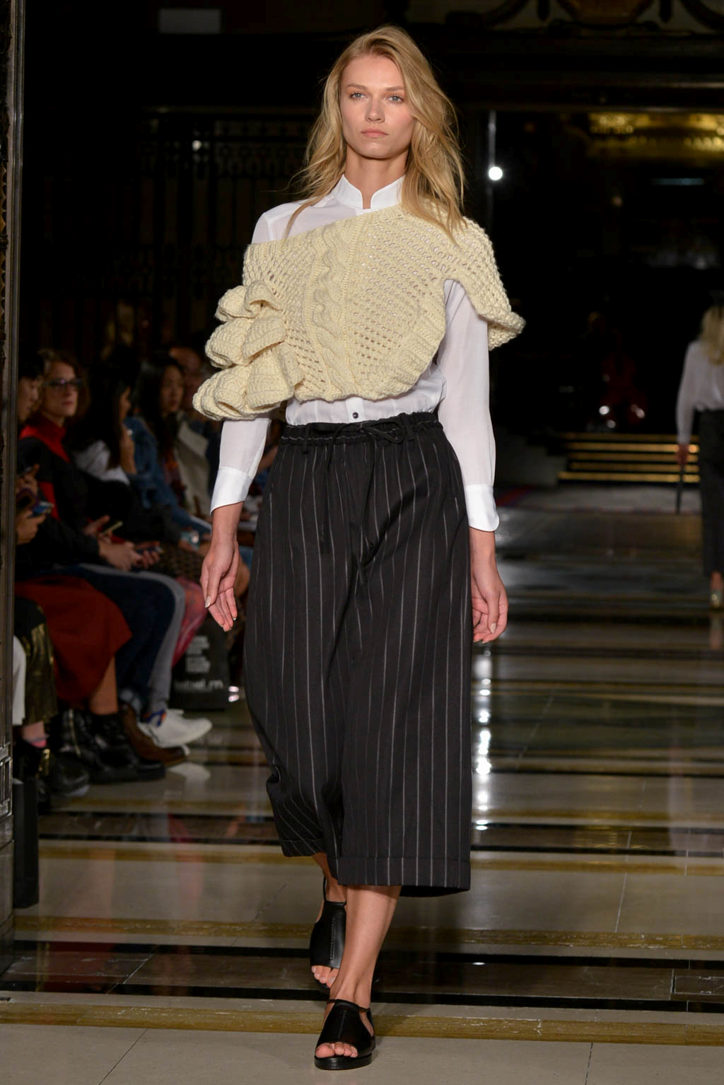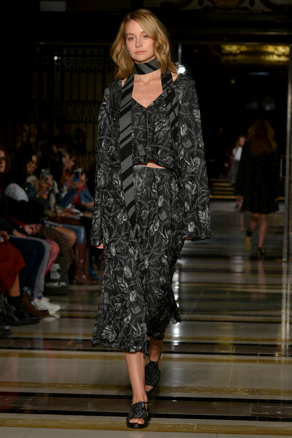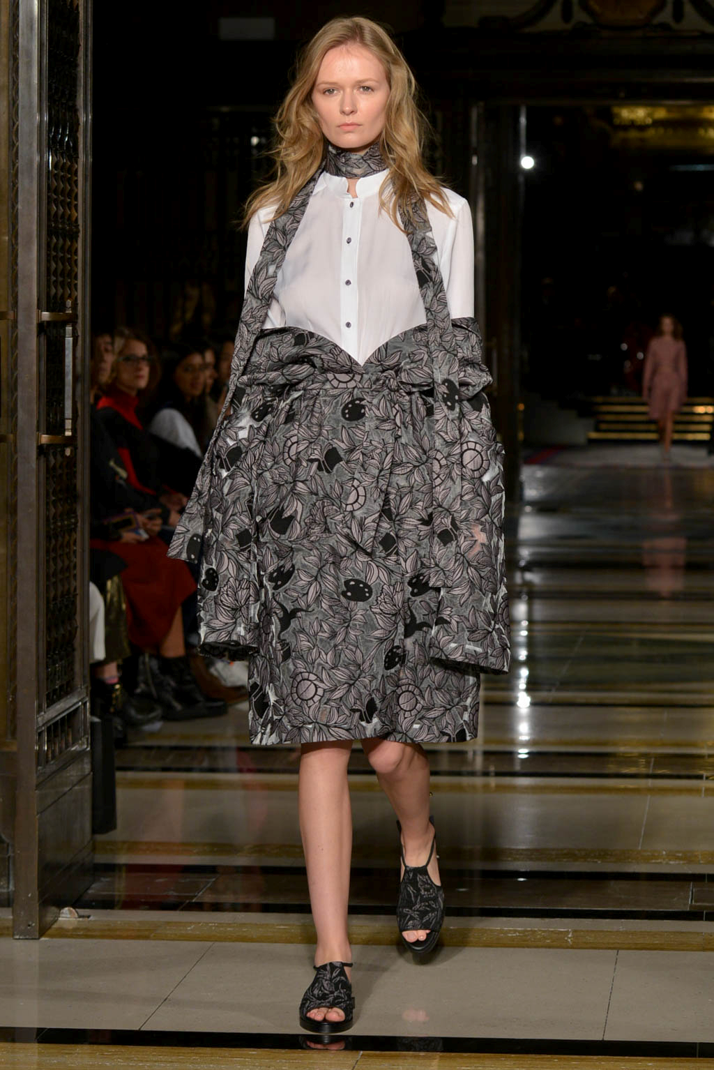 The pattern components include blossom petals, leaves, spring snow and ink echoing the theme of preserving flowers and their beauty, but also is a nod to Edgar Allen Poe’s “The Fall of the House of Usher”. Colours and textures have been used to imitate the falling petals, paying homage to O Henry’s “The Last Leaf” in a colour palette of grey, black and white, with elements of pastel blue and pink which is meant to symbolise flower petals. Open back dresses in pale pink, reflective of blossom, contrasts with knitted pieces including one that adorned a white structured shirt and tailored trousers combination.