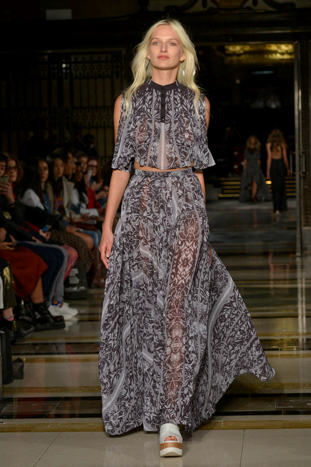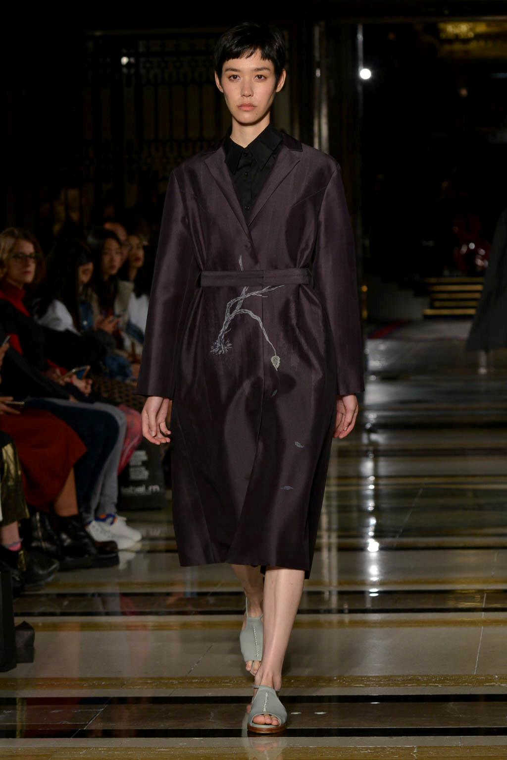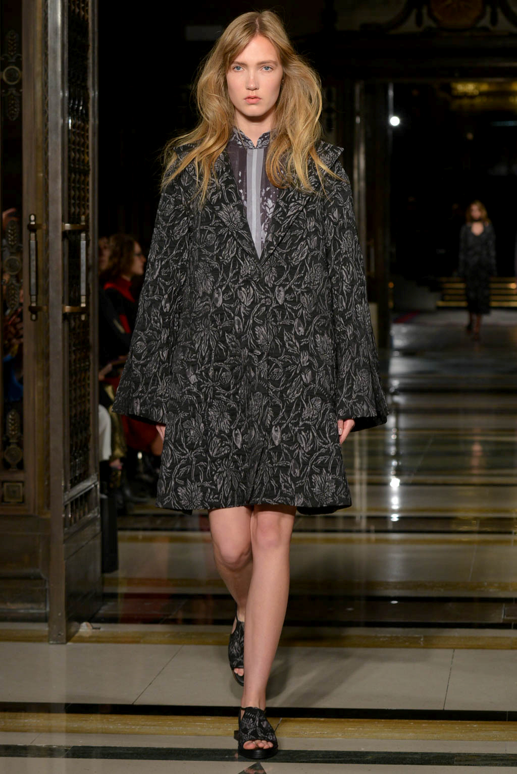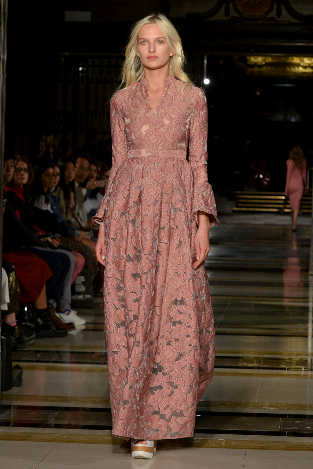 The live music – of the r&b, soul and house genre – created a smooth soulful ambience which could be seen to indicate the extension and freezing of a flowers beauty, but also created a mellow atmosphere. The muted colour palette drew further attention to the level of detail and care given to the garments, whilst the textures imitate the beauty, romance and extended life of the flower.