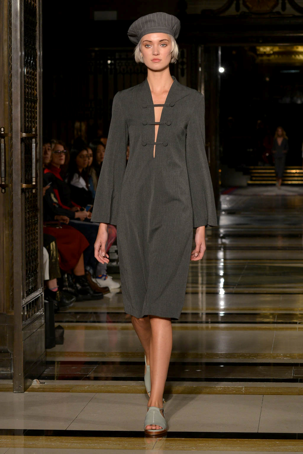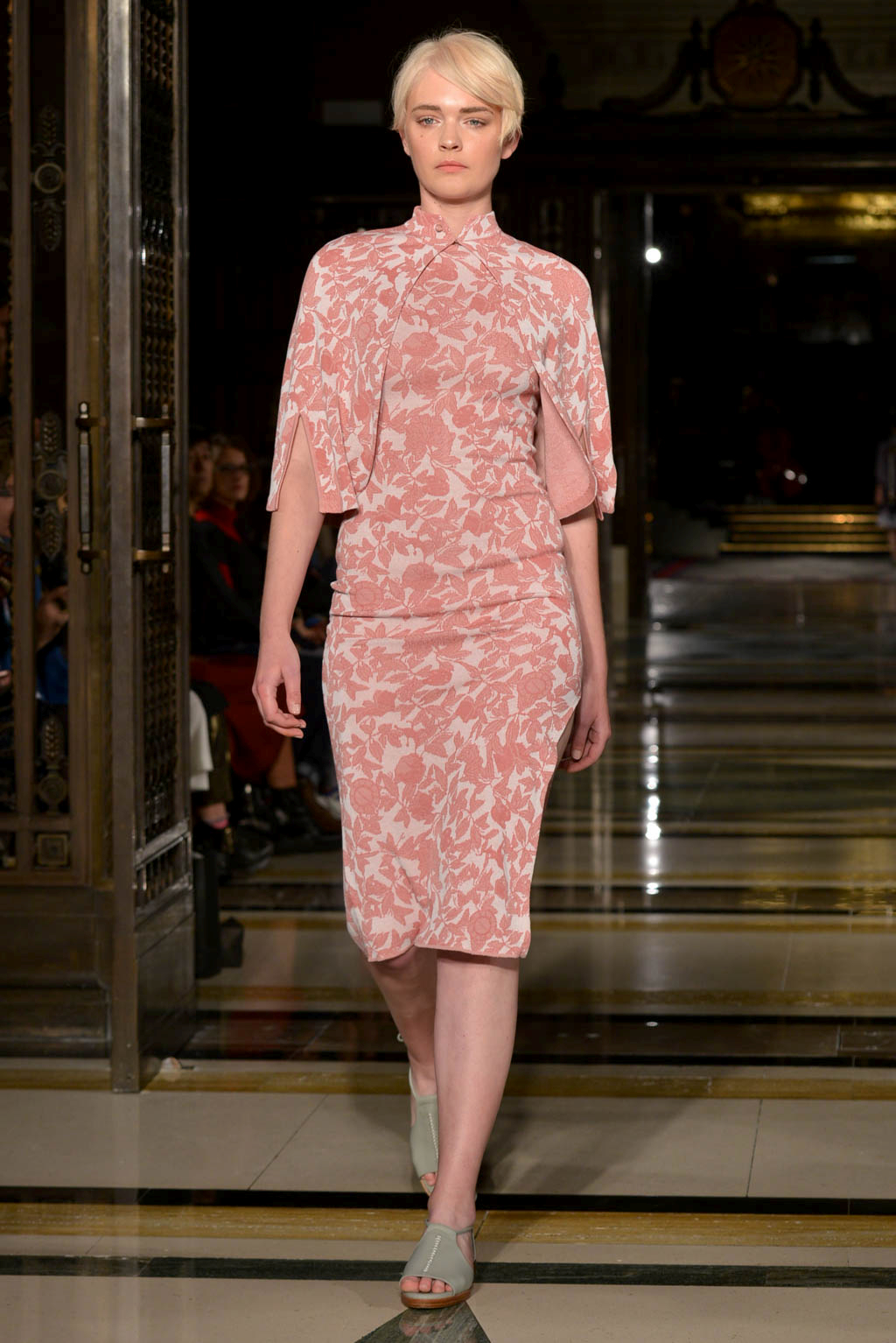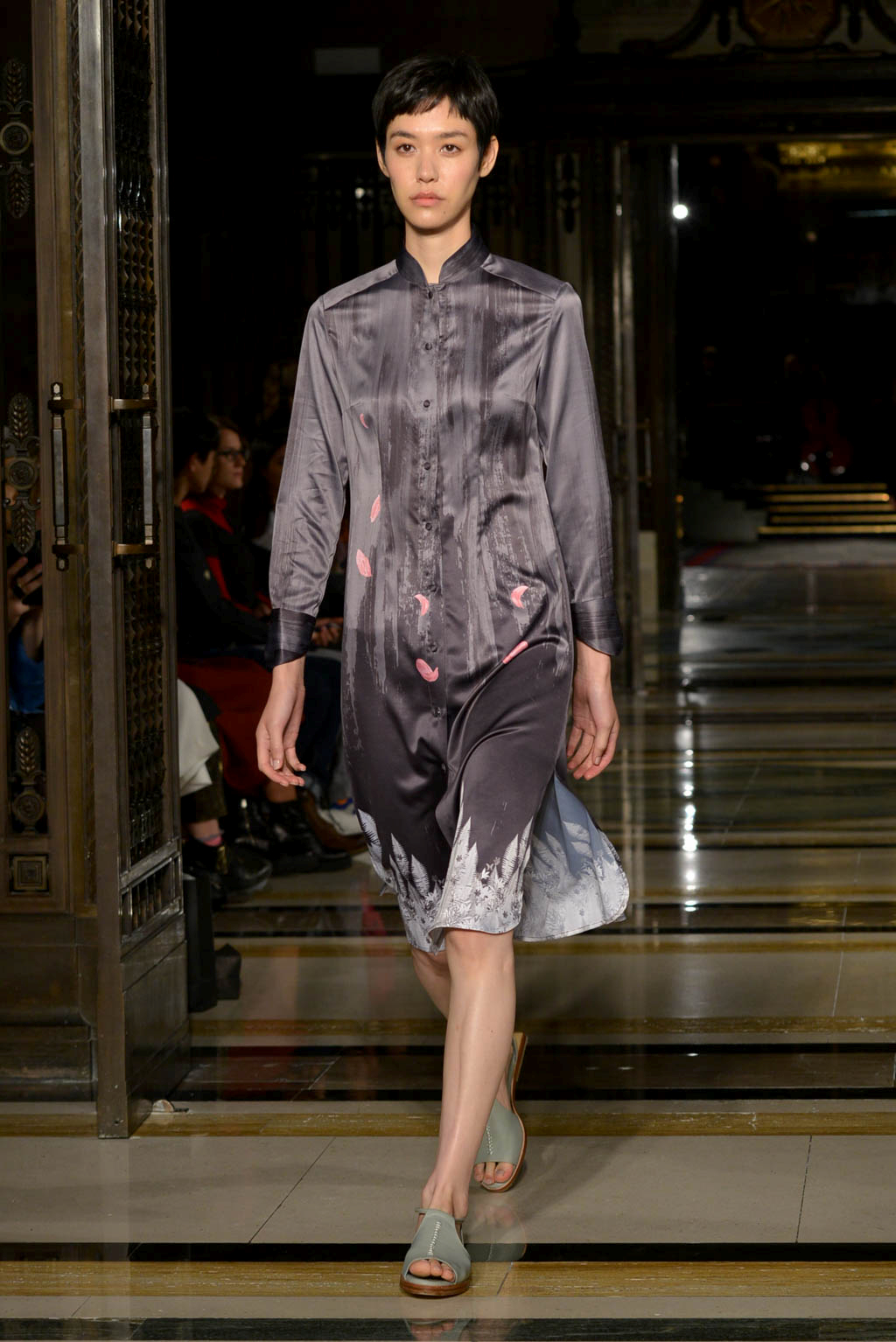The collection deploys silk knitting and print work, with oriental elements such as horse hood sleeves and mandarin sleeves which can be seen on a number of suits and dresses amongst the 33 garment collection. Also knitwear was particularly present in the form of light knitted dresses – in grey tones – which can still be worn even on the warmer of spring/summer days. The collection showed similarities to last season which included elegant pleated skirts and exposed backs and were seen here this season through backless dresses. This line embodied elegance through the use of silk knitting and also included self-developed unique jacquard and chiffon materials.