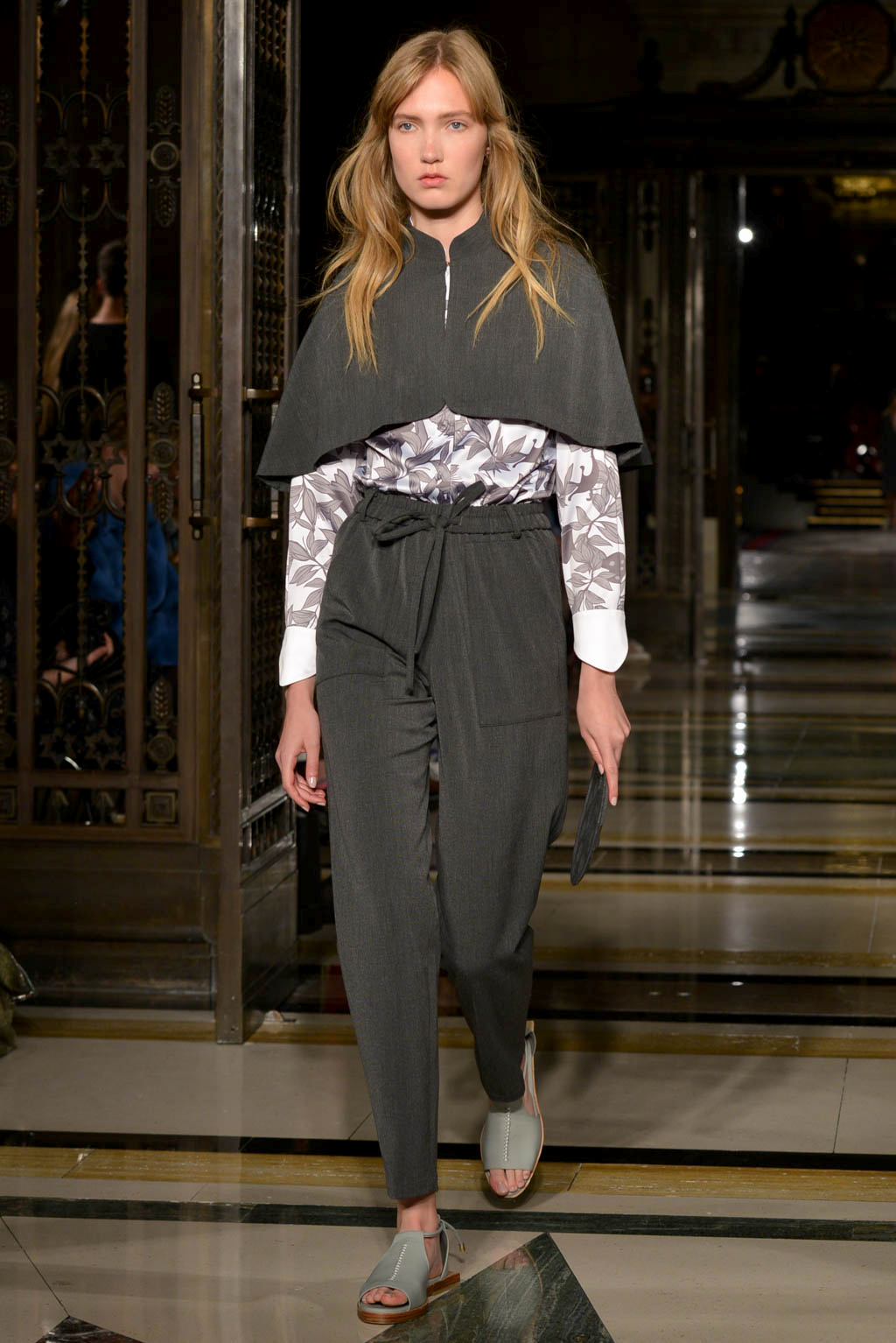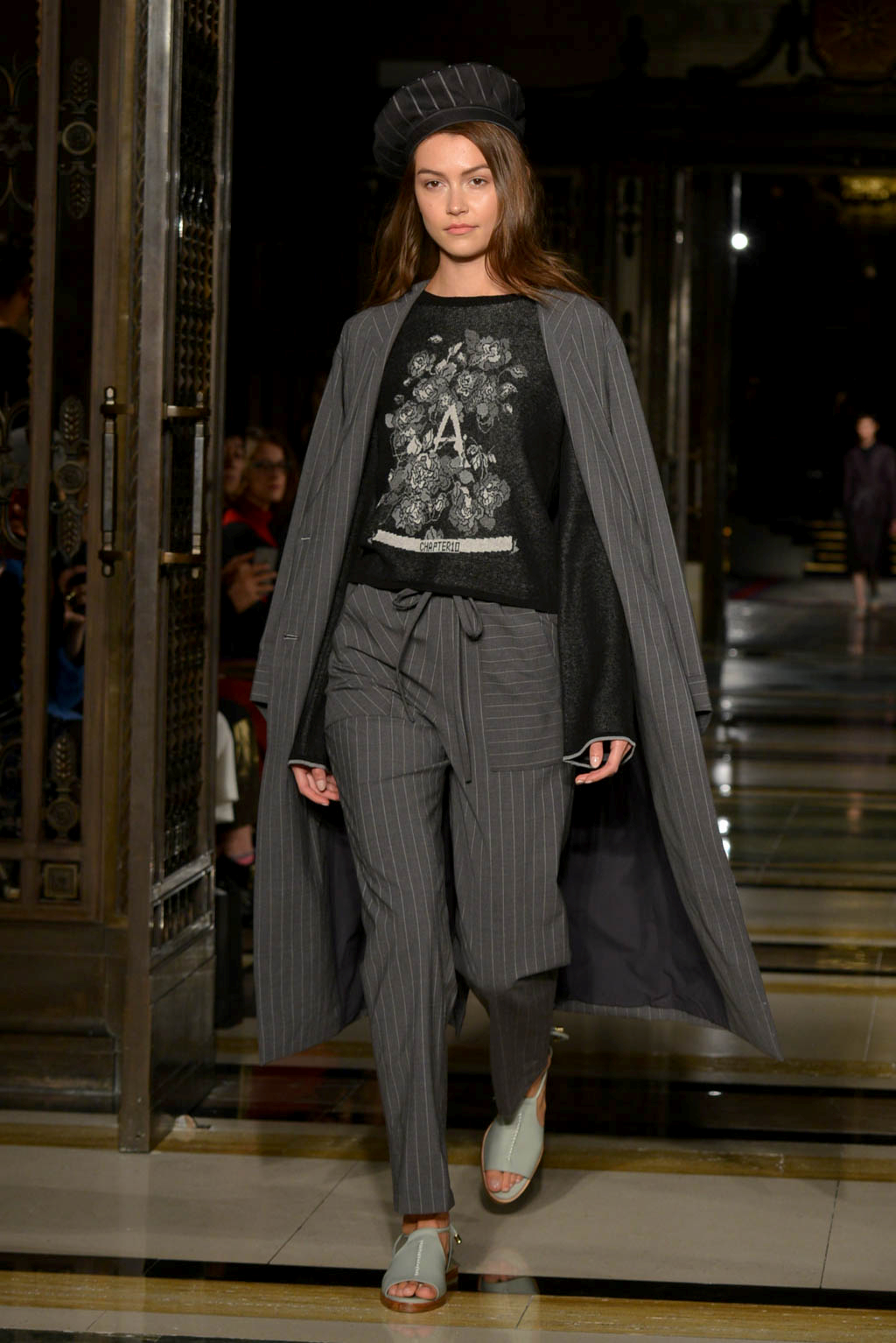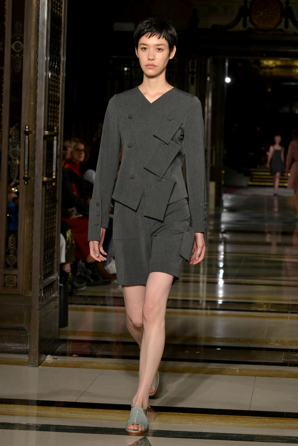 The collection deploys silk knitting and print work, with oriental elements such as horse hood sleeves and mandarin sleeves which can be seen on a number of suits and dresses amongst the 33 garment collection. Also knitwear was particularly present in the form of light knitted dresses – in grey tones – which can still be worn even on the warmer of spring/summer days. The collection showed similarities to last season which included elegant pleated skirts and exposed backs and were seen here this season through backless dresses. This line embodied elegance through the use of silk knitting and also included self-developed unique jacquard and chiffon materials.