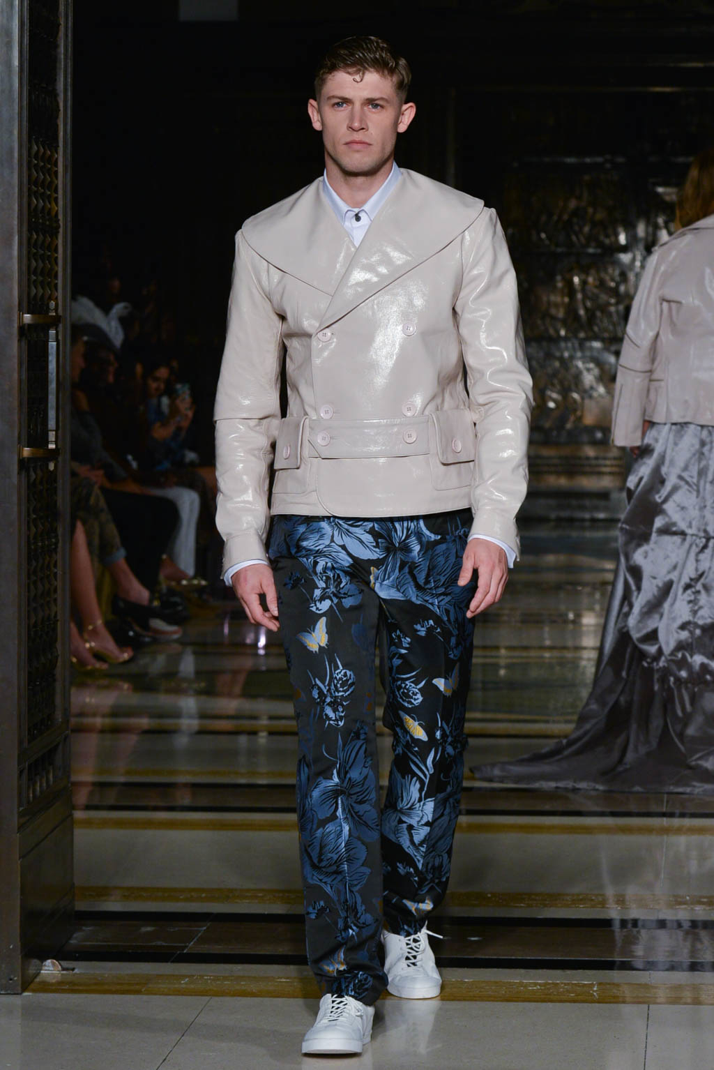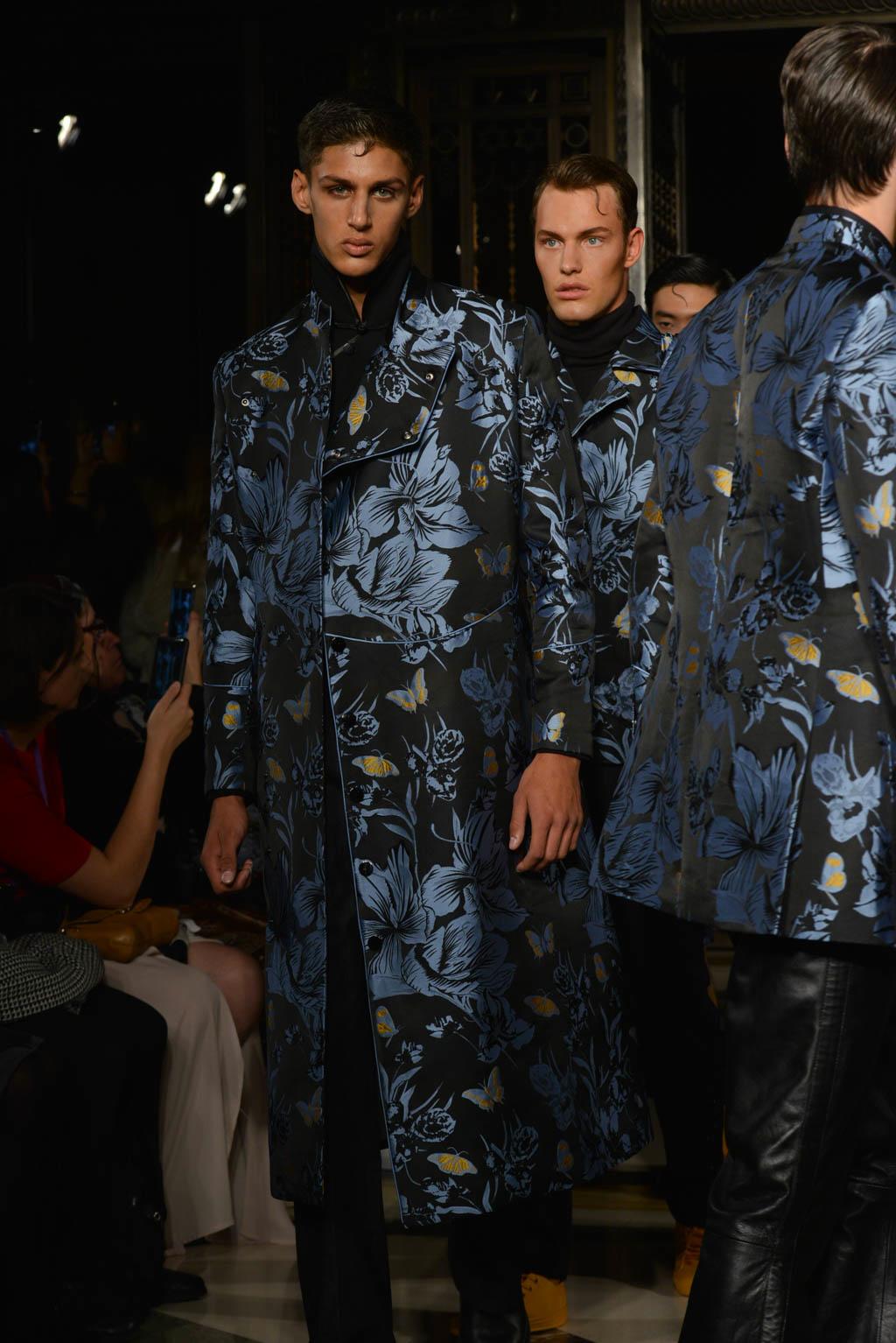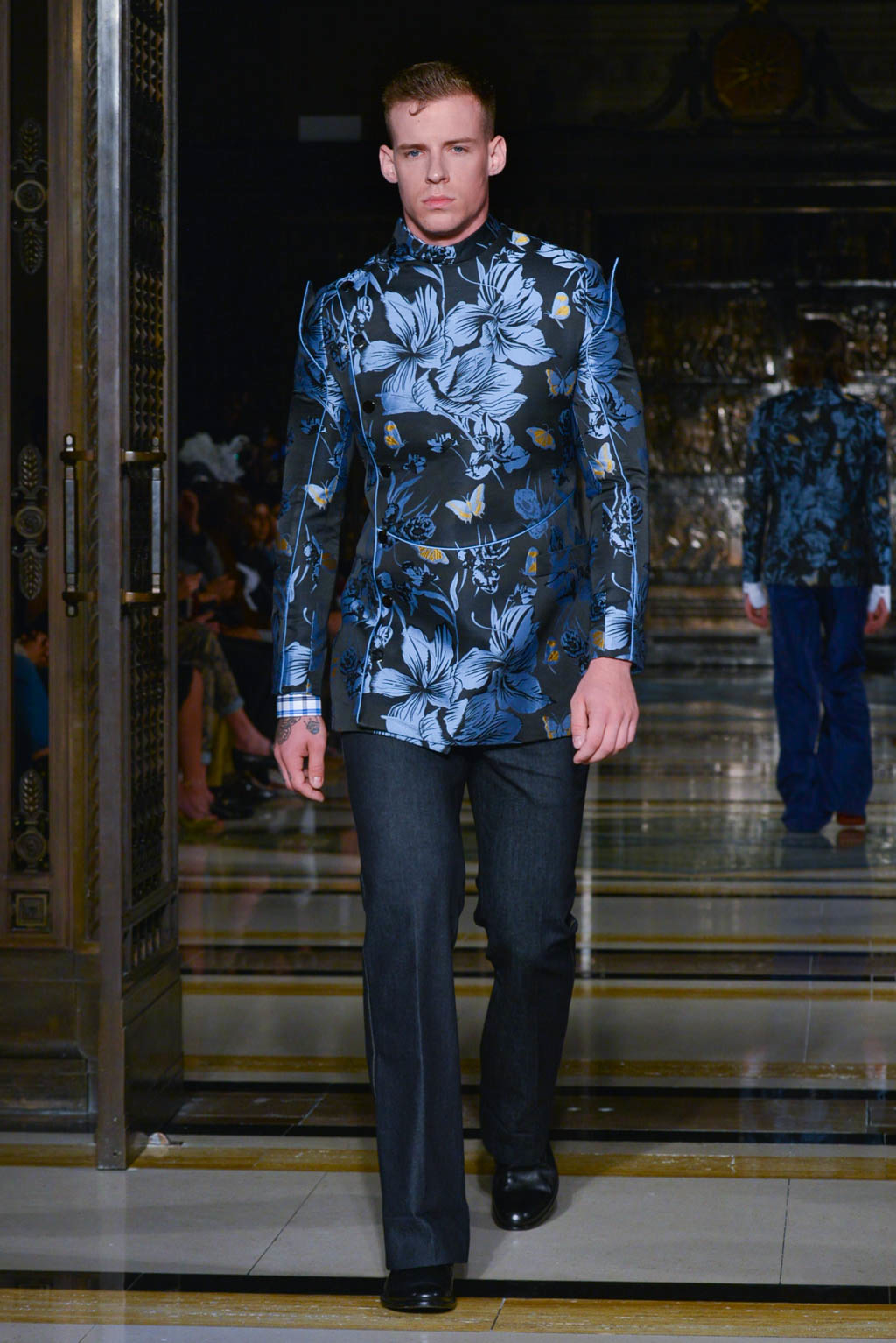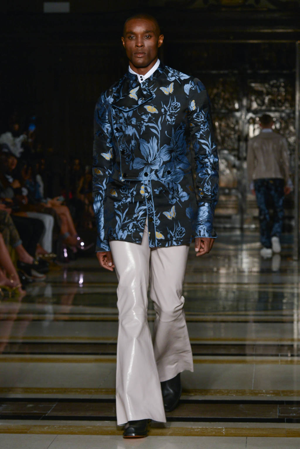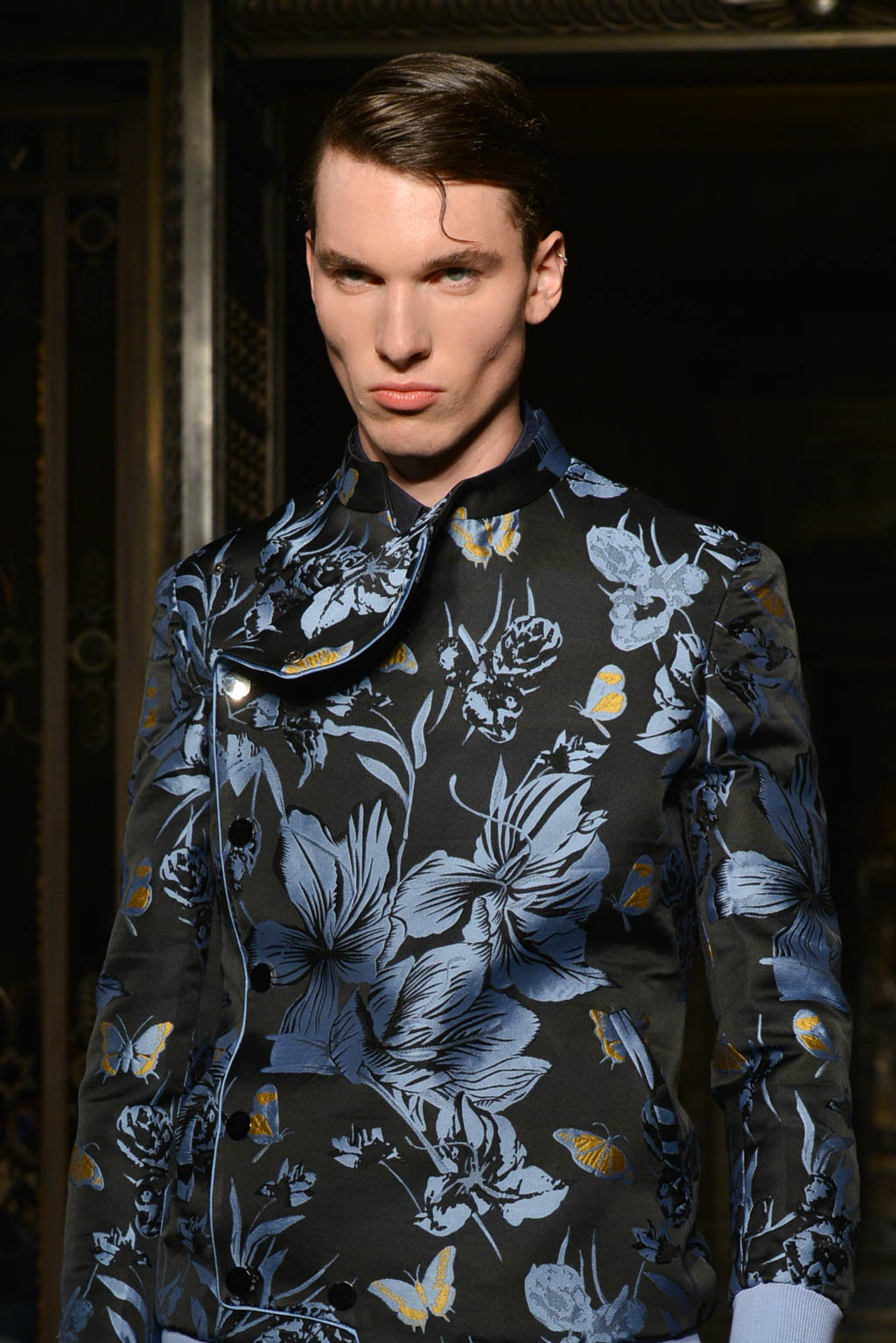 For women, a shimmering pearlescent fabric can be seen in a multitude of the pieces, perfectly encapsulating Breton’s ghostly inspiration for the season. For men, a dual blue toned hibiscus flower and butterfly print in a metallic finish is the key fabric, and is repeated in multiple shapes such as calf length overcoats and sharp blazers.