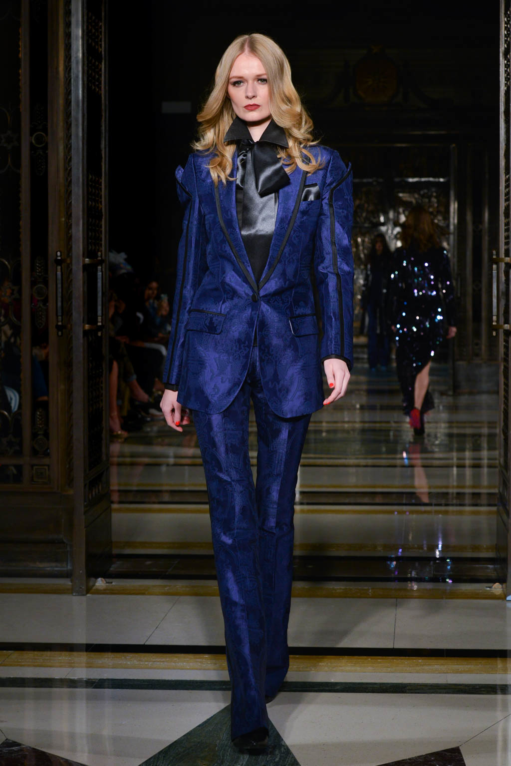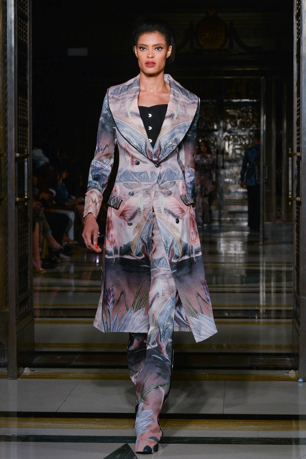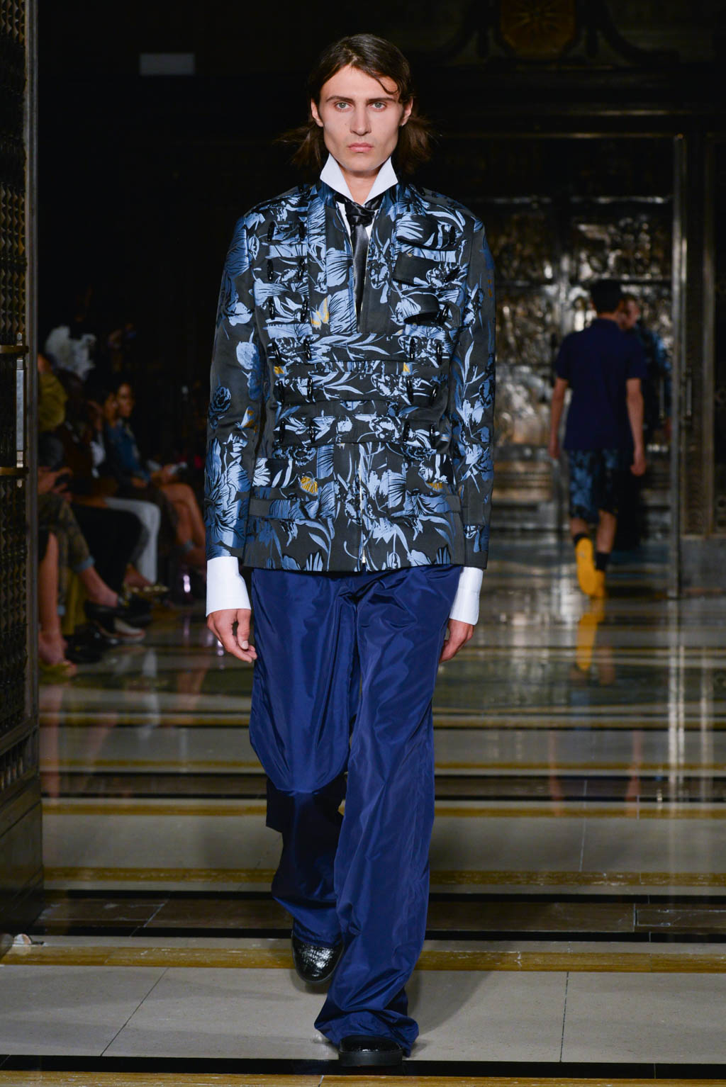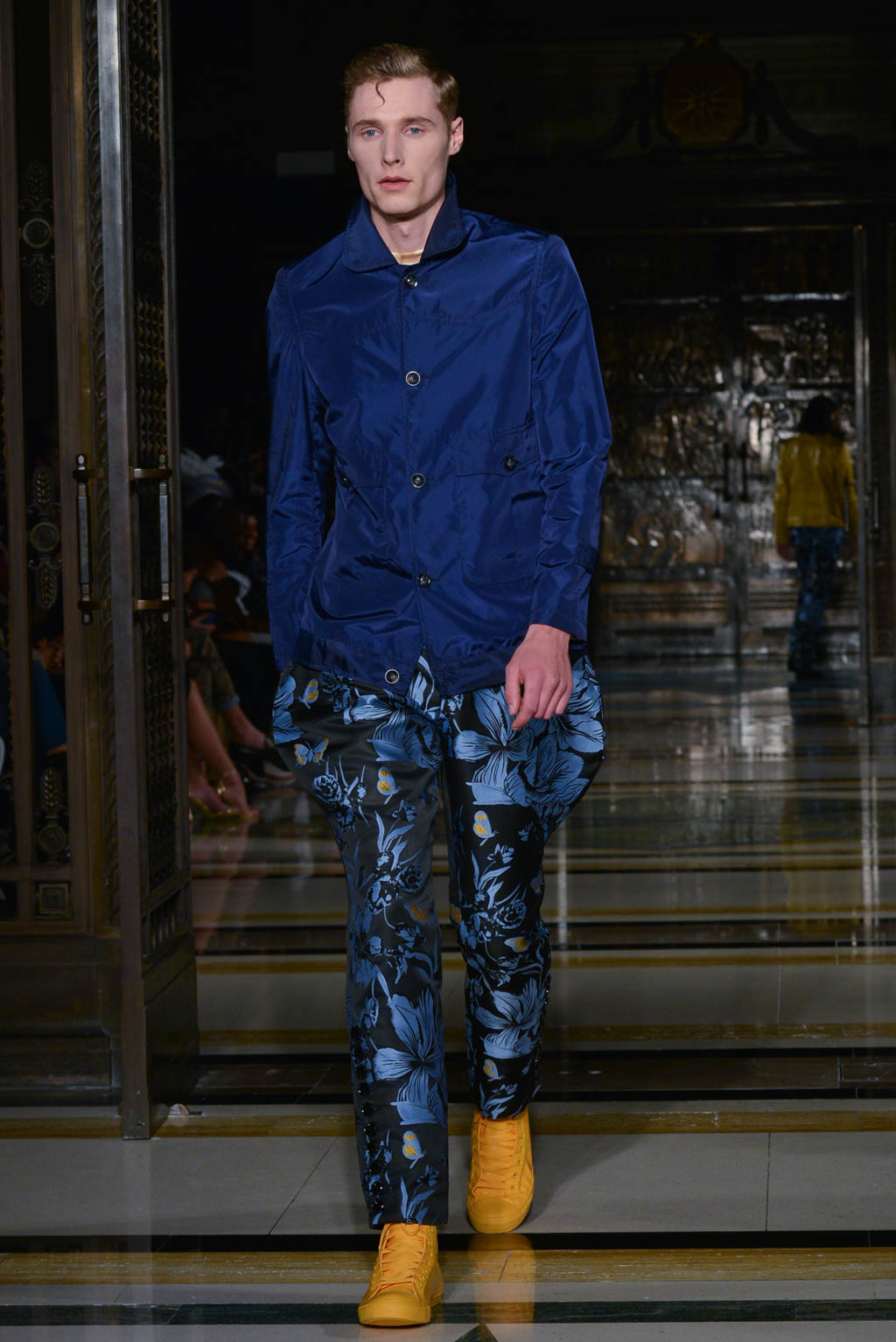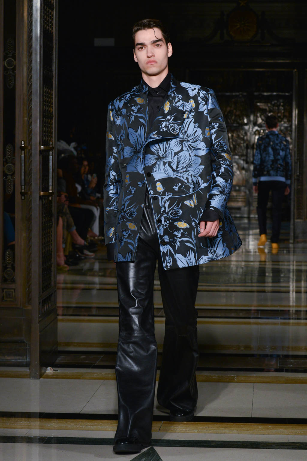 For women, a shimmering pearlescent fabric can be seen in a multitude of the pieces, perfectly encapsulating Breton’s ghostly inspiration for the season. For men, a dual blue toned hibiscus flower and butterfly print in a metallic finish is the key fabric, and is repeated in multiple shapes such as calf length overcoats and sharp blazers.