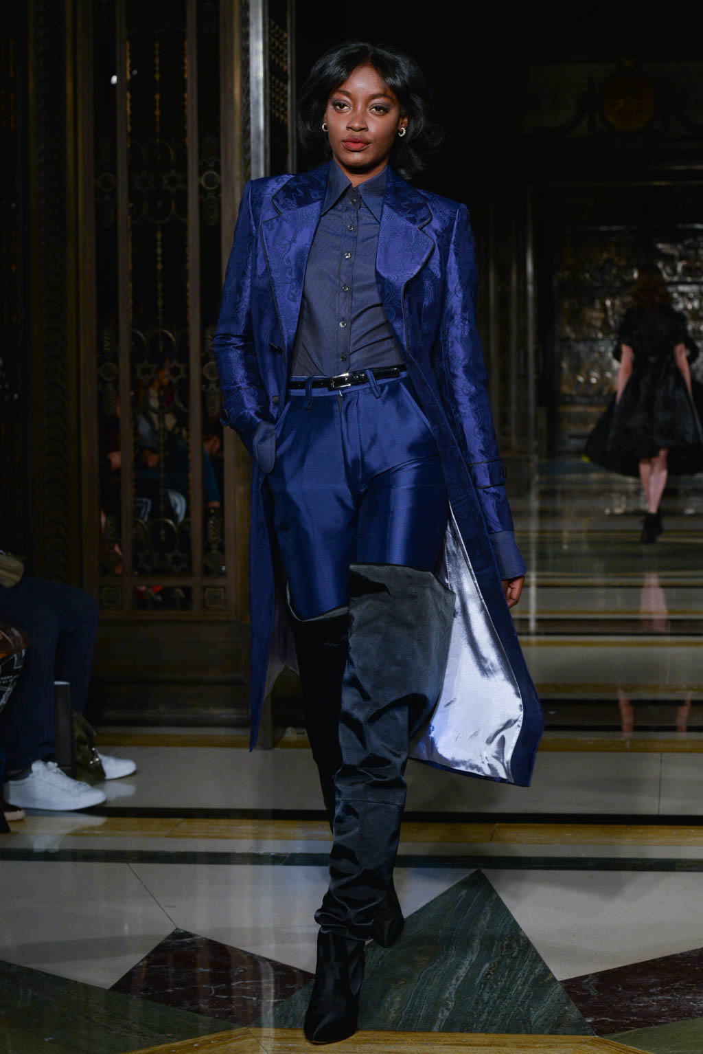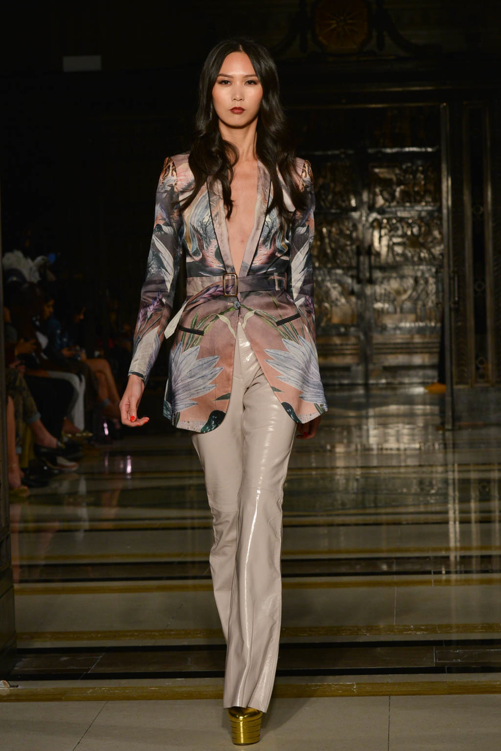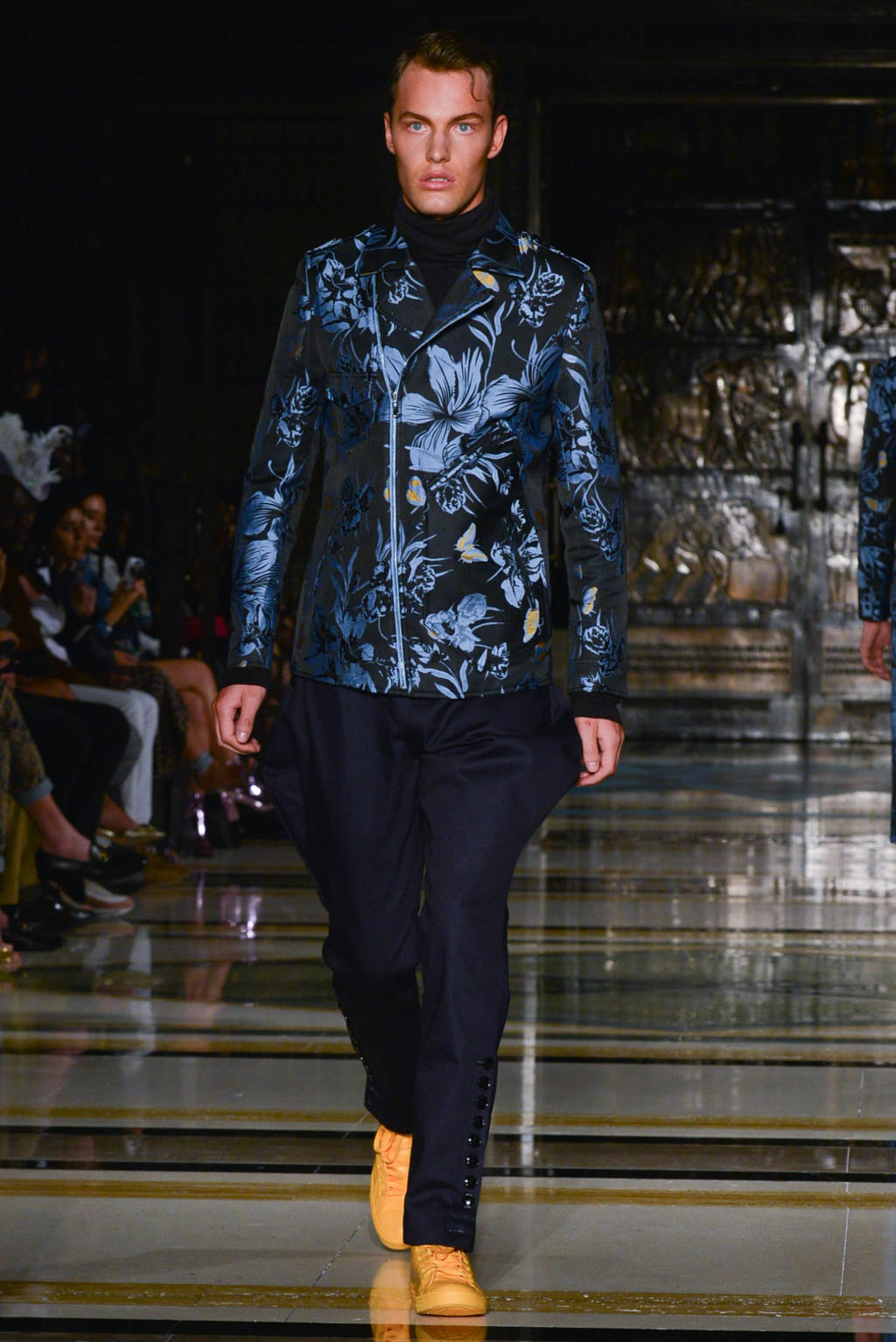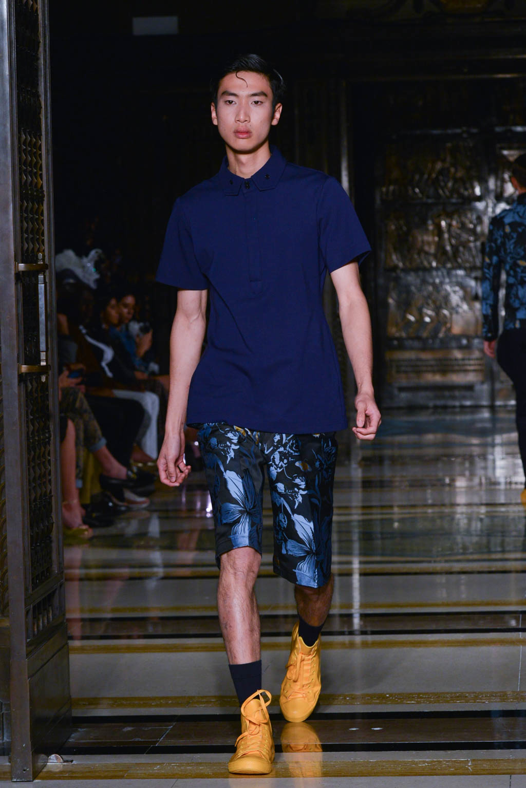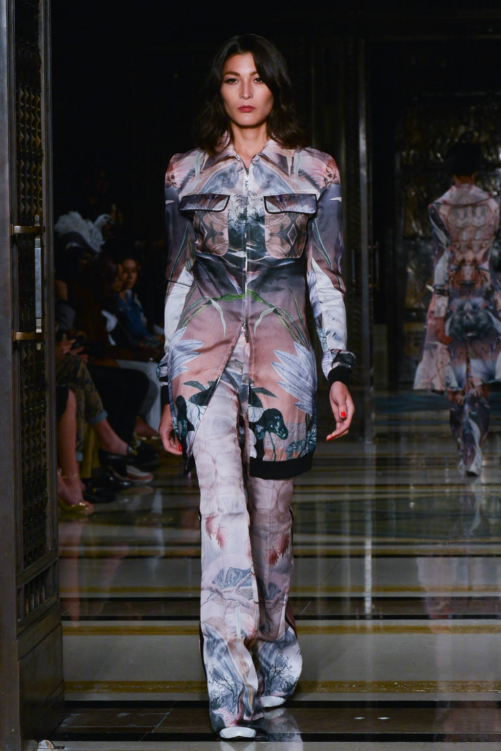 For women, a shimmering pearlescent fabric can be seen in a multitude of the pieces, perfectly encapsulating Breton’s ghostly inspiration for the season. For men, a dual blue toned hibiscus flower and butterfly print in a metallic finish is the key fabric, and is repeated in multiple shapes such as calf length overcoats and sharp blazers.