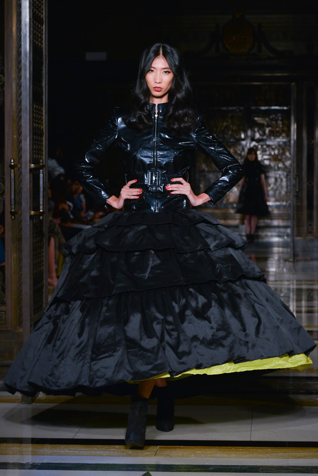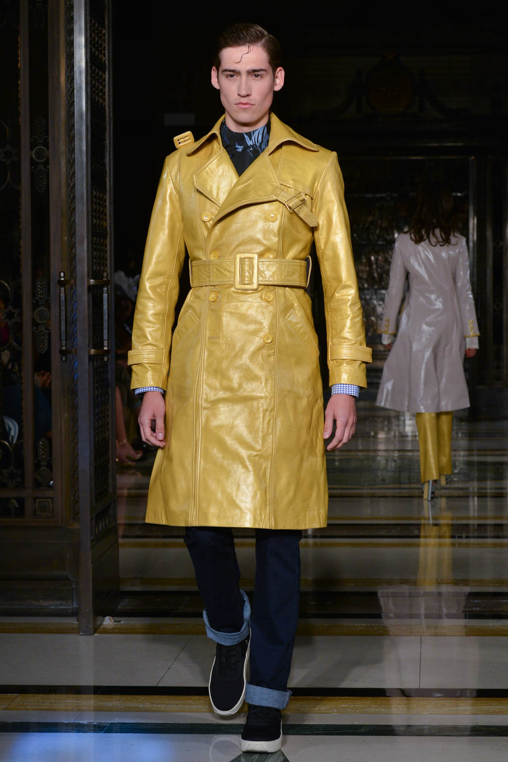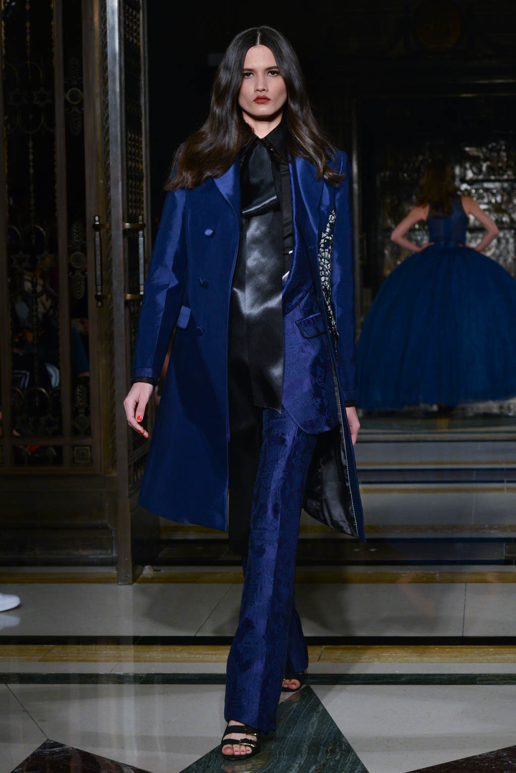 Power dressing is a key trend shown, with trenches and tailored pieces exhibited throughout. Double breasted jackets are paired with flared trousers for men, altering the traditional take on men’s smart wear. Blazers are used in conjunction with evening dresses which provide a paradoxical view of the silhouette. The standout look was in this style; a fitted black jacket in a finish resembling oil, paired with a black voluminous crinoline skirts with multiple layers of ruffles and a final touch of a bright yellow underskirt peeking out from beneath. In terms of colour, this was very simple, however the combination of various elements made it a head turner.
