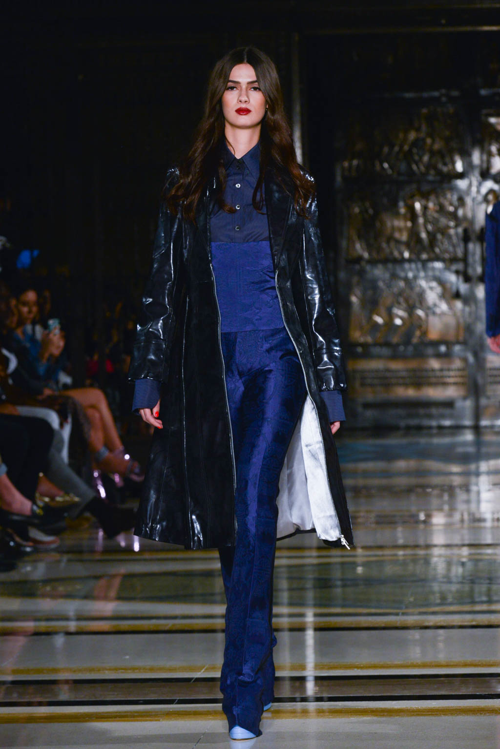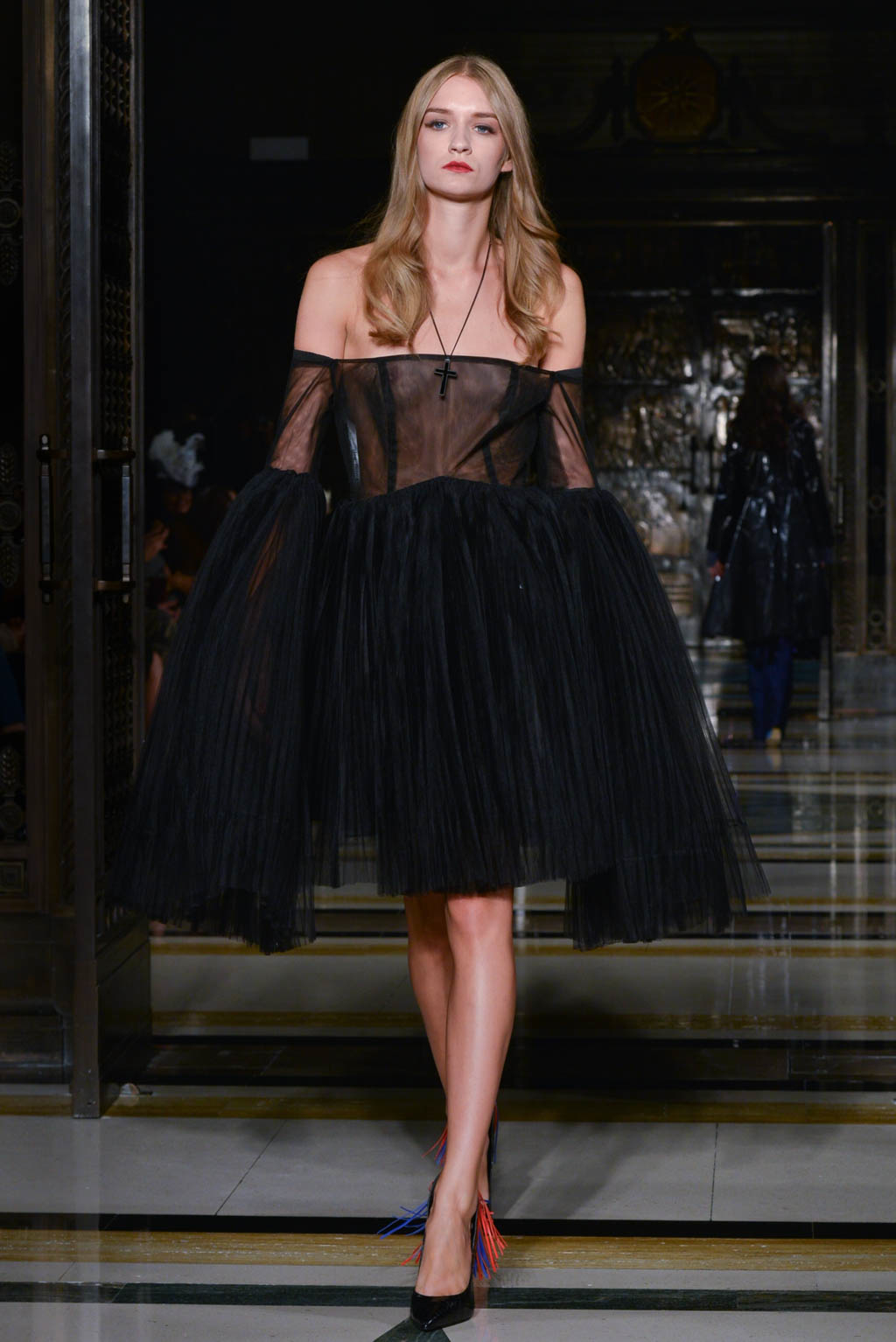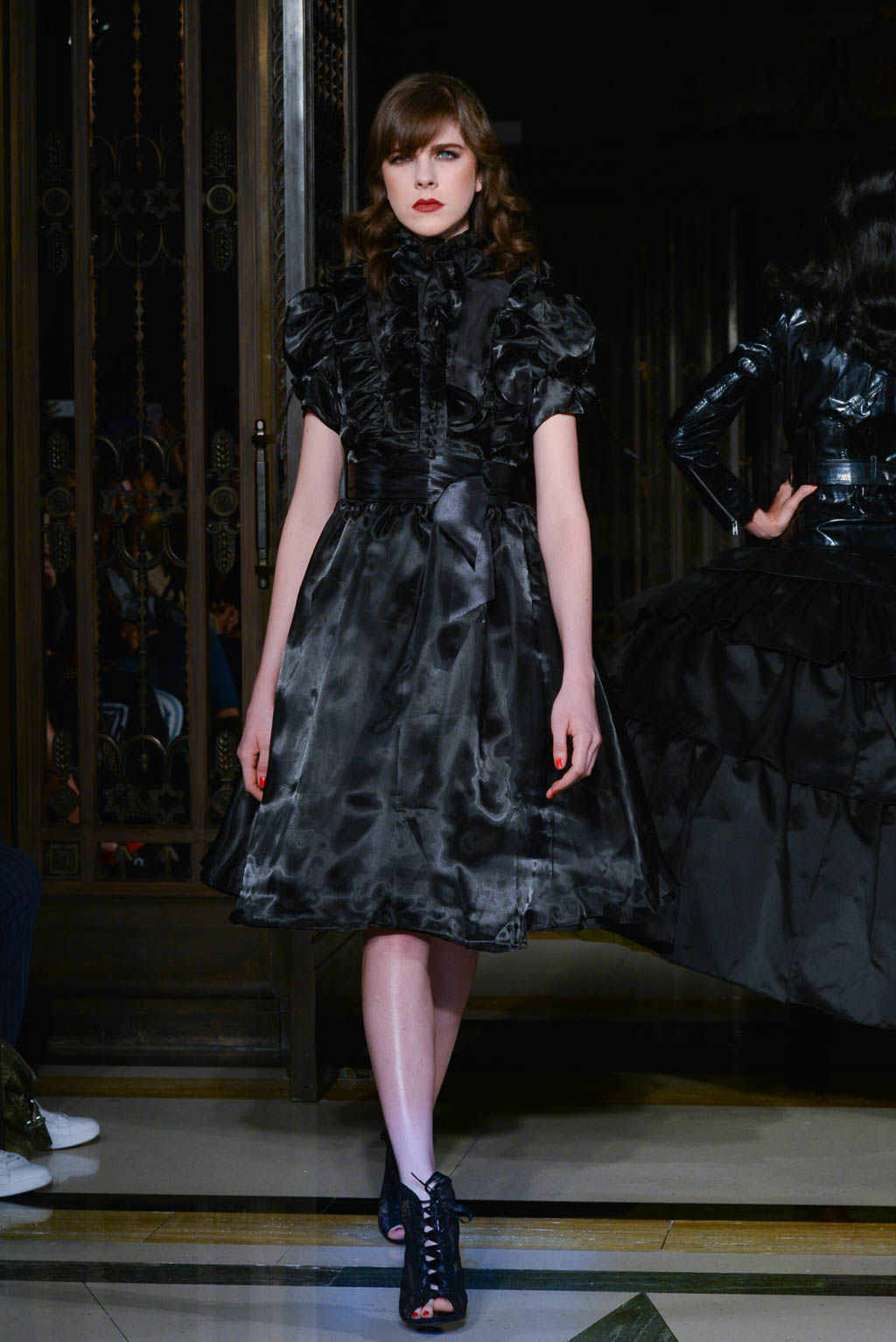 Power dressing is a key trend shown, with trenches and tailored pieces exhibited throughout. Double breasted jackets are paired with flared trousers for men, altering the traditional take on men’s smart wear. Blazers are used in conjunction with evening dresses which provide a paradoxical view of the silhouette. The standout look was in this style; a fitted black jacket in a finish resembling oil, paired with a black voluminous crinoline skirts with multiple layers of ruffles and a final touch of a bright yellow underskirt peeking out from beneath. In terms of colour, this was very simple, however the combination of various elements made it a head turner.