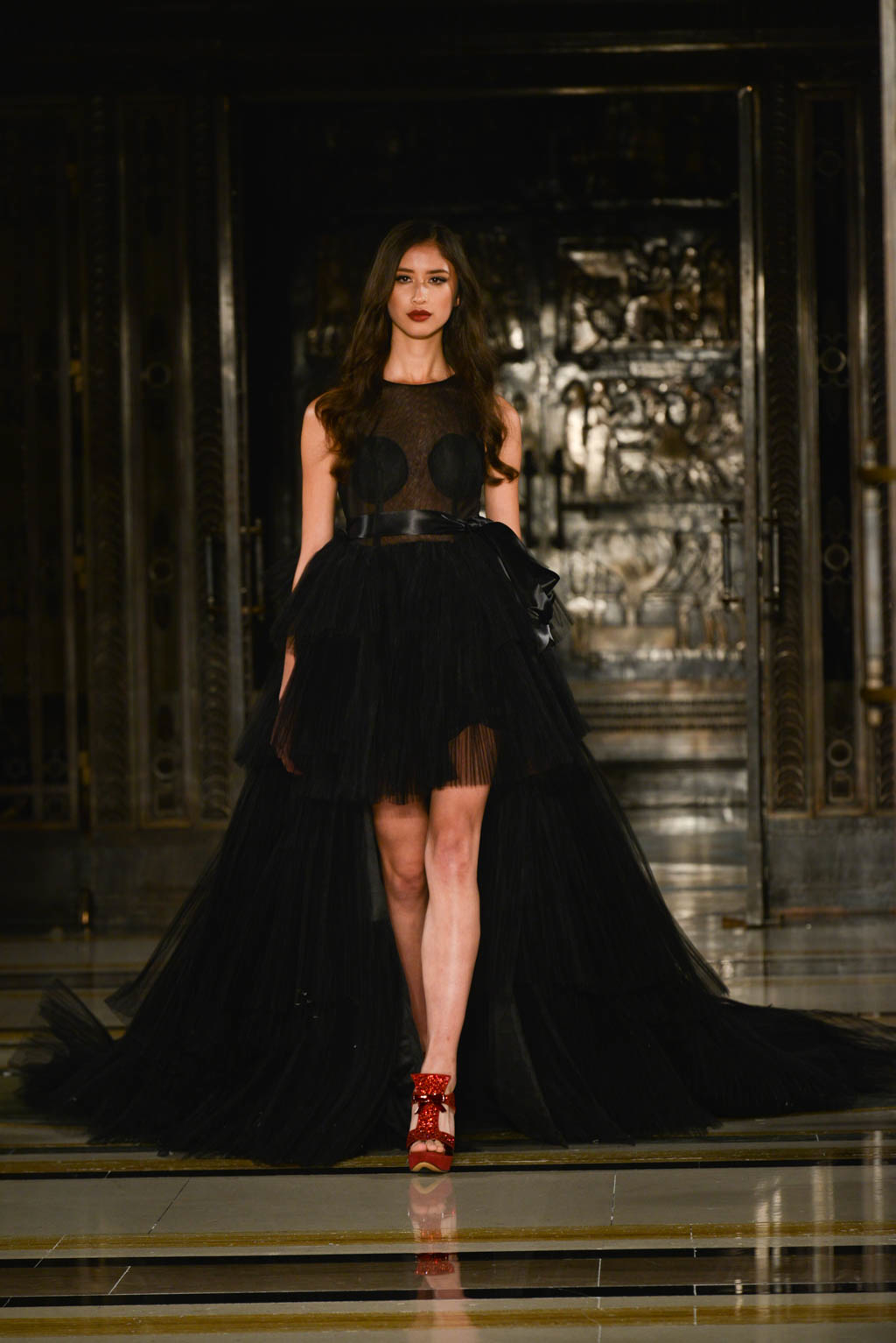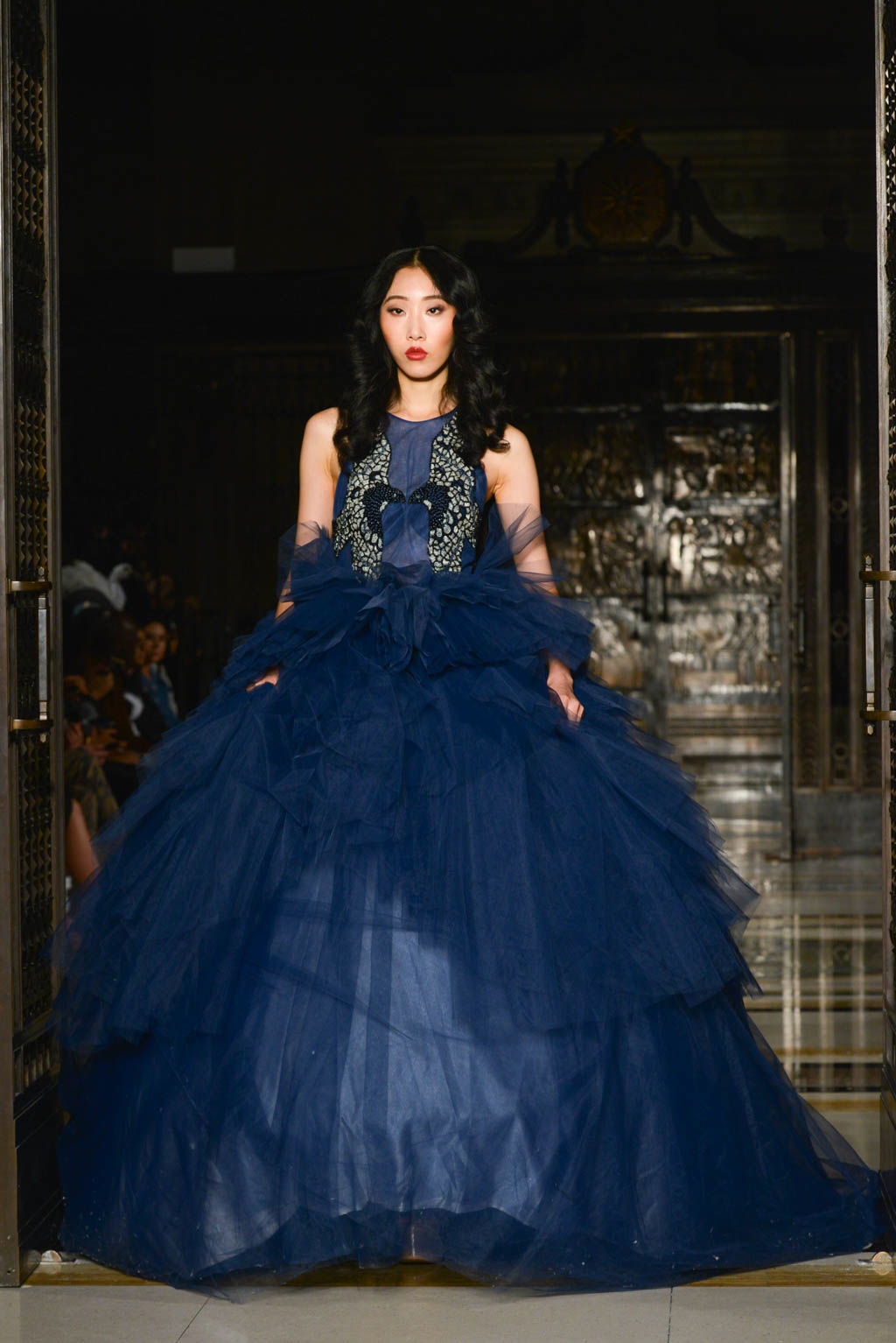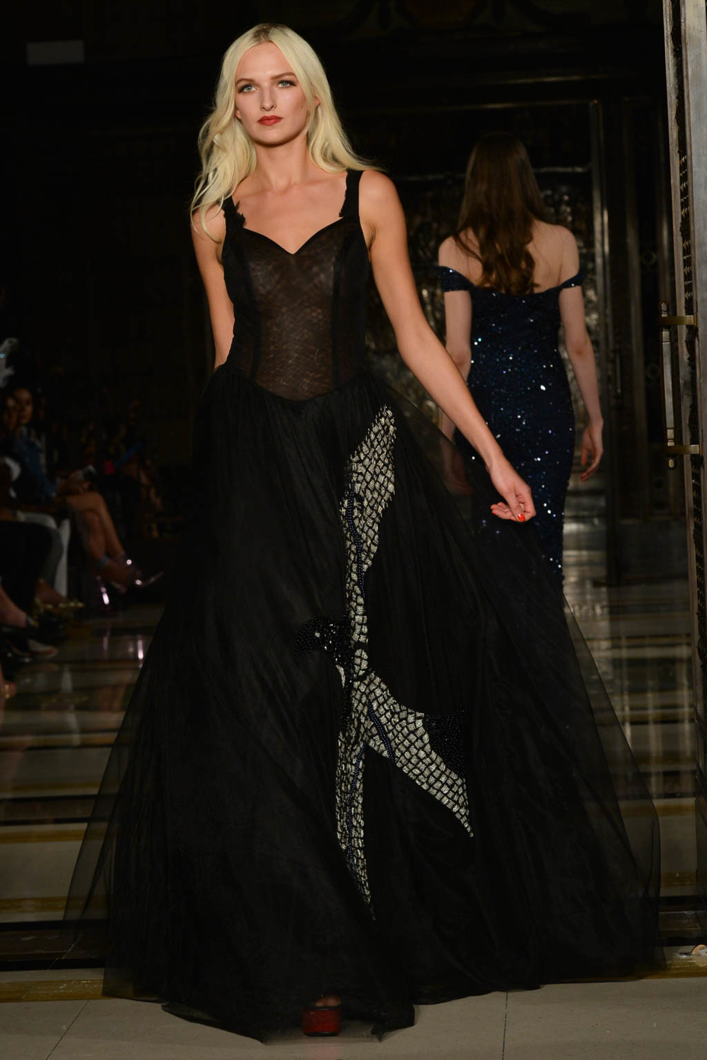 Formalwear is made all the more decadent with fishtail and floor length hemlines, off the shoulder detailing and sweetheart necklines. A glittered pattern in shades of grey and silver is evocative of snakeskin and is used sparingly as a final touch as if it has been brushed on. Delicate touches of ruffles, organza and feathers move delicately with the models and are reminiscent of a translucent form.