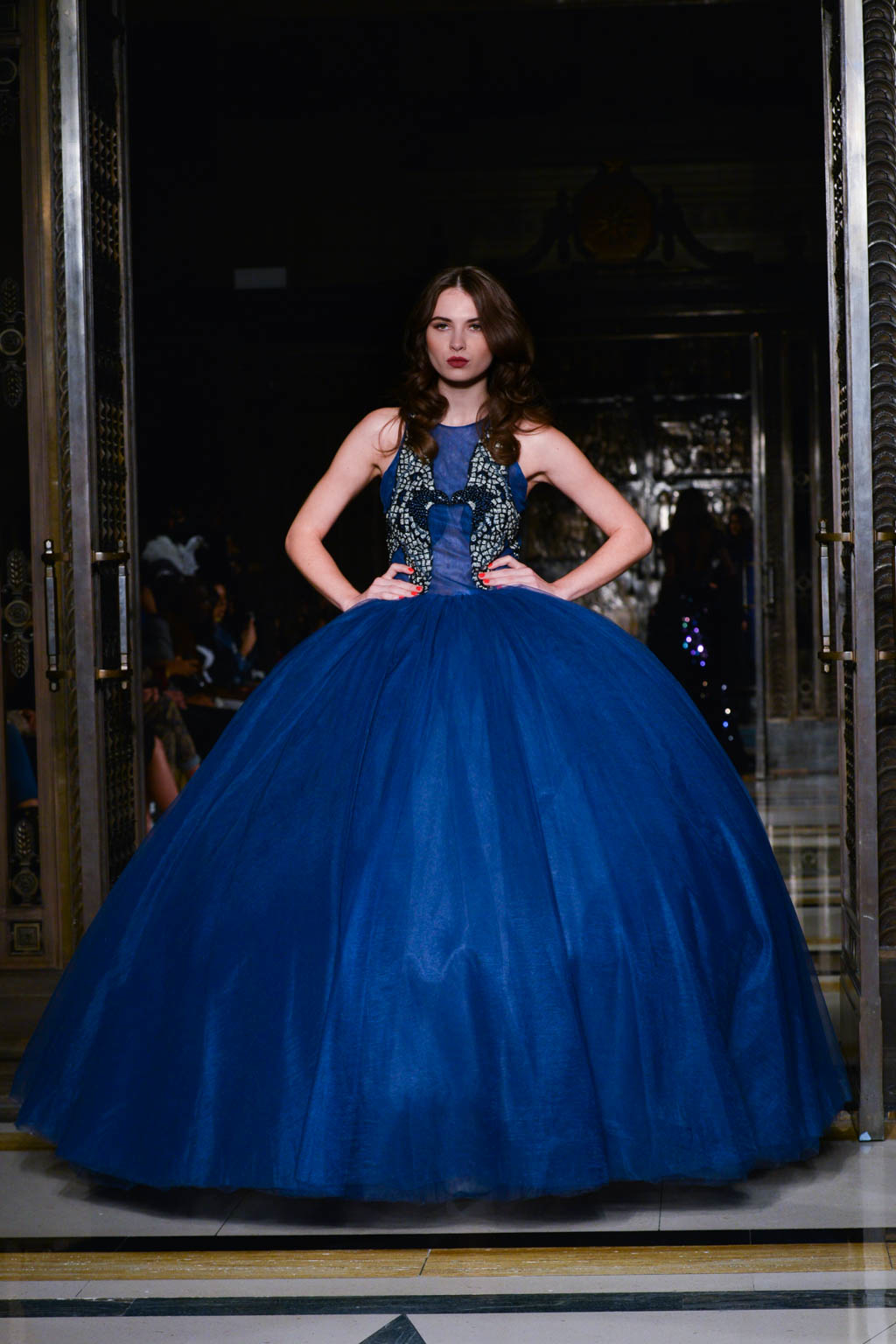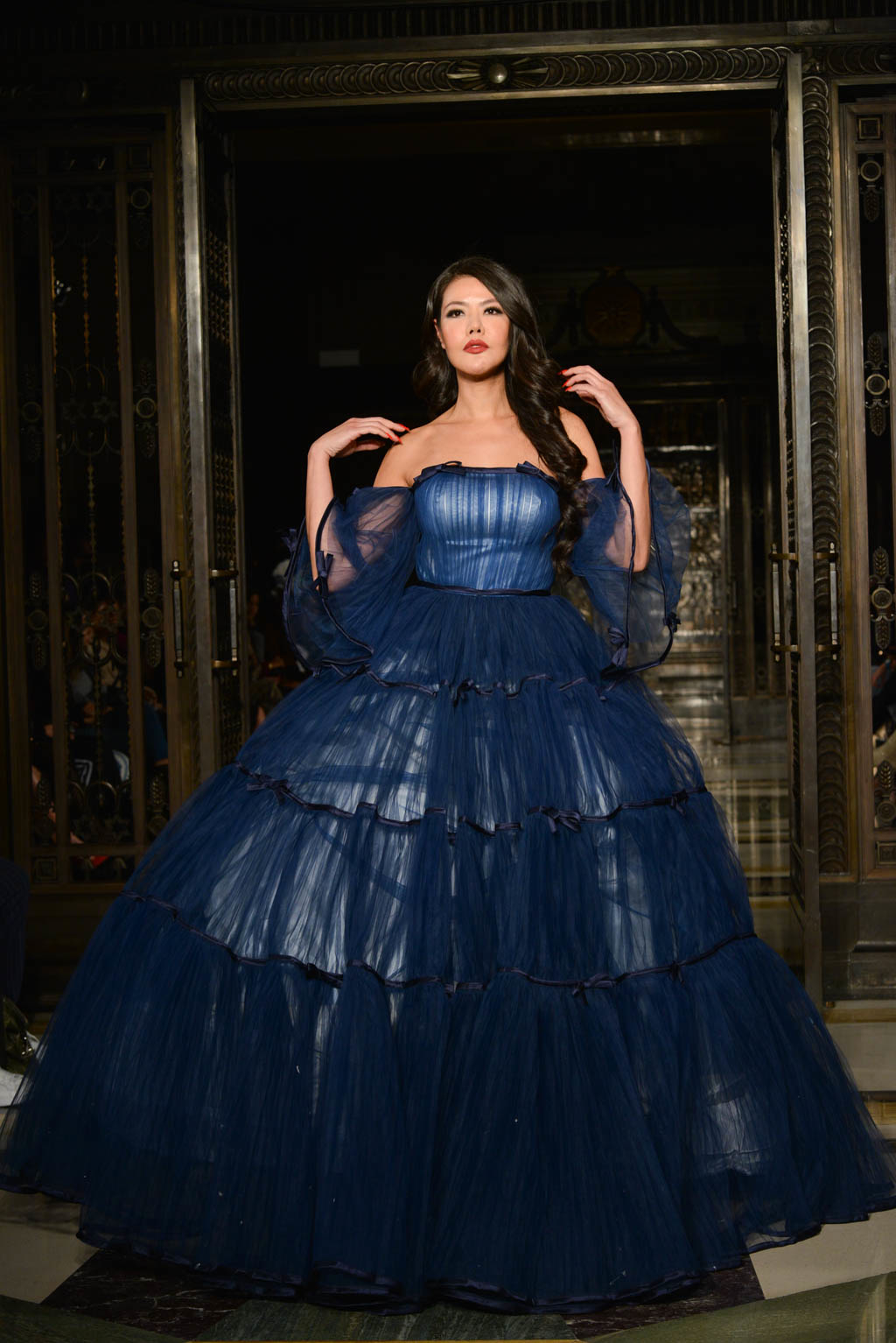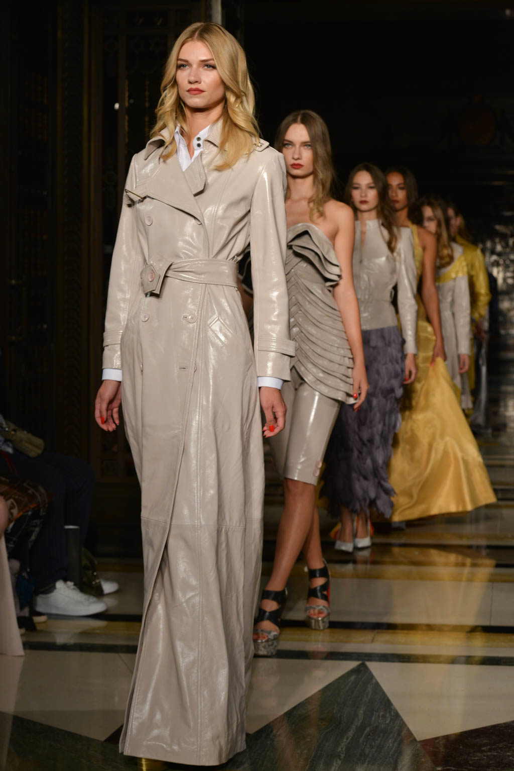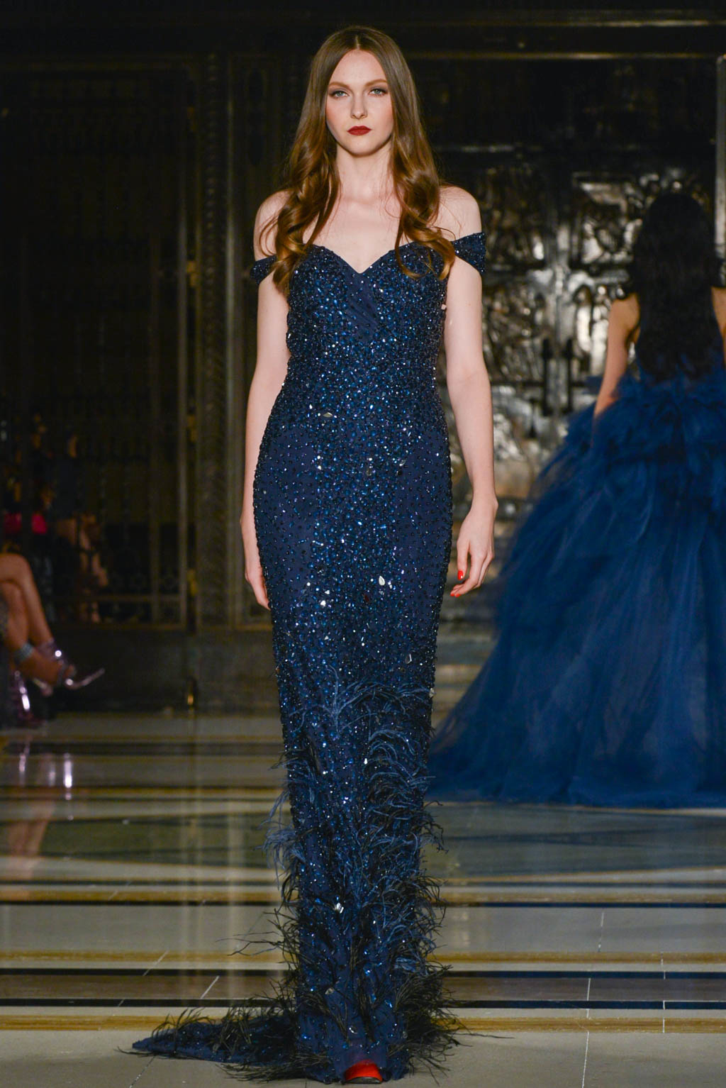 Formalwear is made all the more decadent with fishtail and floor length hemlines, off the shoulder detailing and sweetheart necklines. A glittered pattern in shades of grey and silver is evocative of snakeskin and is used sparingly as a final touch as if it has been brushed on. Delicate touches of ruffles, organza and feathers move delicately with the models and are reminiscent of a translucent form.