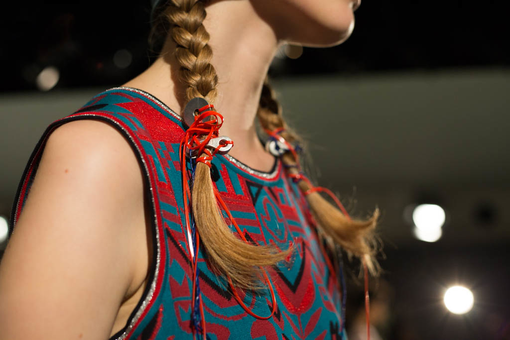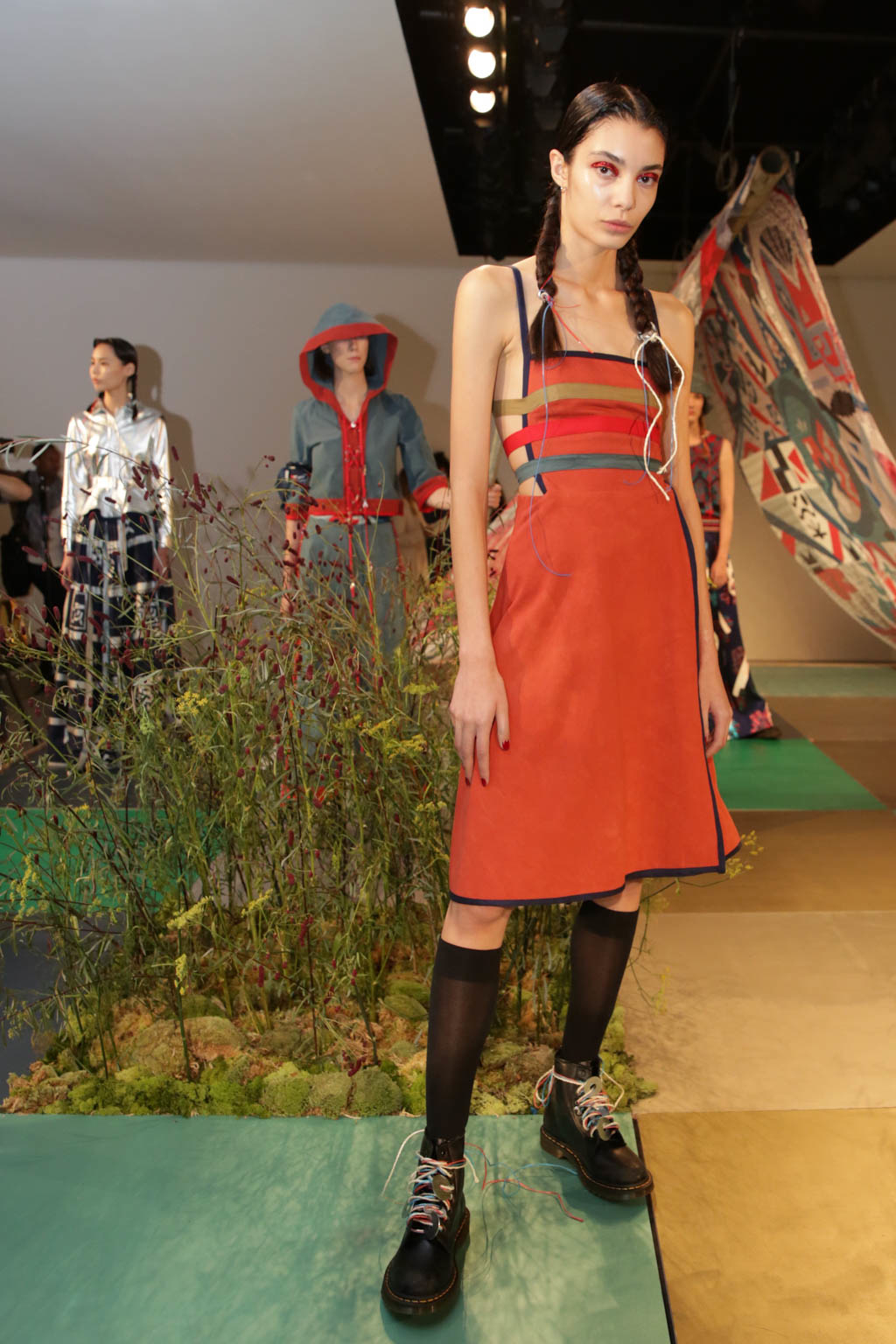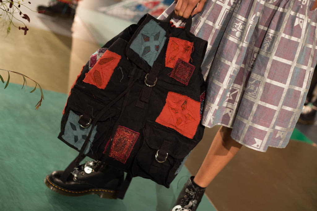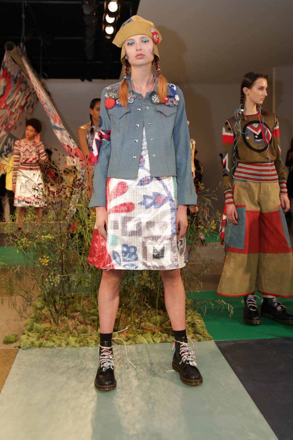Braided hair and Dr.Martens shoes accompanied by knee high sheer socks are prevalent amidst the organic motifs and muted hand-dyed hues, giving the organic styles a harsher edge. Bold eye make-up in red or silver glitter act as the antithesis to hand collaged prints, hand dyed fabrics, appliqué and stencil silk screen prints. Khaki trousers patched with red and blue are accompanied by a khaki jumper with stripe and motif design, and accessorised with coloured strands of blue and red affixed to the end of sleek braided hair, encapsulates the “girls take a hike” concept of fashionable outdoor wear.