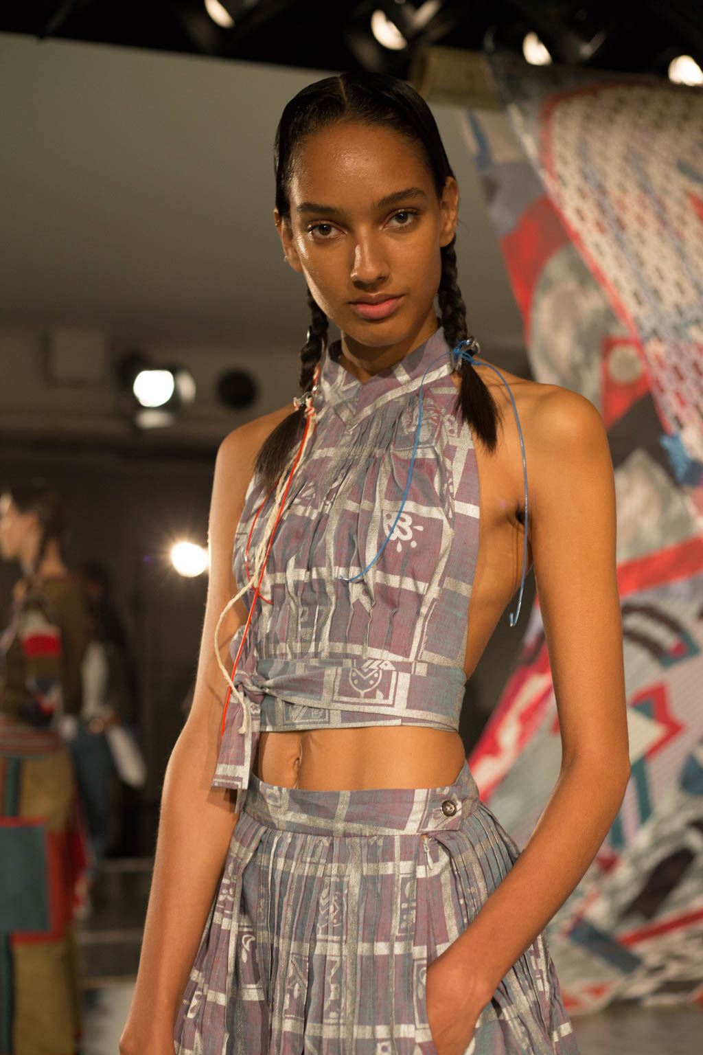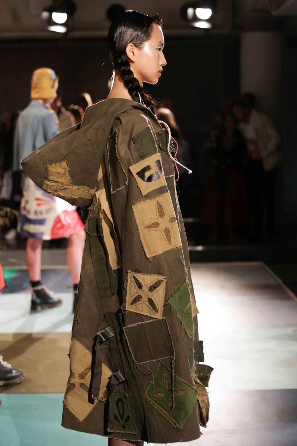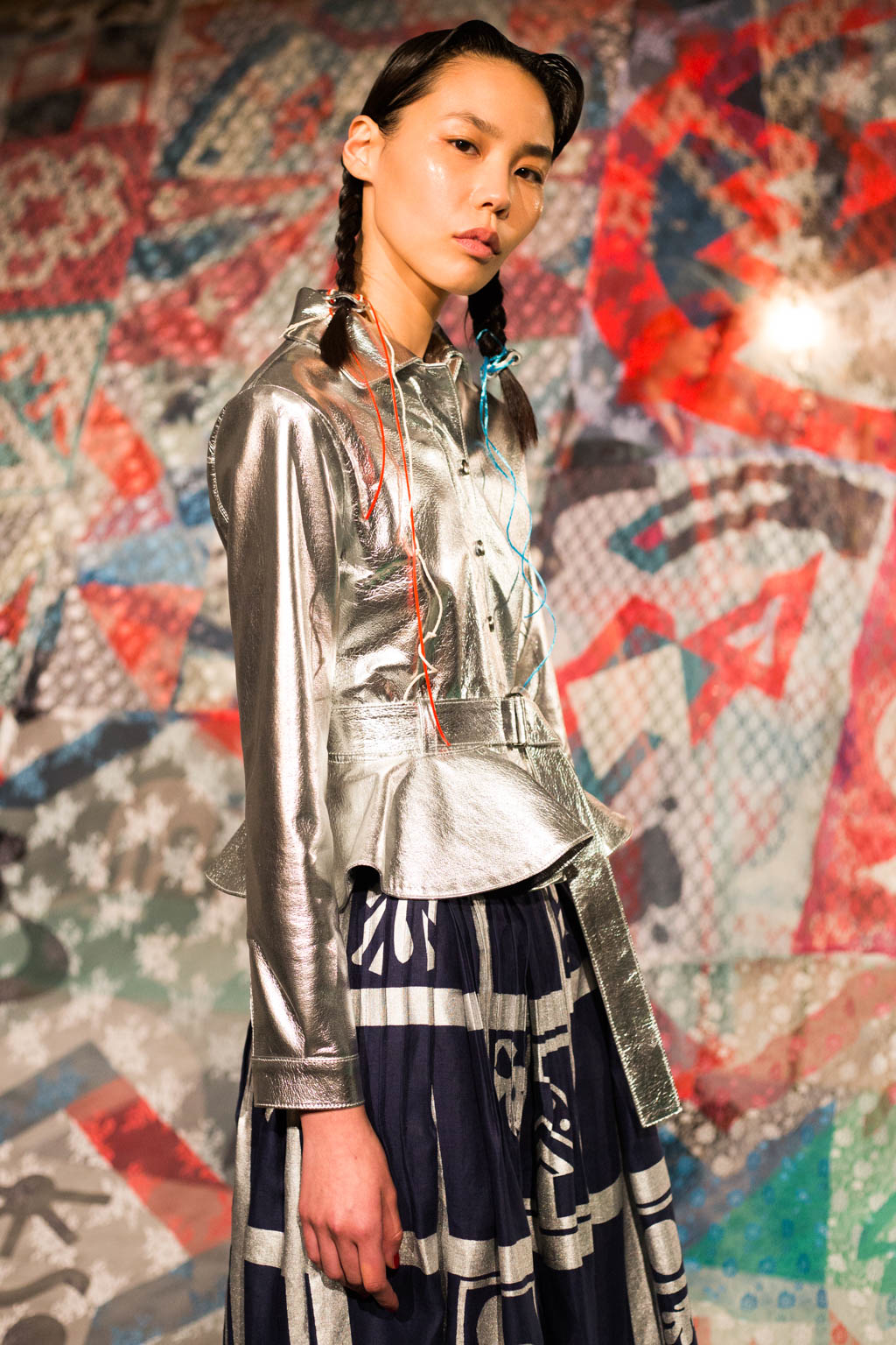 Braided hair and Dr.Martens shoes accompanied by knee high sheer socks are prevalent amidst the organic motifs and muted hand-dyed hues, giving the organic styles a harsher edge. Bold eye make-up in red or silver glitter act as the antithesis to hand collaged prints, hand dyed fabrics, appliqué and stencil silk screen prints. Khaki trousers patched with red and blue are accompanied by a khaki jumper with stripe and motif design, and accessorised with coloured strands of blue and red affixed to the end of sleek braided hair, encapsulates the “girls take a hike” concept of fashionable outdoor wear.