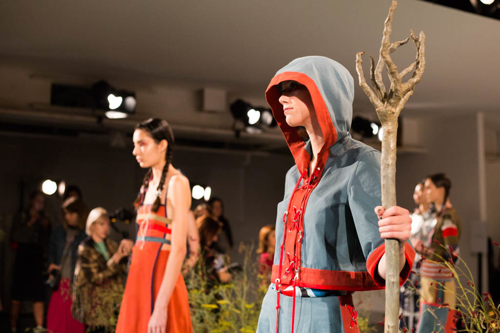 The stand out piece that really draws on Sadie Williams’s inspiration of the Kindred of the Kibbo Kift is a hooded blue top and wide leg pant combination, featuring red eyelet lacing along the legs and chest; all of which is accompanied by a large wooden staff which is meant to reiterate the free-spirited and outdoorsy nature of Sadie’s collection.