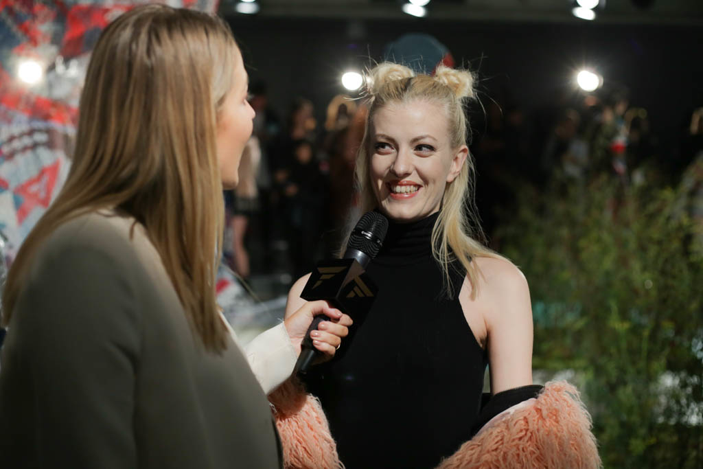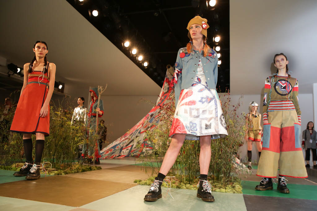 Sadie Williams’s collection is inspired by a world of outdoor adventure and free spirits, made evident by the foliage and large patterned tent like structure amidst the models. Blocky boldness, punches of colour and stencil silk screen prints add a whole new meaning to the term “glamping” and “outdoors clothing”.