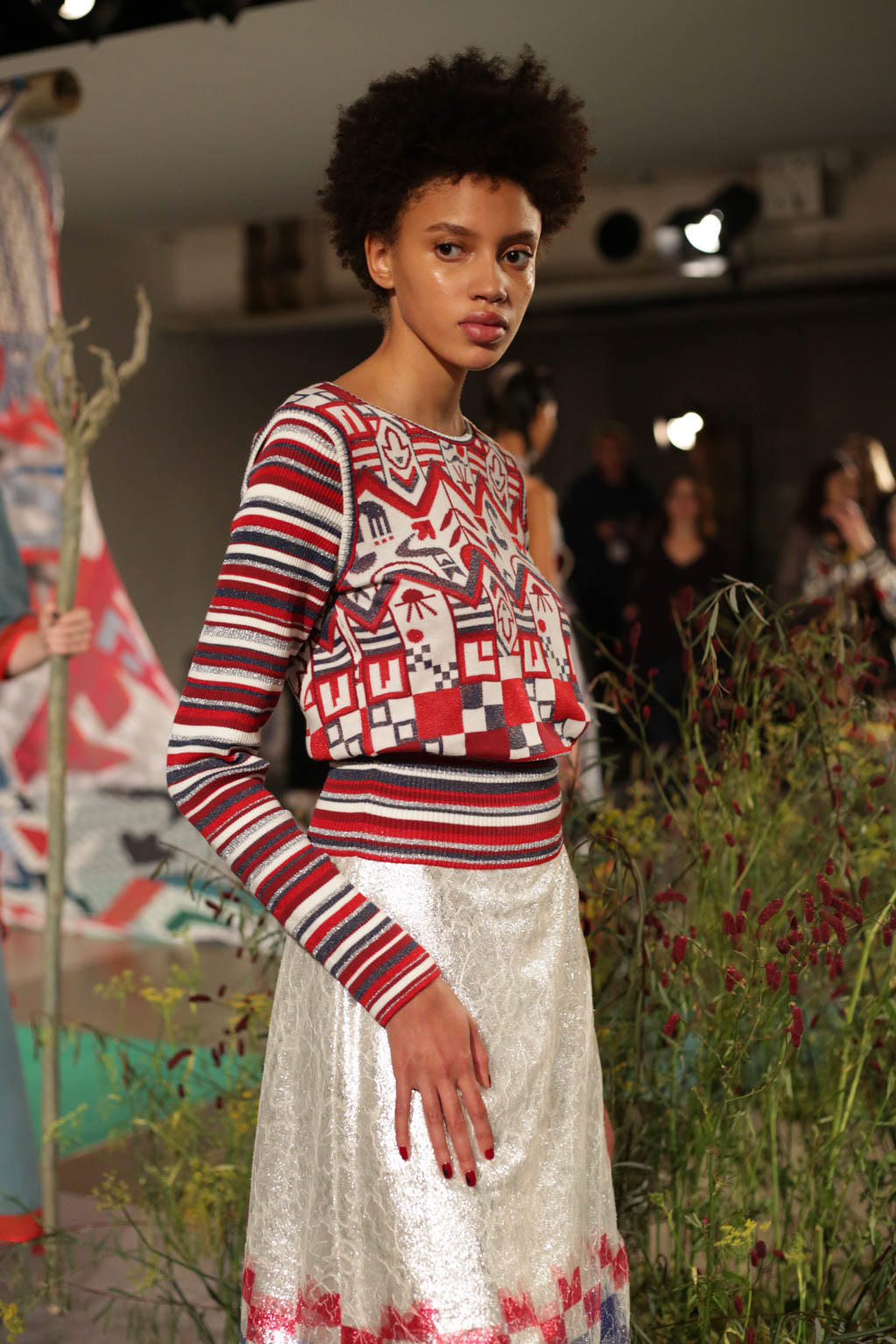 Williams’s intention of sparkling, vivid fabrications is further evident through a red and white knitted jumper with striped sleeves, paired with a glimmering girlish silver skirt. The whole ensemble is given the rustic roughness through being paired with Dr. marten boots fixed with silver buckles with give a punch of strength to a somewhat feminine combination.