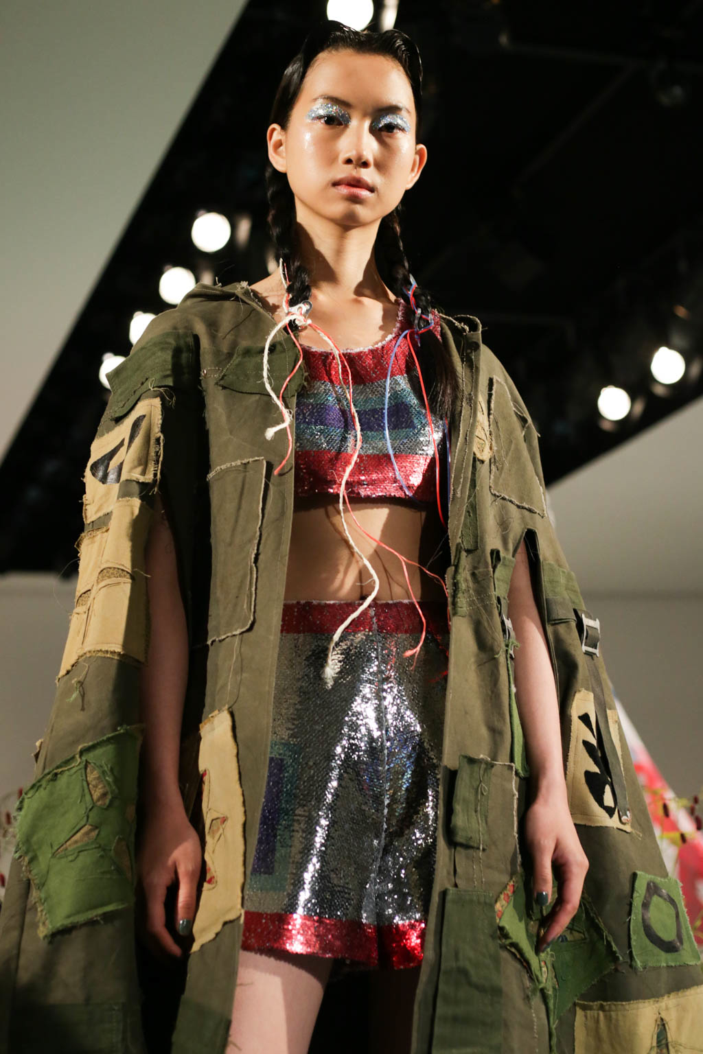 The pieces could be described as having a “disco meets meadow” theming which is significantly evident through a sequinned co-ord beneath an oversized khaki printed jacket. It can also be seen through a khaki vest and short combo, complete with eyelet detailing, neck scarf and adorned in patched.. This Girl Scout inspired look is accessorised with a silver hat which really entwines Sadie’s intention of mixing rustic pieces with glimmering girlishness, whilst also appearing futuristic in appearance.