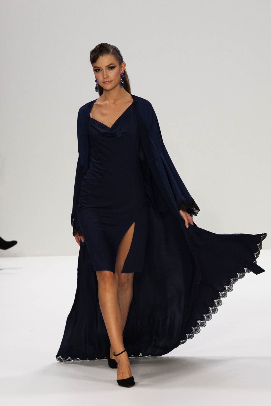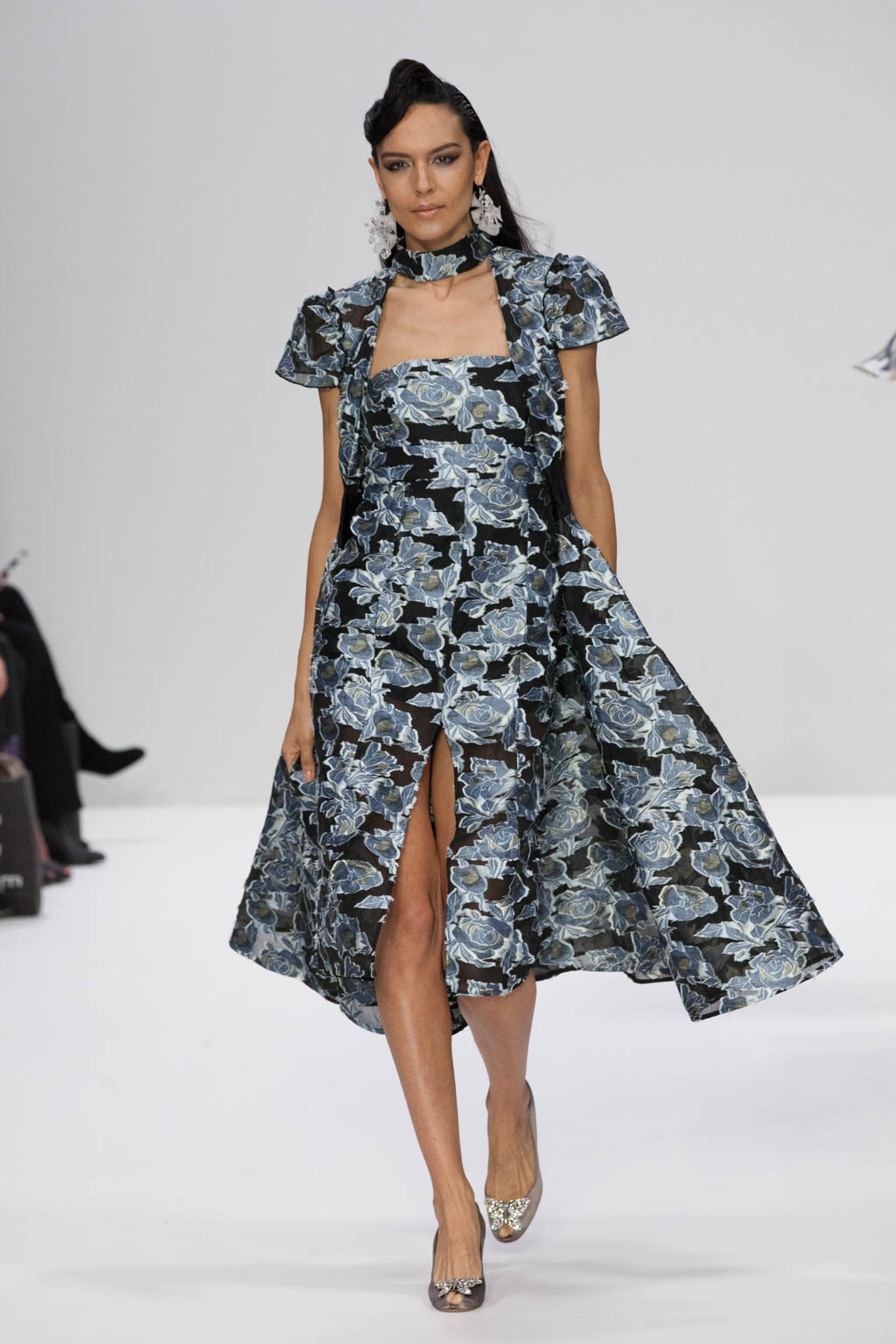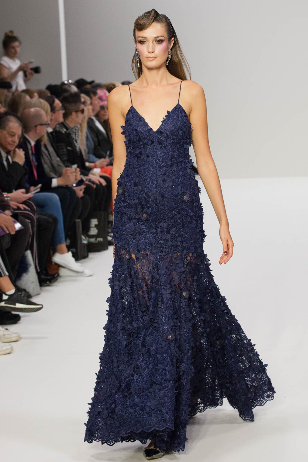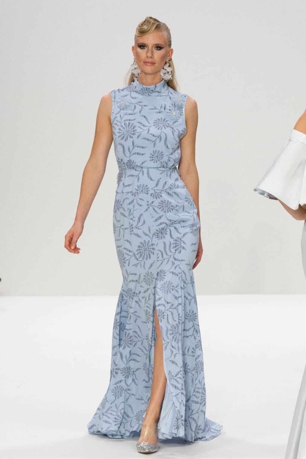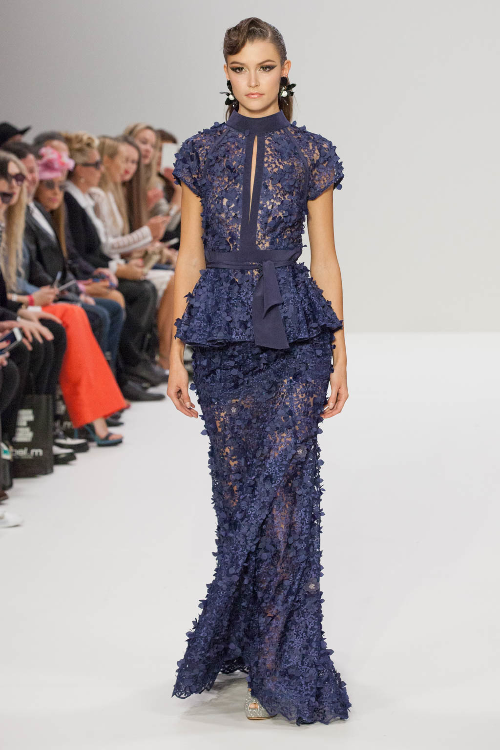 A parade of sweeping gowns in royal and ice blue, murky floral patterns and silver, the Rohmir silhouette was without question absolutely feminine – peplums emphasised the waist, lace clinged to the body and volumes and volumes of fabric created movement in the skirts of dresses.