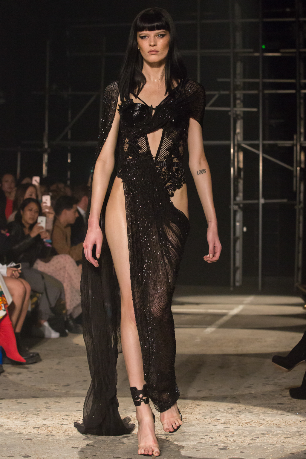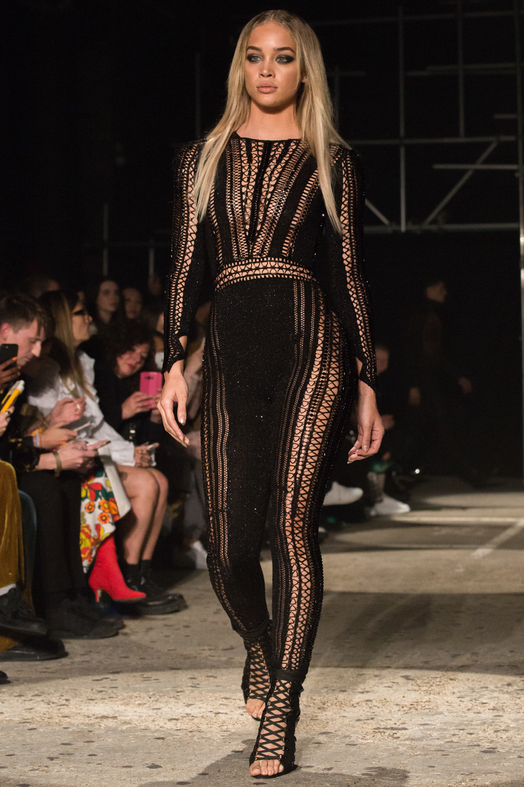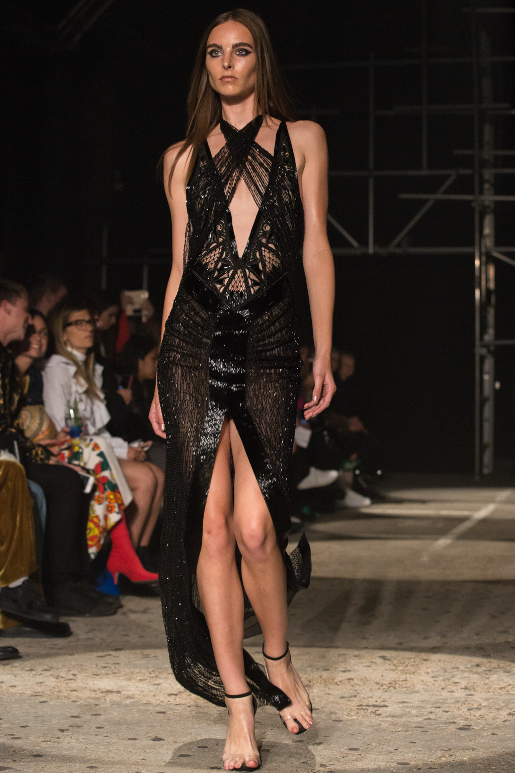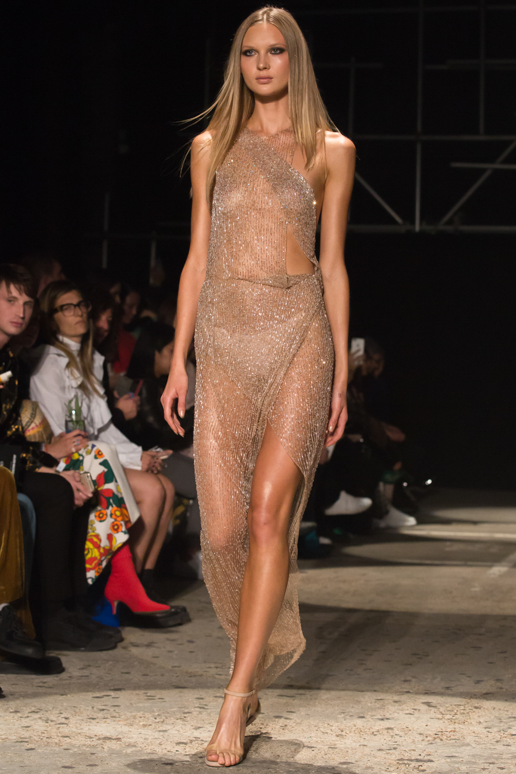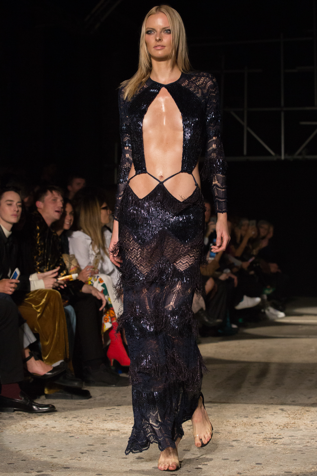 Following the theme of escapism, the collection comprised skin-baring jumpsuits and dresses of varying lengths, often sporting embellishment in the form of ornamental fringing, bugle beads, embroidered lace and crystal mesh. There was a sense of hardness and softness as these figure-hugging silhouettes were contrasted with flowing numbers; both revealing plenty of flesh. Laddered spider knits were also back for spring/summer, with the addition of metallic flecks, while male models wore utilitarian trousers and studded hooded tops.
