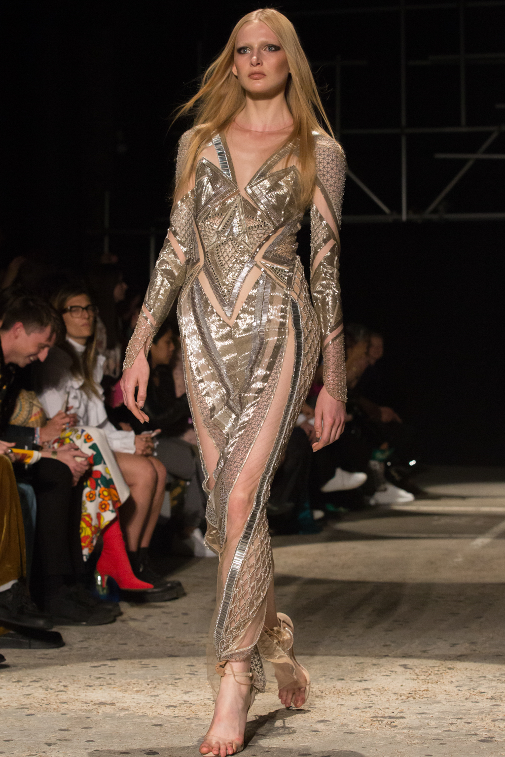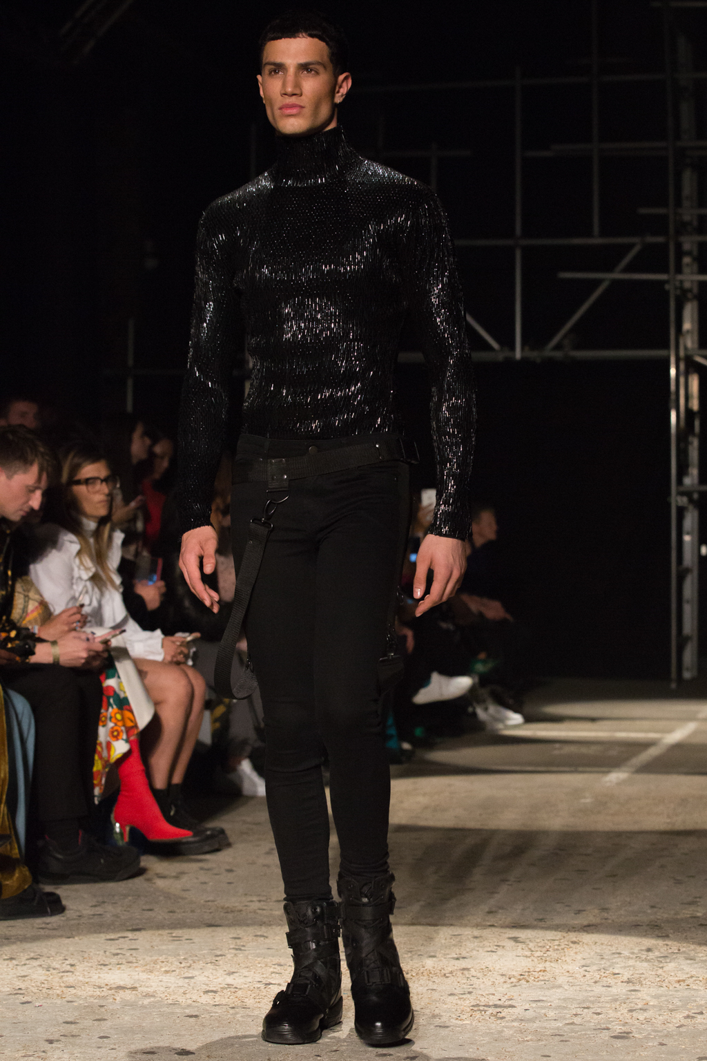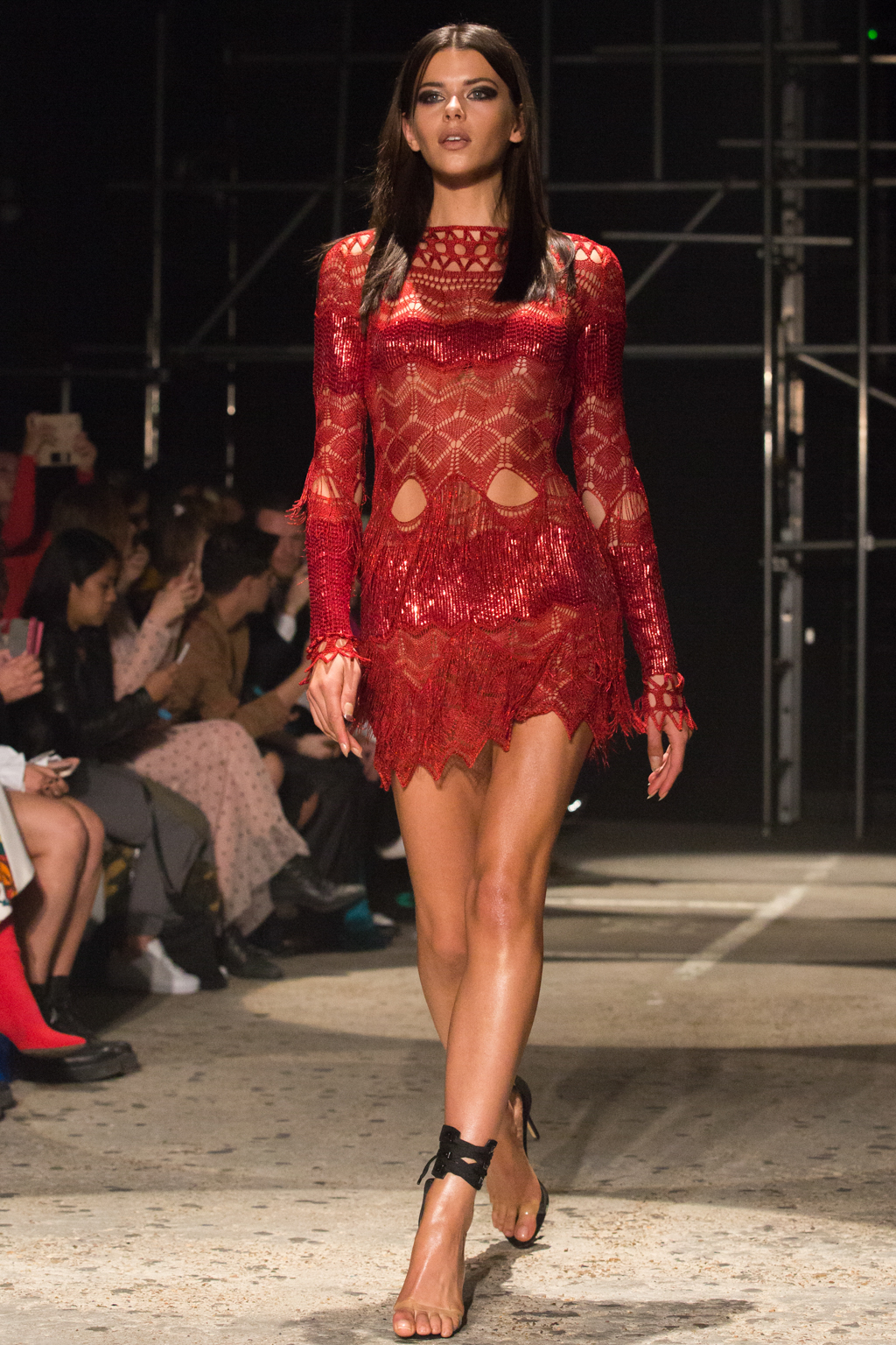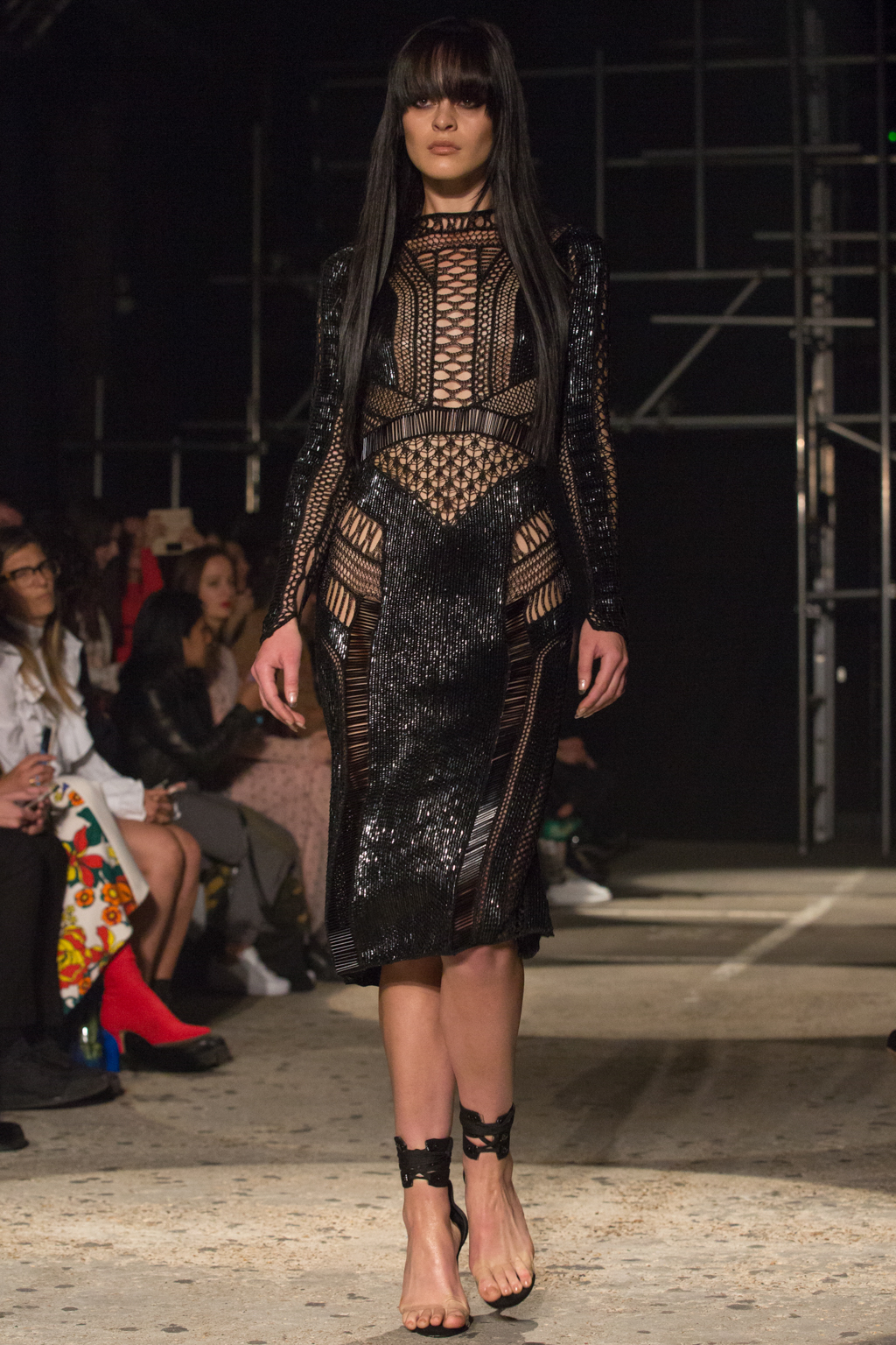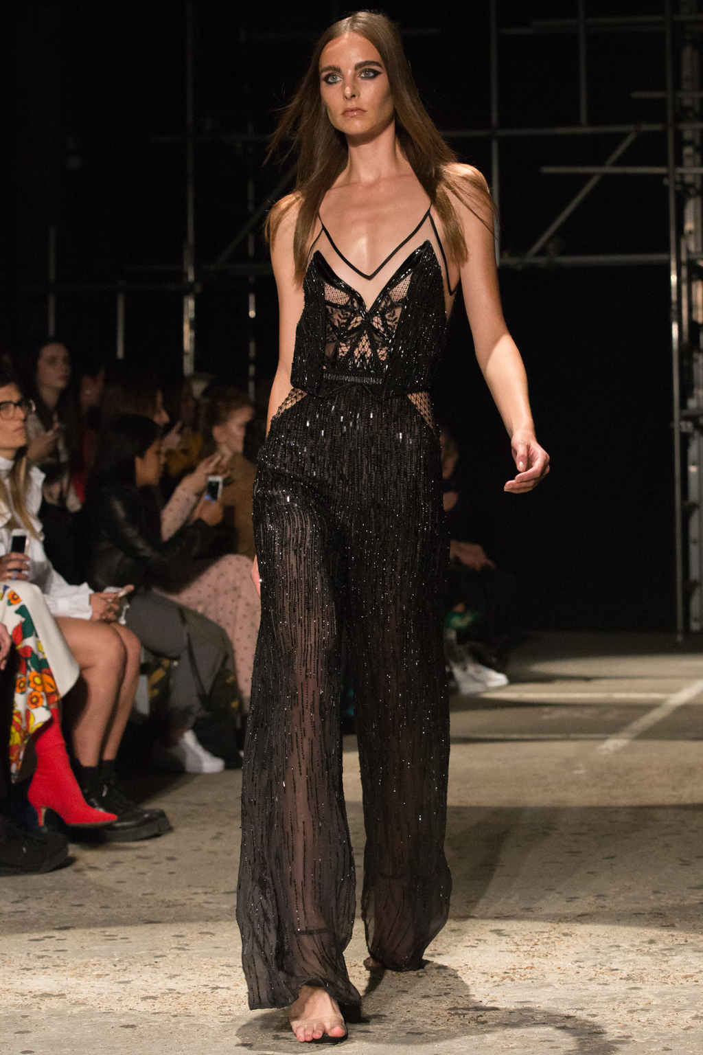 Following the theme of escapism, the collection comprised skin-baring jumpsuits and dresses of varying lengths, often sporting embellishment in the form of ornamental fringing, bugle beads, embroidered lace and crystal mesh. There was a sense of hardness and softness as these figure-hugging silhouettes were contrasted with flowing numbers; both revealing plenty of flesh. Laddered spider knits were also back for spring/summer, with the addition of metallic flecks, while male models wore utilitarian trousers and studded hooded tops.