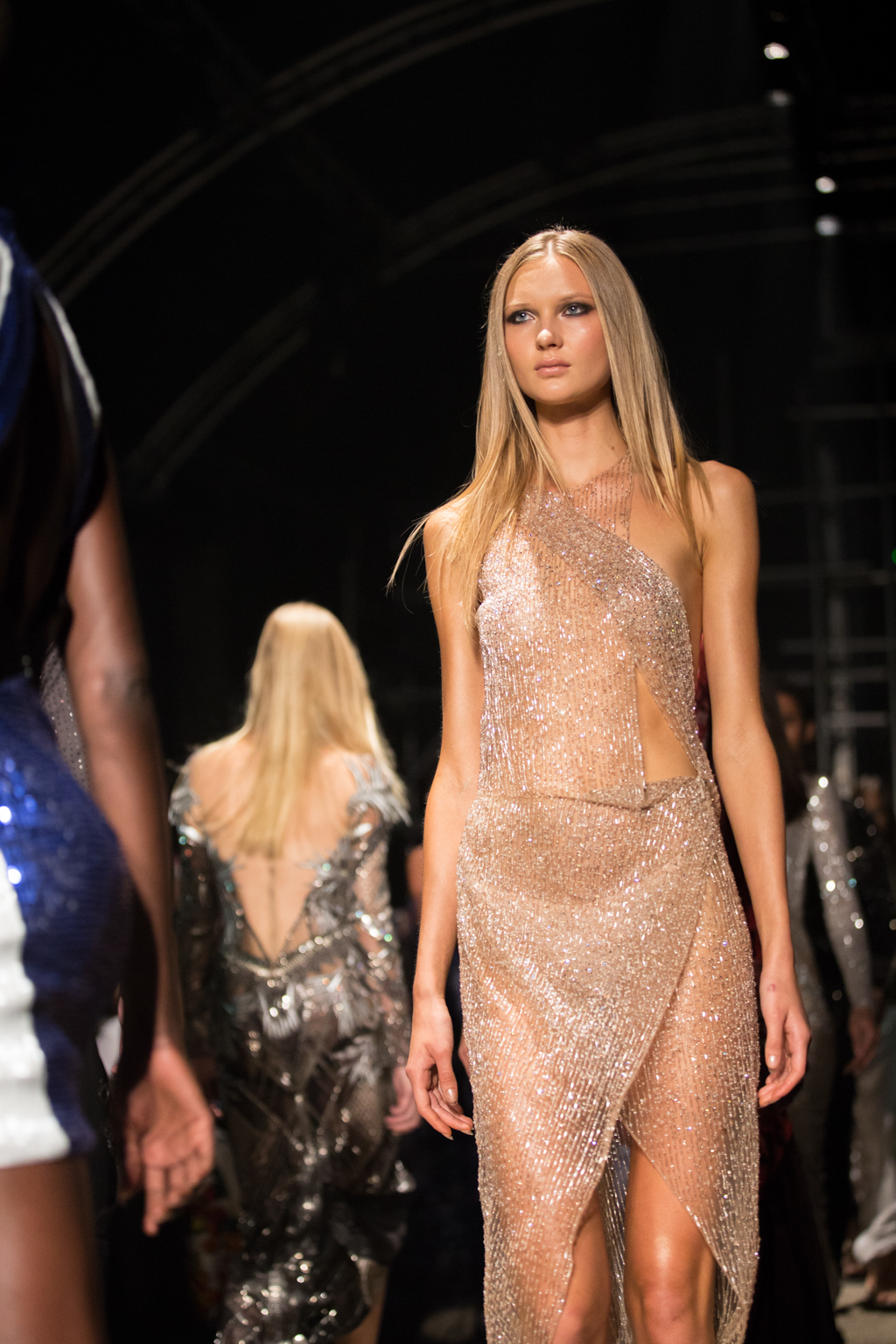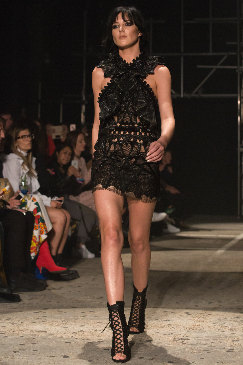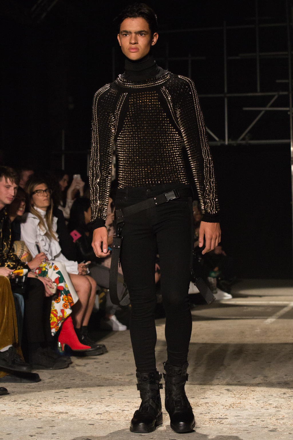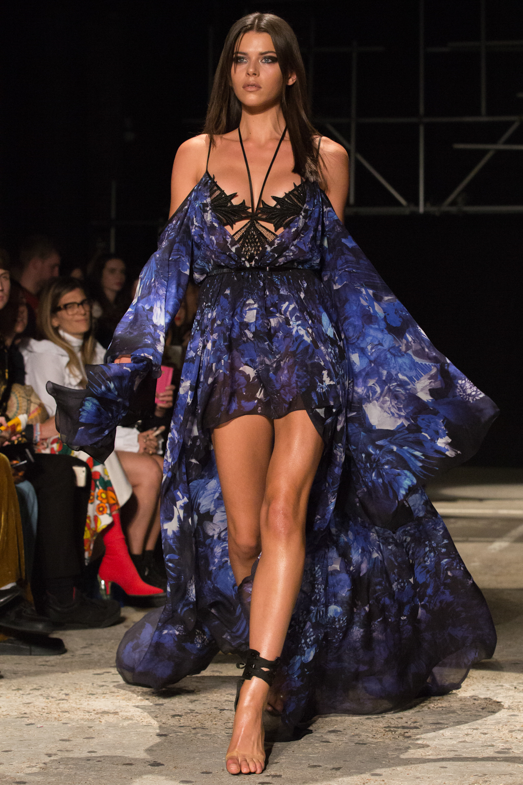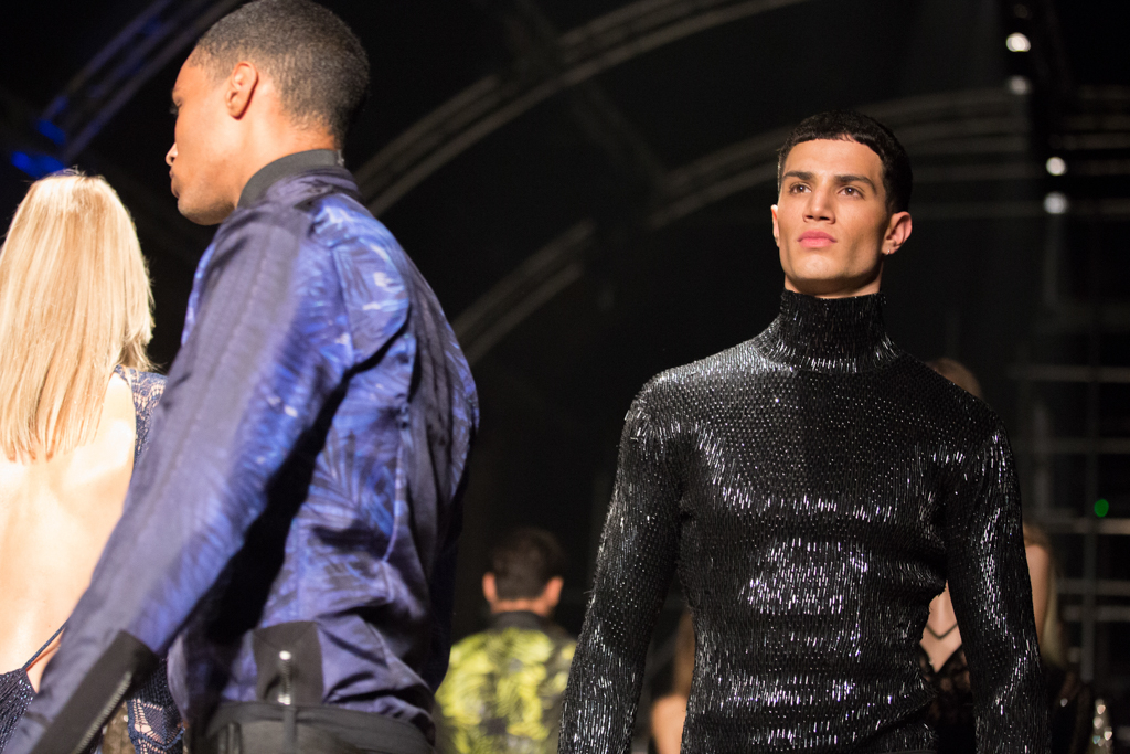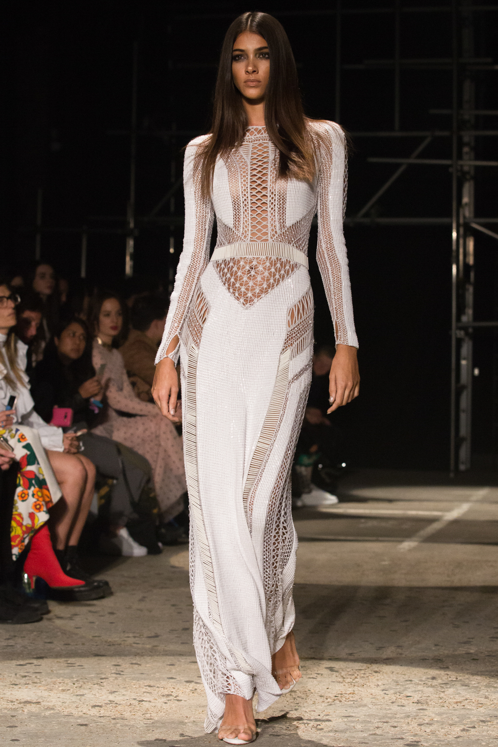 Following the theme of escapism, the collection comprised skin-baring jumpsuits and dresses of varying lengths, often sporting embellishment in the form of ornamental fringing, bugle beads, embroidered lace and crystal mesh. There was a sense of hardness and softness as these figure-hugging silhouettes were contrasted with flowing numbers; both revealing plenty of flesh. Laddered spider knits were also back for spring/summer, with the addition of metallic flecks, while male models wore utilitarian trousers and studded hooded tops.