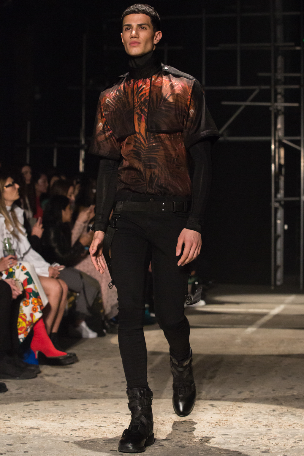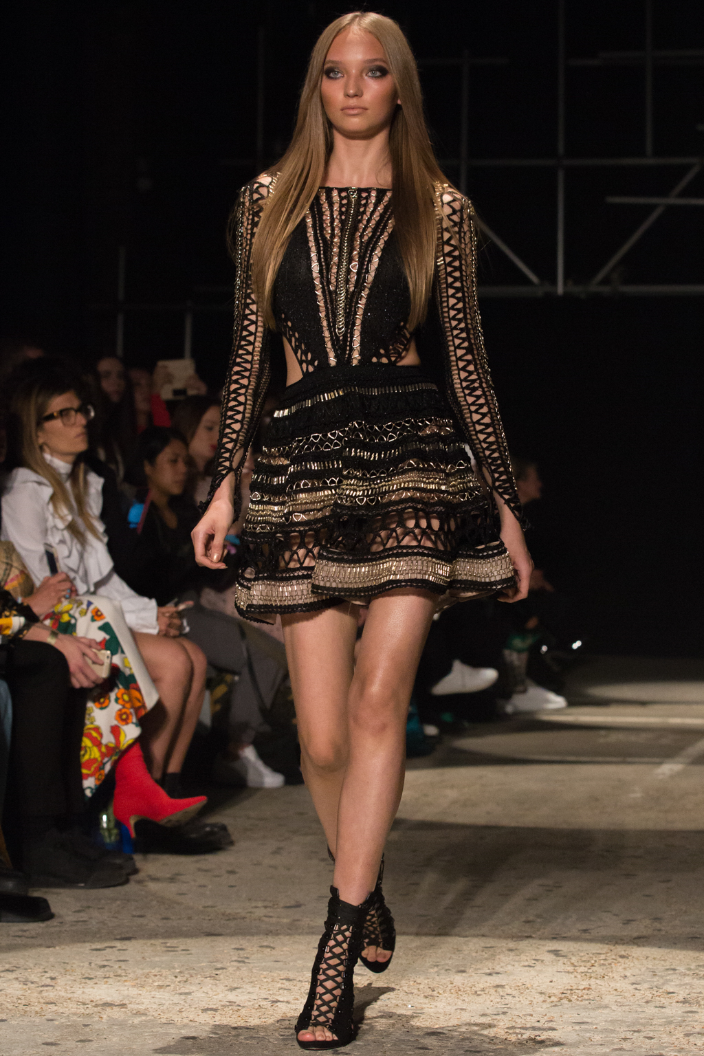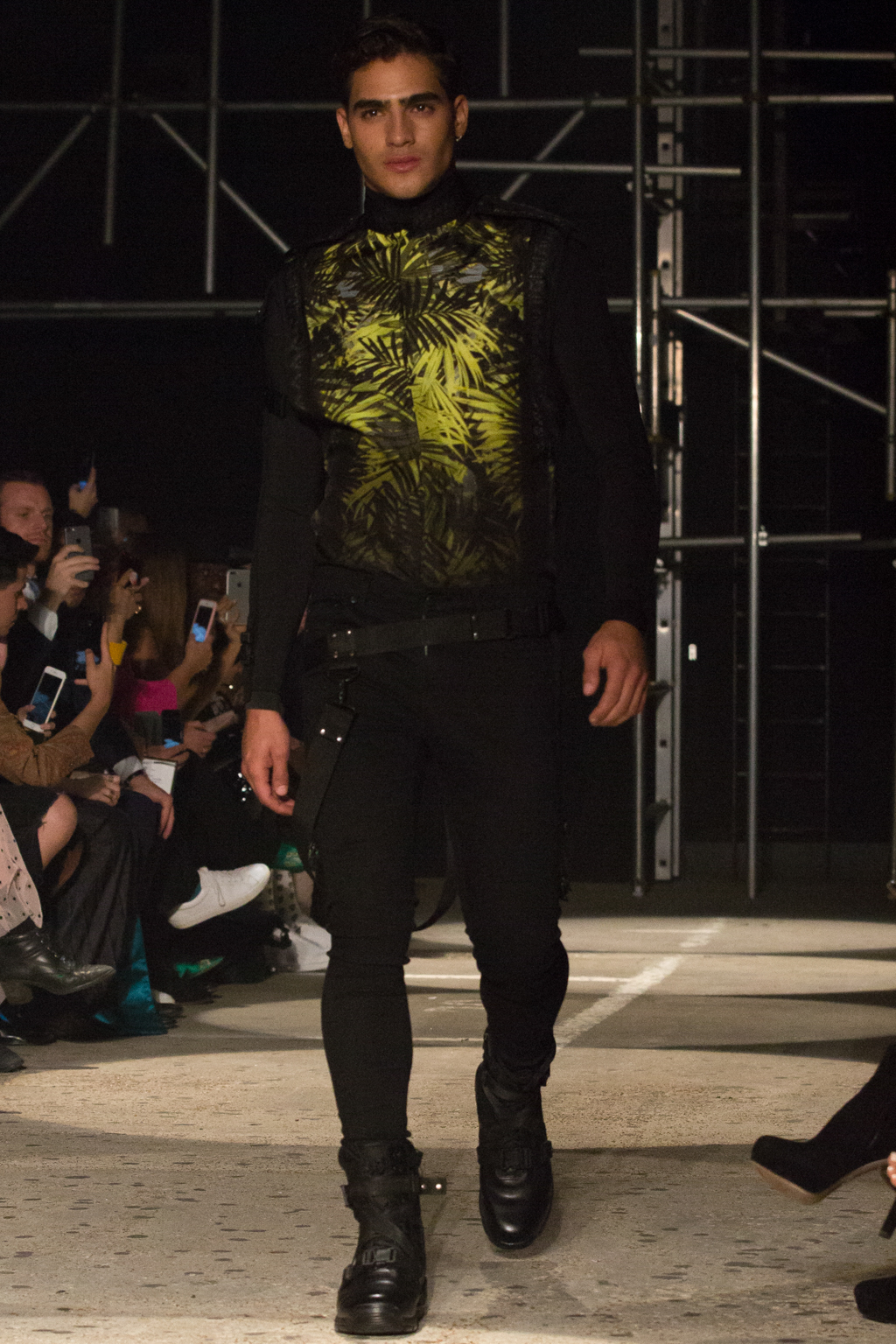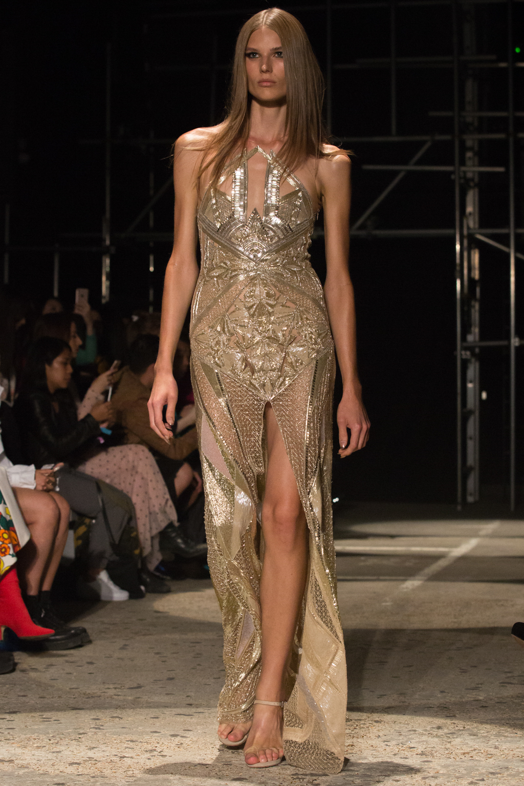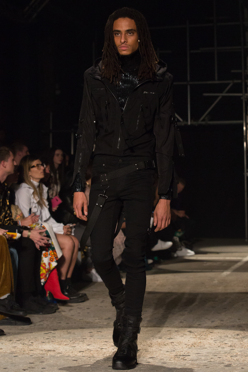 Following the theme of escapism, the collection comprised skin-baring jumpsuits and dresses of varying lengths, often sporting embellishment in the form of ornamental fringing, bugle beads, embroidered lace and crystal mesh. There was a sense of hardness and softness as these figure-hugging silhouettes were contrasted with flowing numbers; both revealing plenty of flesh. Laddered spider knits were also back for spring/summer, with the addition of metallic flecks, while male models wore utilitarian trousers and studded hooded tops.