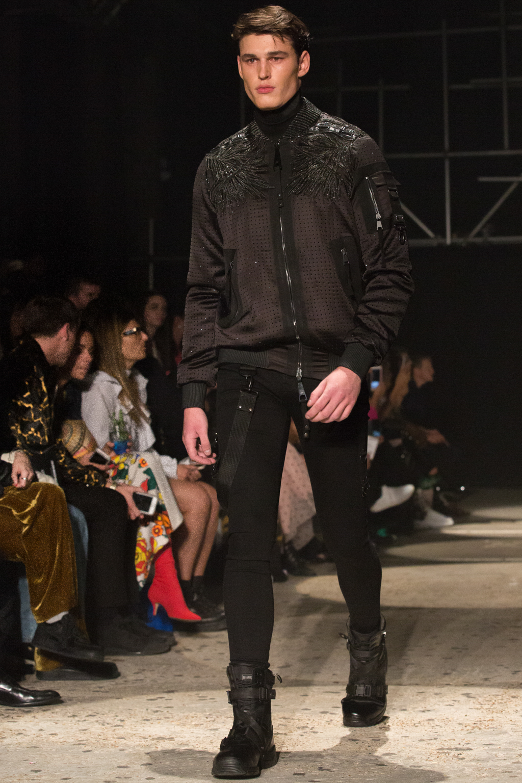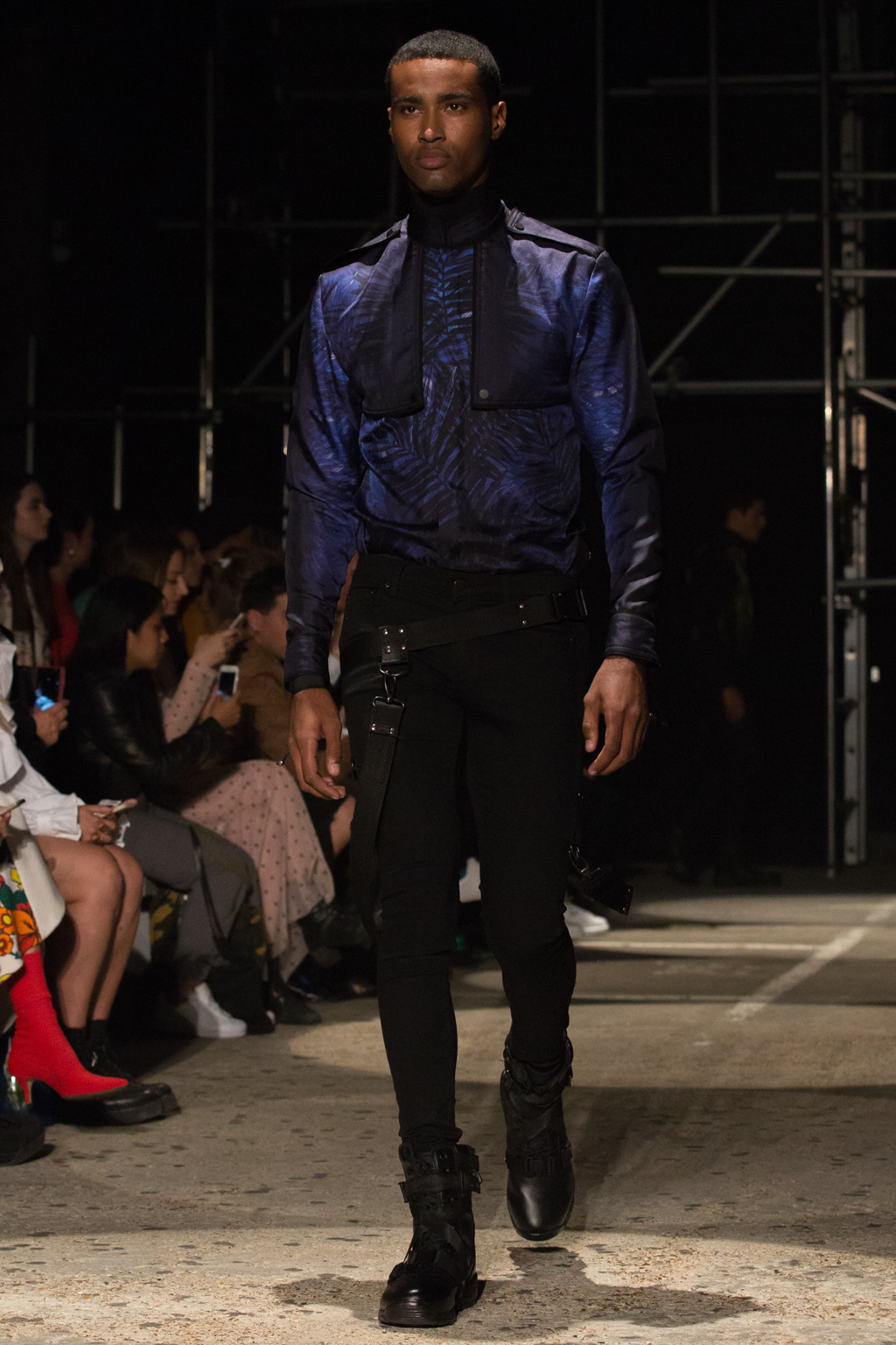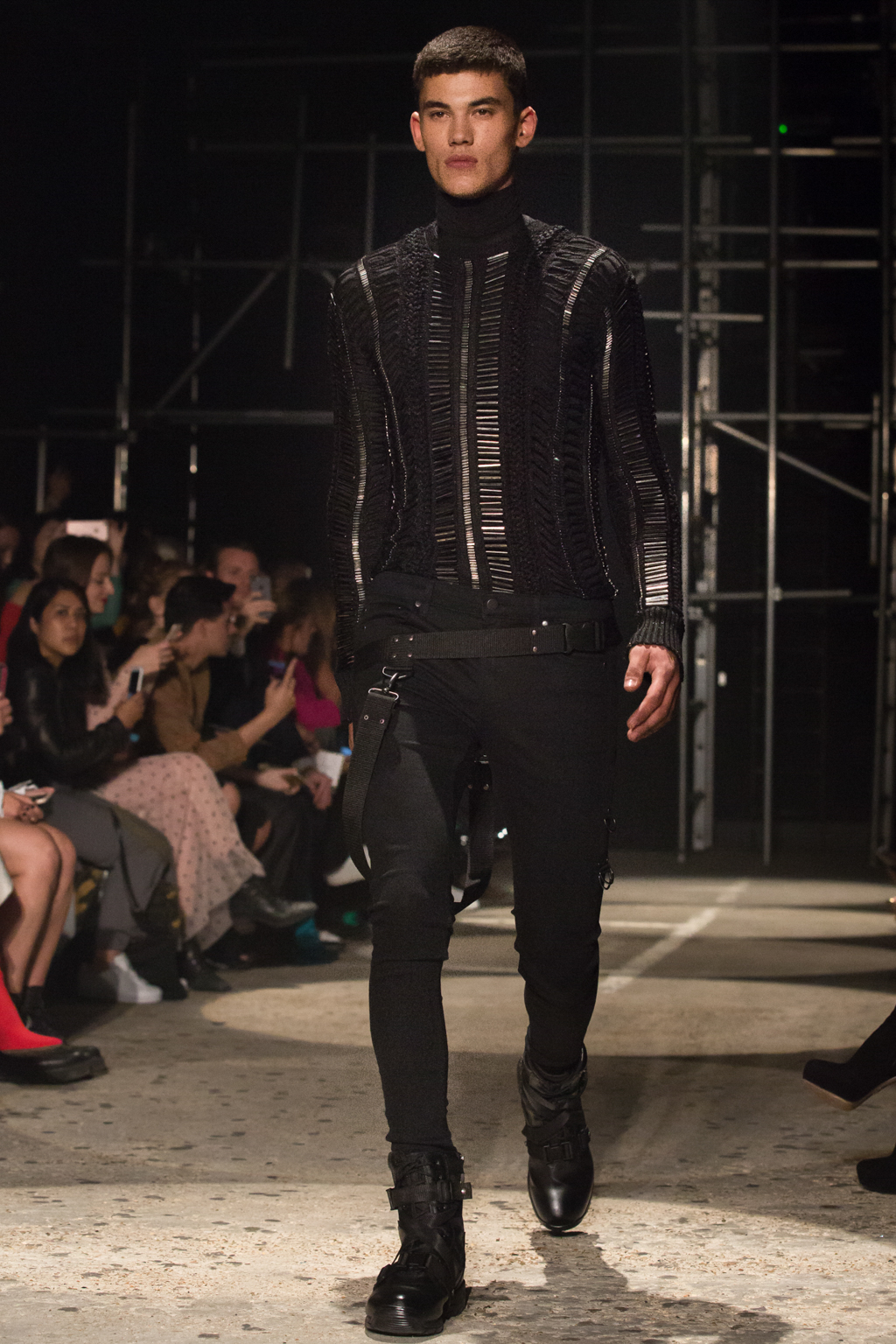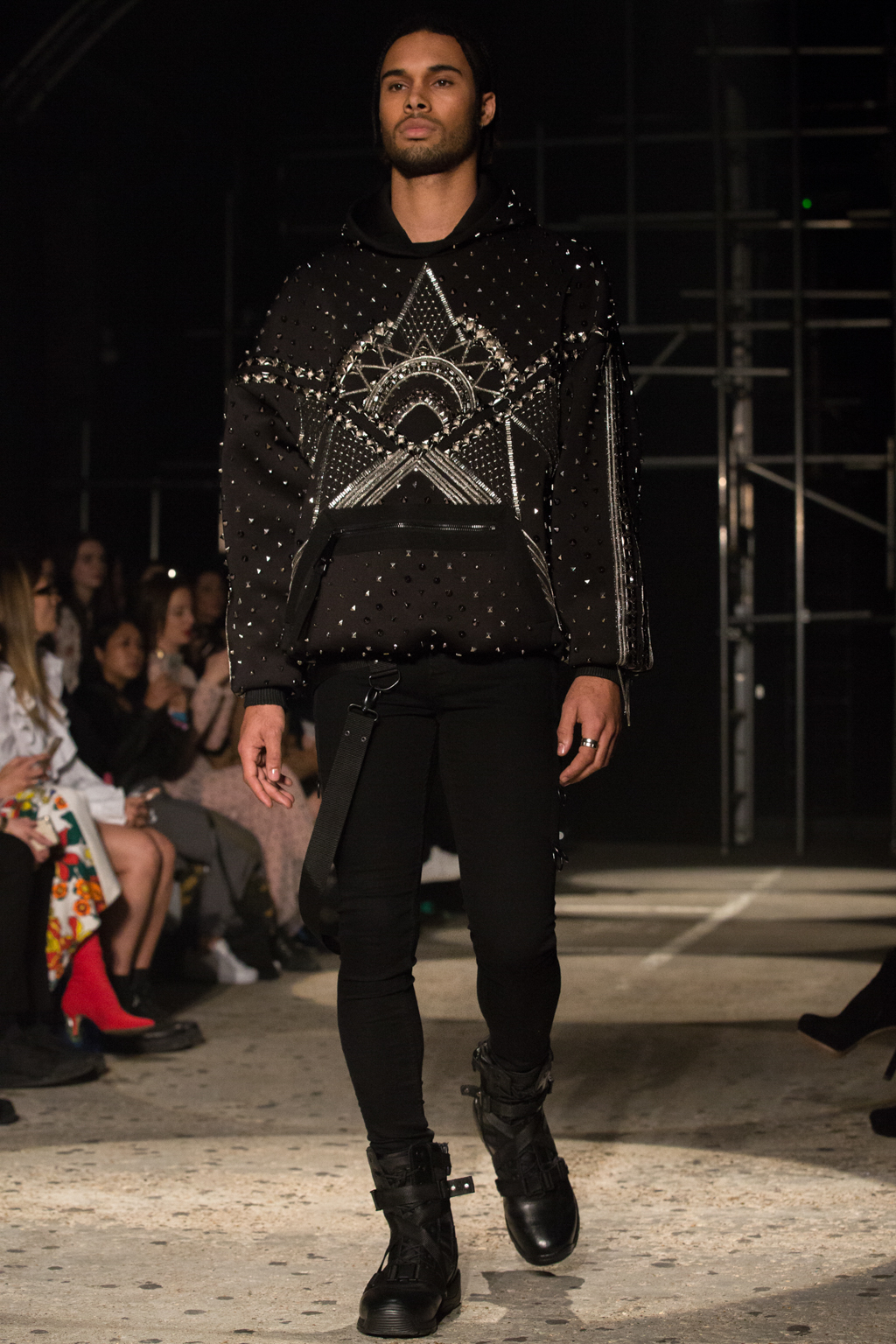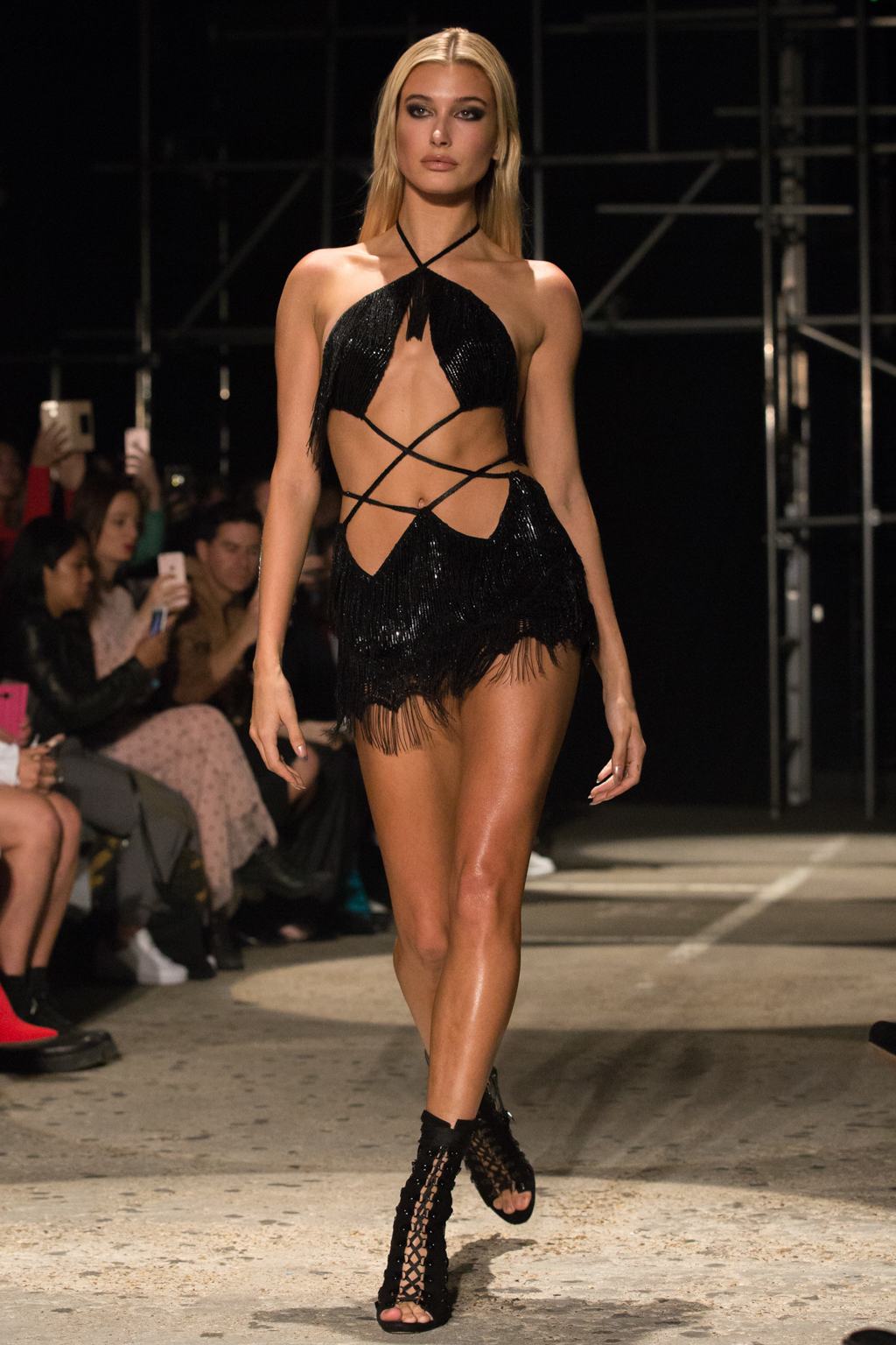 Following the theme of escapism, the collection comprised skin-baring jumpsuits and dresses of varying lengths, often sporting embellishment in the form of ornamental fringing, bugle beads, embroidered lace and crystal mesh. There was a sense of hardness and softness as these figure-hugging silhouettes were contrasted with flowing numbers; both revealing plenty of flesh. Laddered spider knits were also back for spring/summer, with the addition of metallic flecks, while male models wore utilitarian trousers and studded hooded tops.