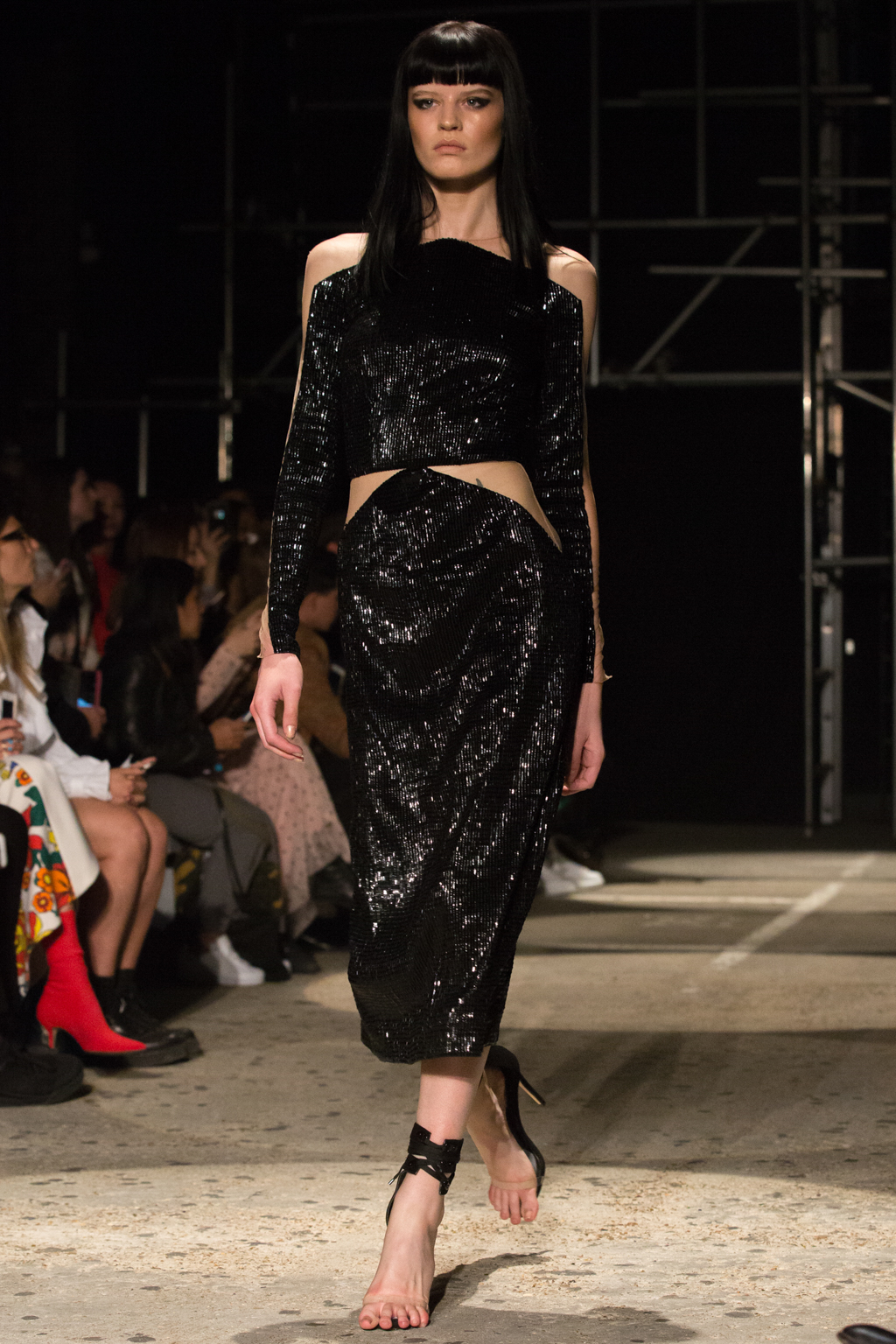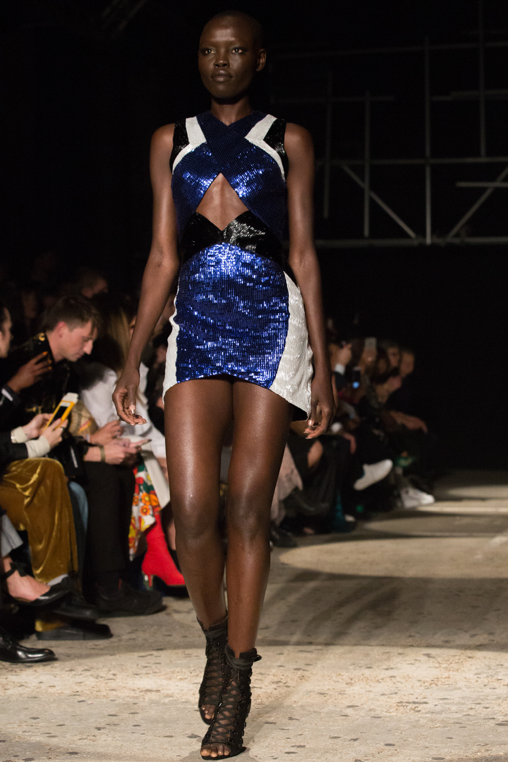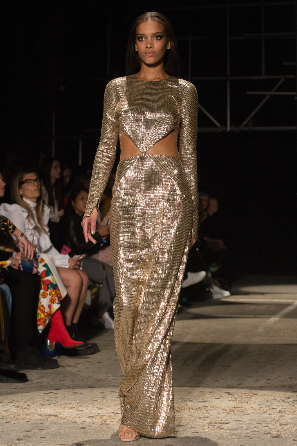 No 1 Invicta Plaza seemed to be a perfect setting for the Welsh designer, who is admired for his risqué eveningwear and glamorous aesthetic. Colourful laser beams and a pulsating soundtrack accompanied models as they marched down the runway in a series of signature bodycon ensembles, often featuring cut-out detailing and sparkling embellishment, ensuring onlookers were in the party spirit.