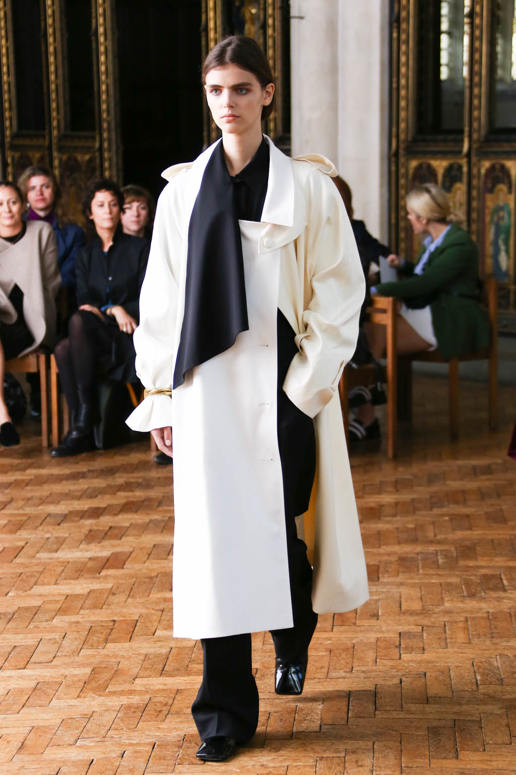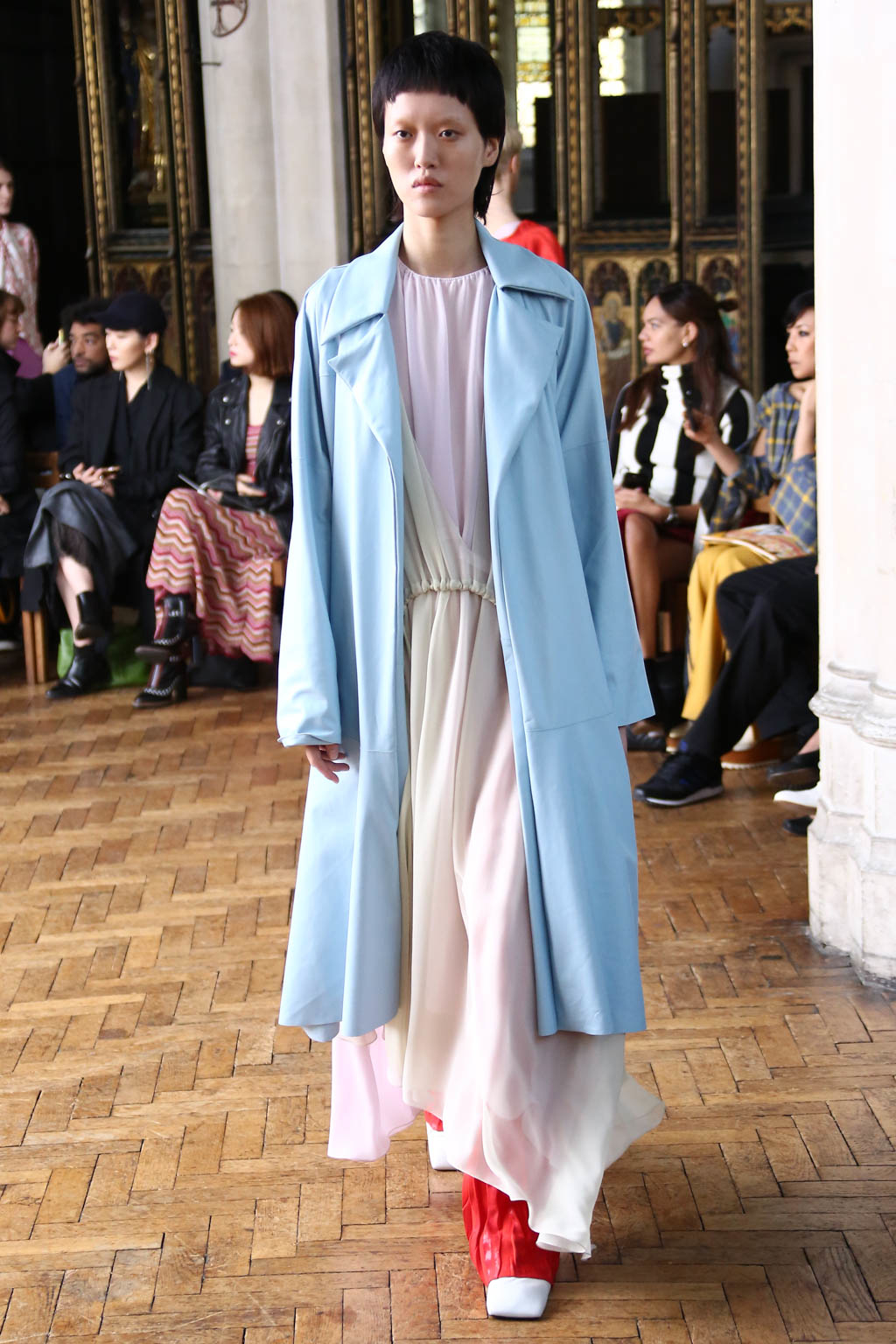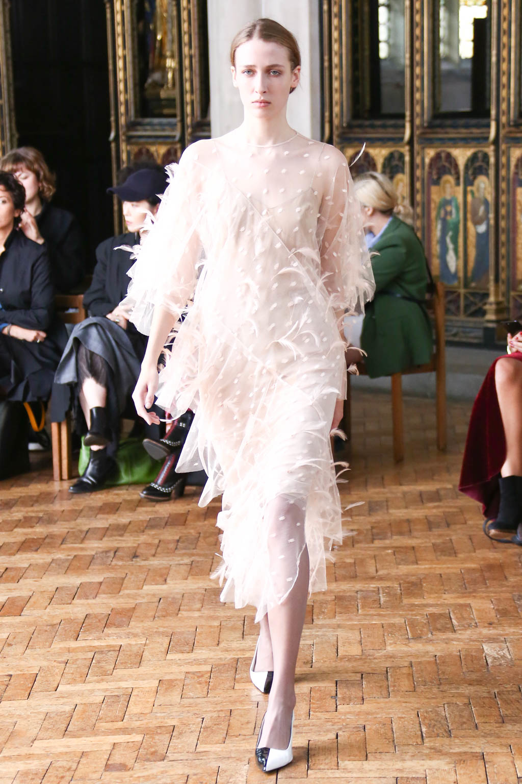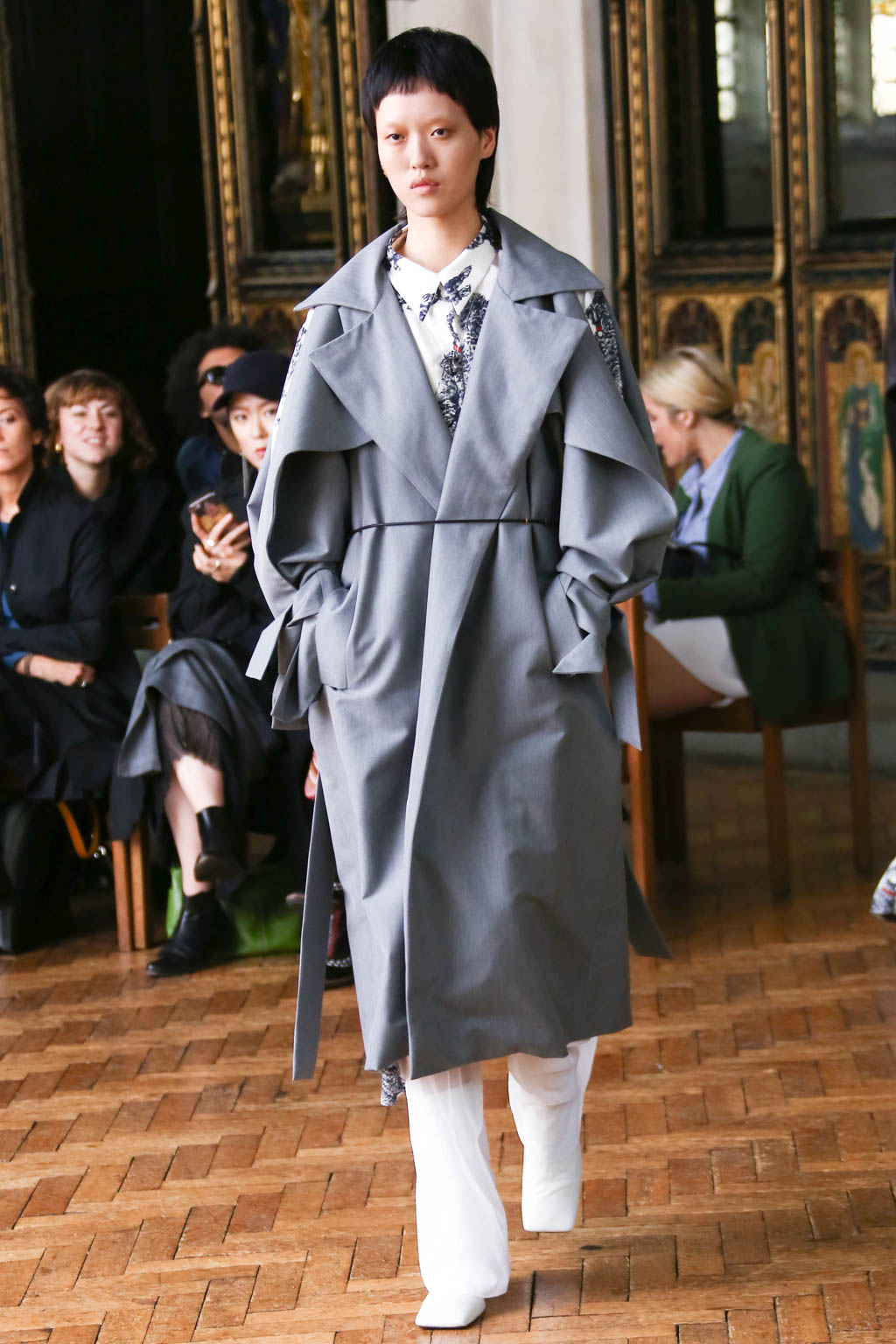Sharon once again showed at a resplendent church setting like the past two seasons. Breezing through the circular runway were loosely structured overcoats and softly sculpted sling dresses with feathers accents. The relaxed silhouettes were like the miracle sleepy lotion, almost immediately exuding a sense no-fuss comfort that is needed to beat the blistering summer heat.